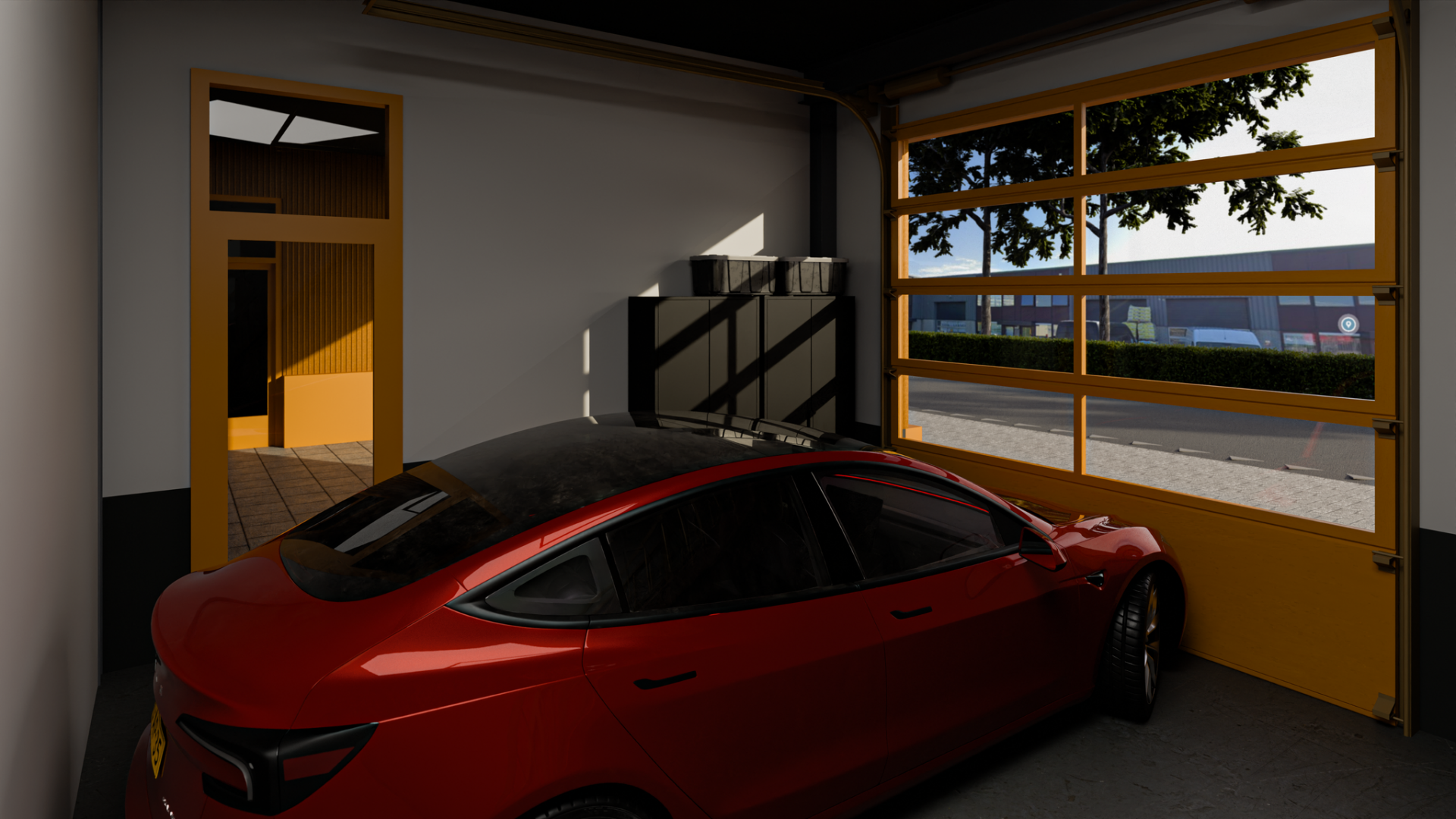 - elektrisch bedienbare overheaddeur met loopdeur (doorrijhoogte ca. 3.11 m1 en doorrijbreedte 3.00 m1);