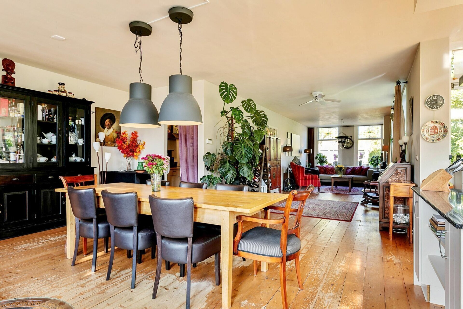 De royale woonkamer is voorzien van een houten afwerkvloer en een sfeervolle gezellige houtkachel. De raampartijen zijn grotendeels voorzien van dubbel glas en glas- in lood facetten. De ruimte wordt verwarmd door middel van radiatoren en vloerverwarming.