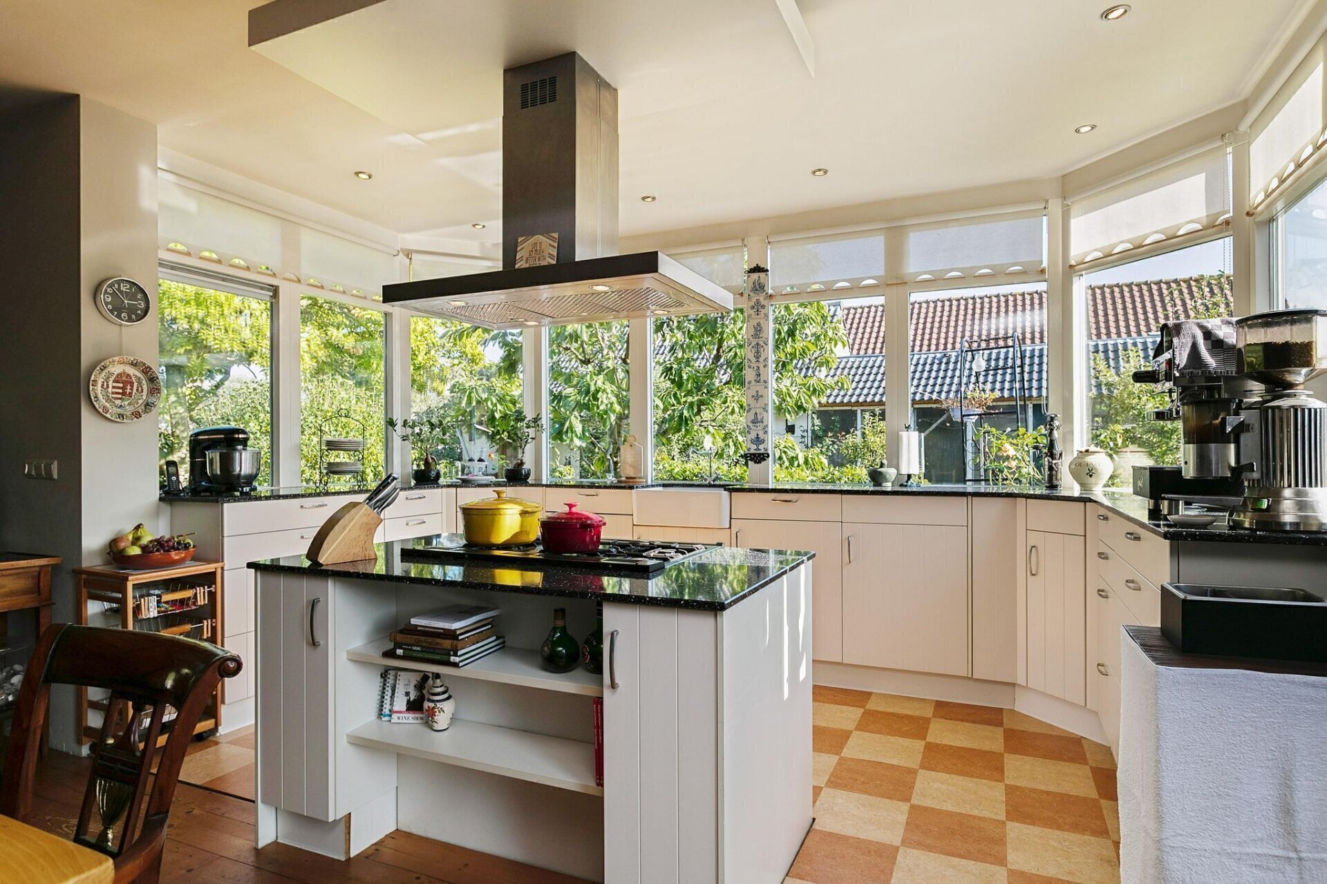 De keuken is voorzien van verschillende inbouwapparatuur, keramieken gootsteen, koelkast en vaatwasser. Het kookeiland is voorzien van een Falcon oven, 5 pits gasfornuis en afzuigkap.
