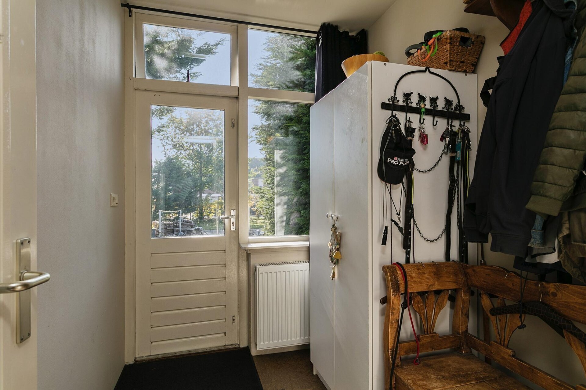 Imposante intreden met veel originele details zoals het “Melkmeisjes kozijn” met origineel glas in lood, het trappenhuis welk u toegang geeft nar de etage en tot de ruimtes op de begane grond. woning waaronder het toilet, de kelder en woonkamer.