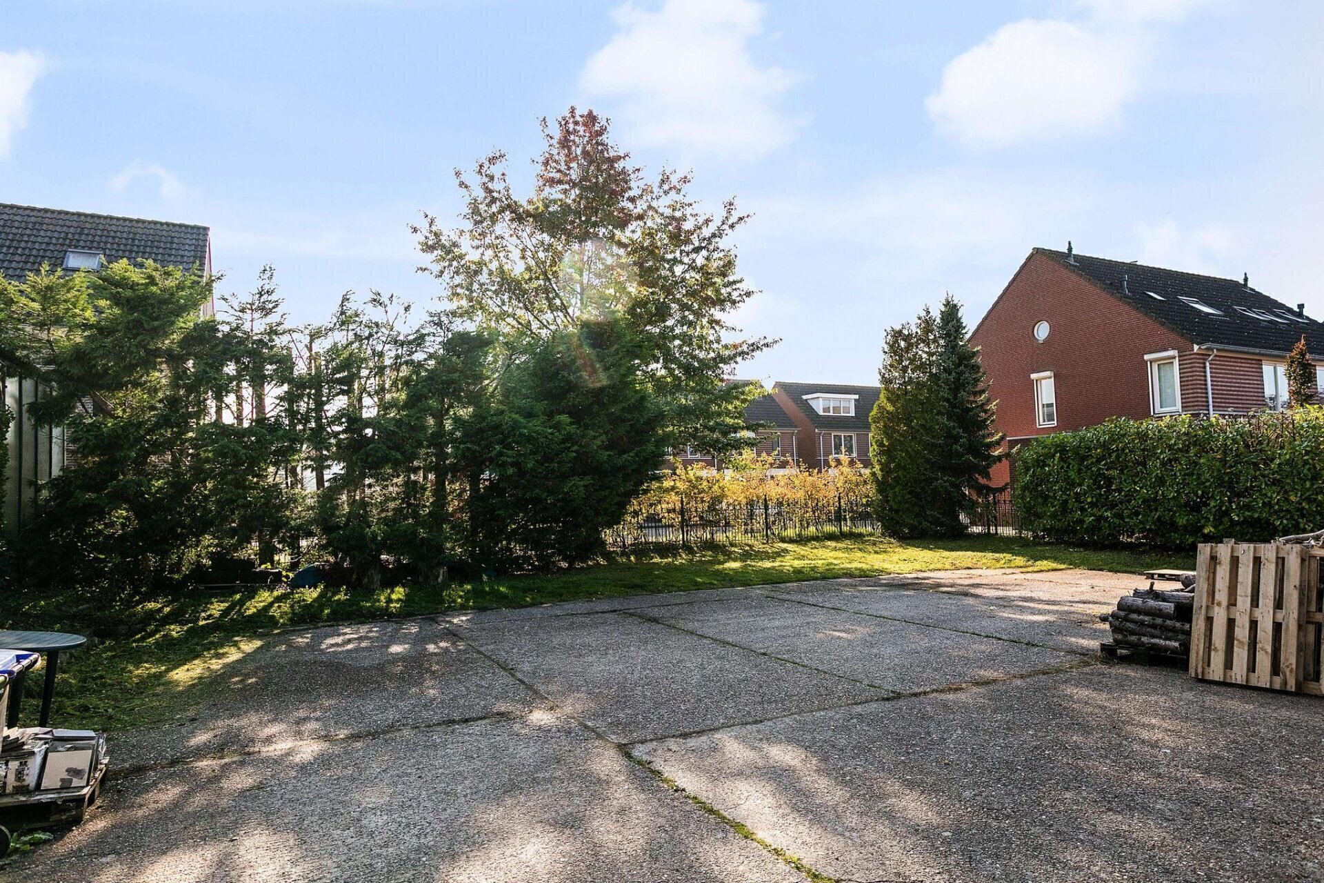 Het achterste gedeelte van het erf is ingelegd met beton tegels en heeft nu enkel een opslag/parkeer functie.