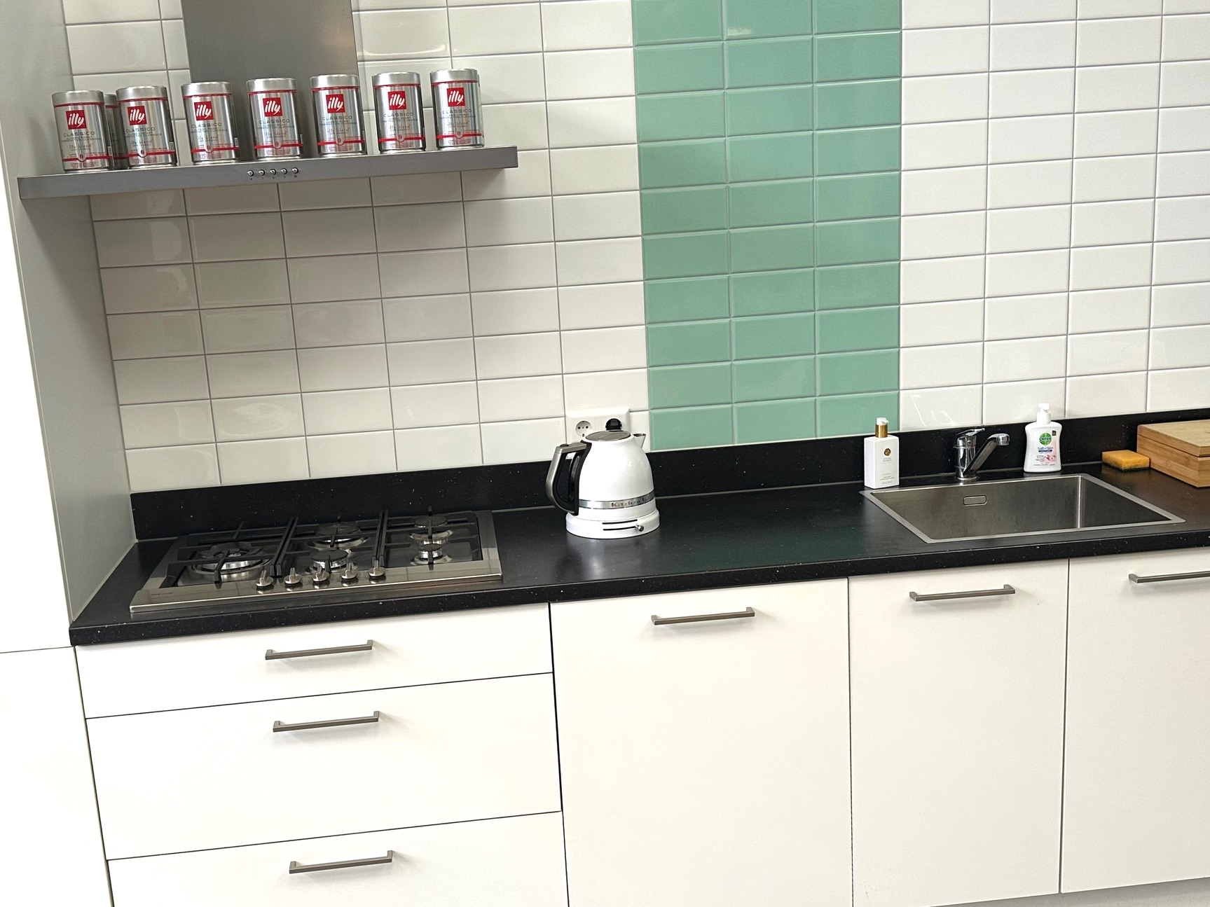 Keuken + apparatuur (koelkast met aparte vriezer, combi-oven, vaatwasser, kookunit met afzuigkap)