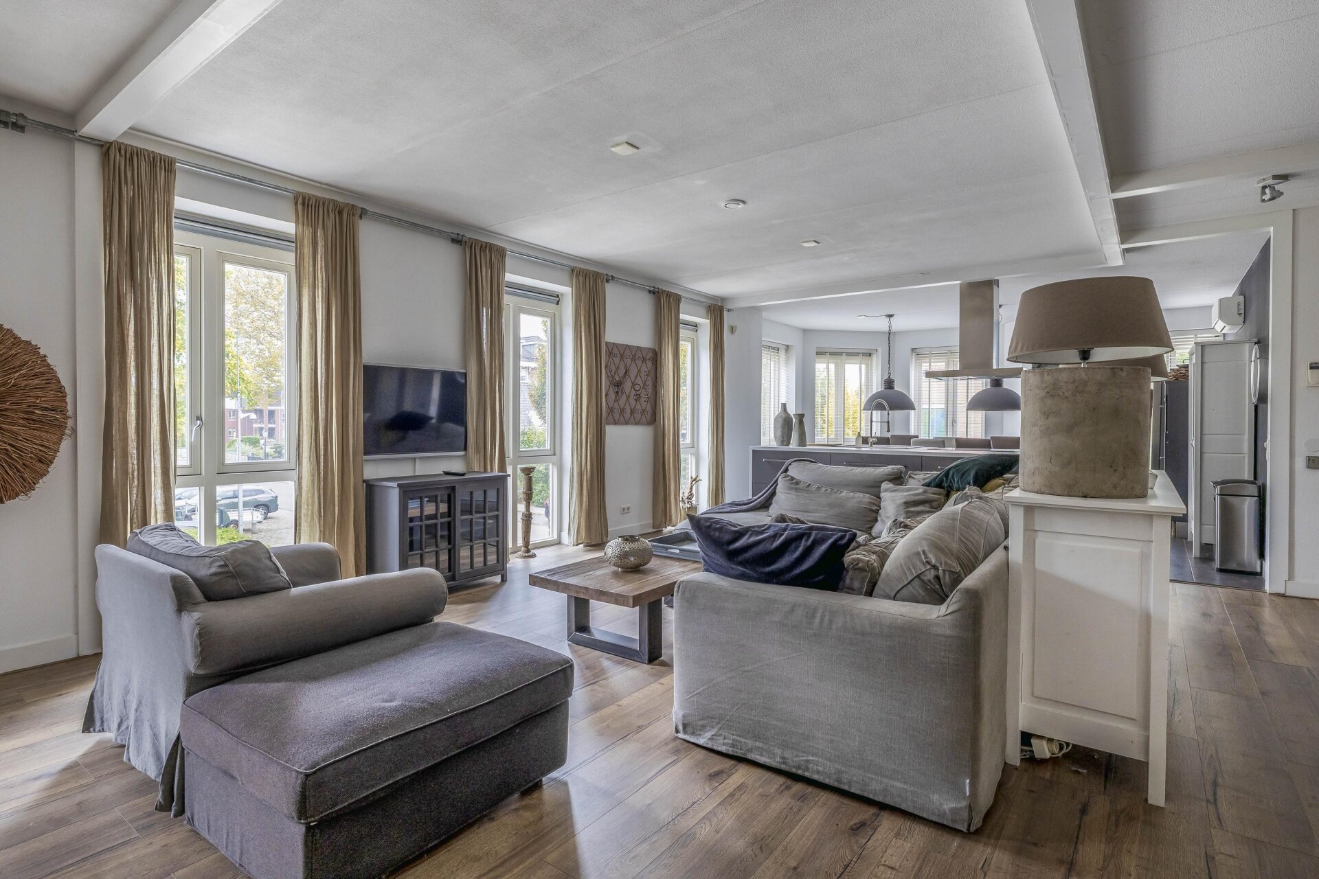 - woonkamer met openkeuken (elektrische kookplaat, vaarwasser, oven en koelkast)