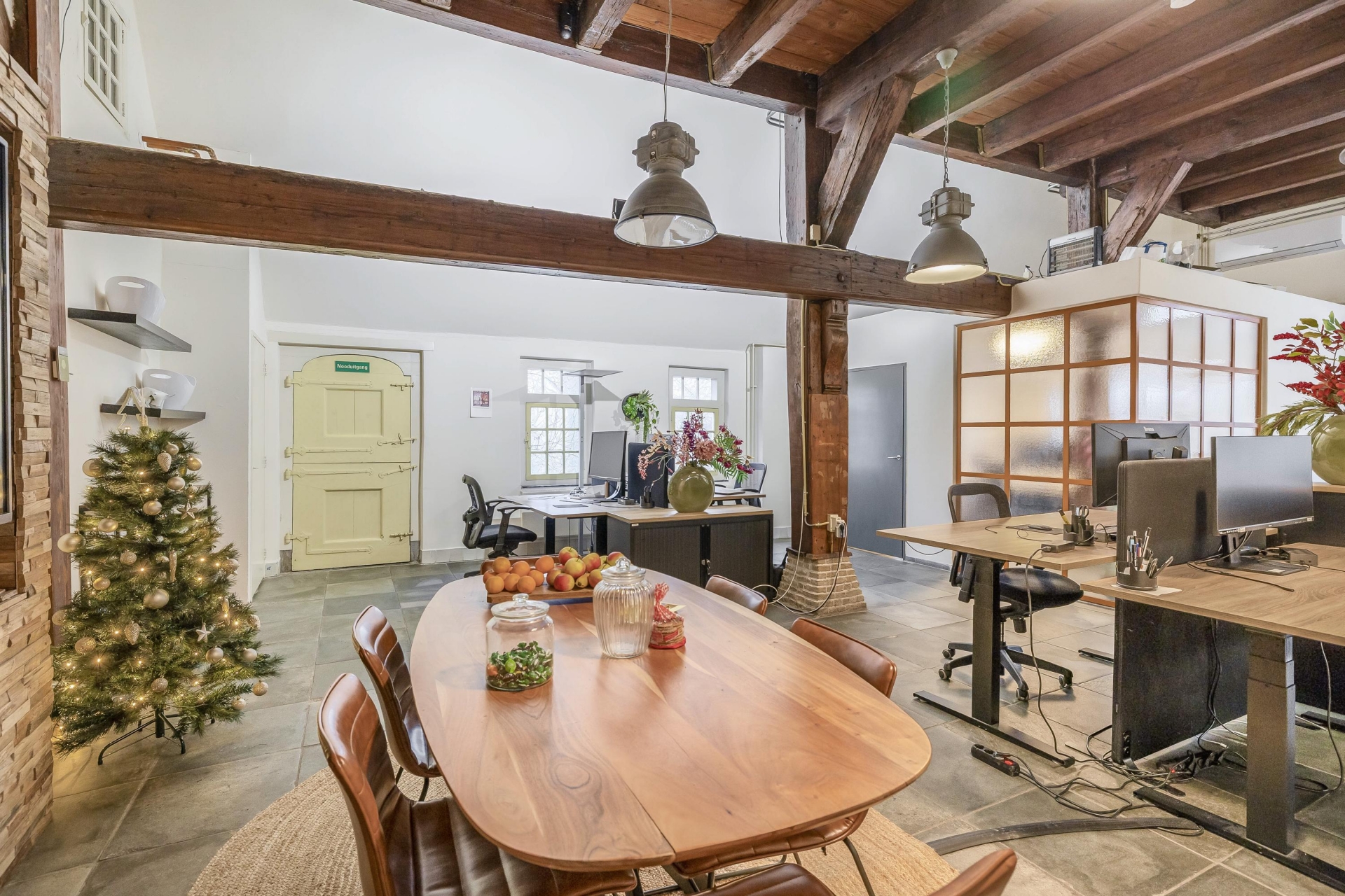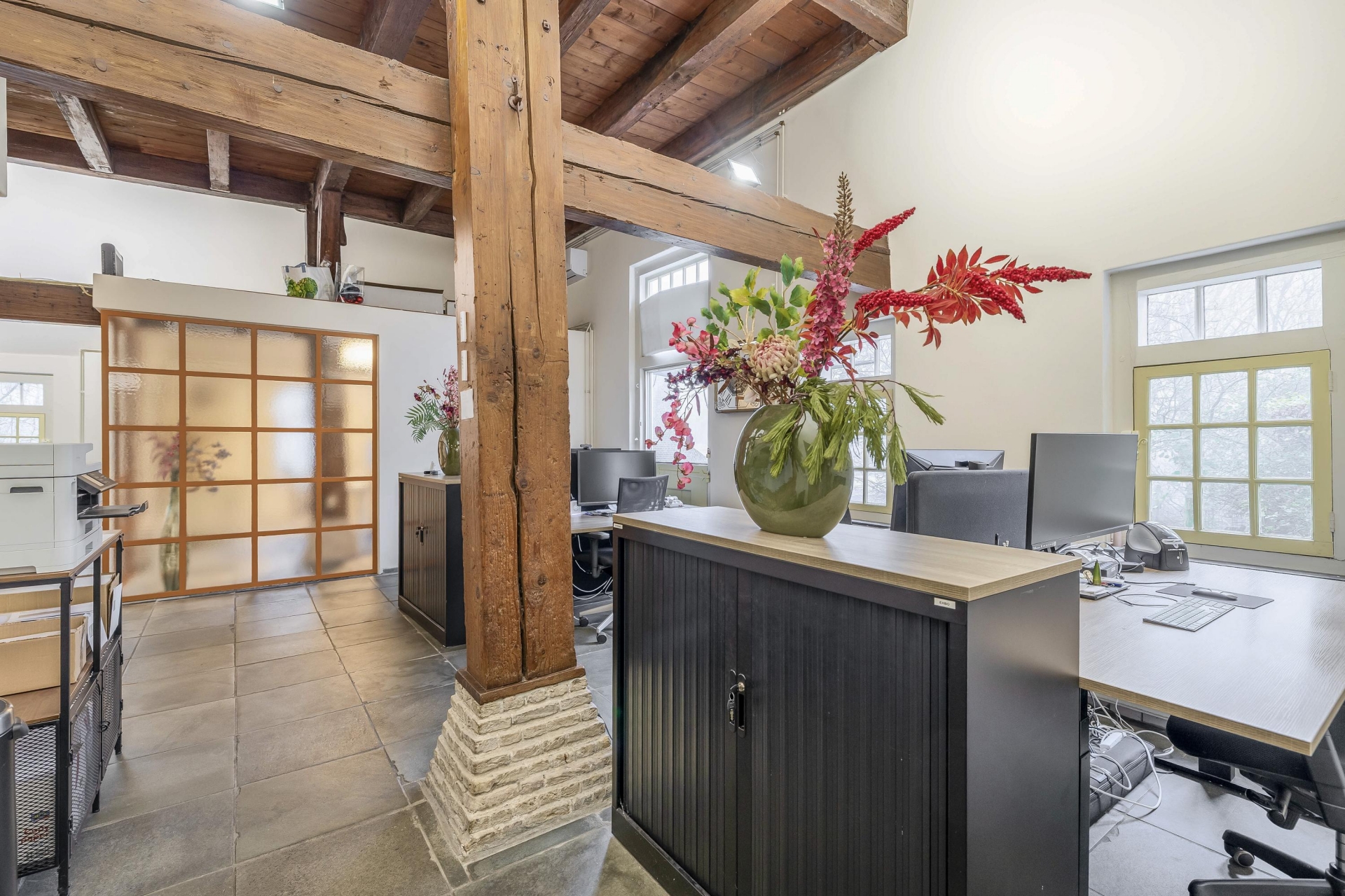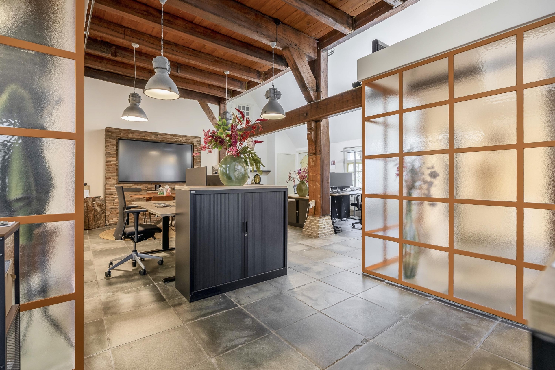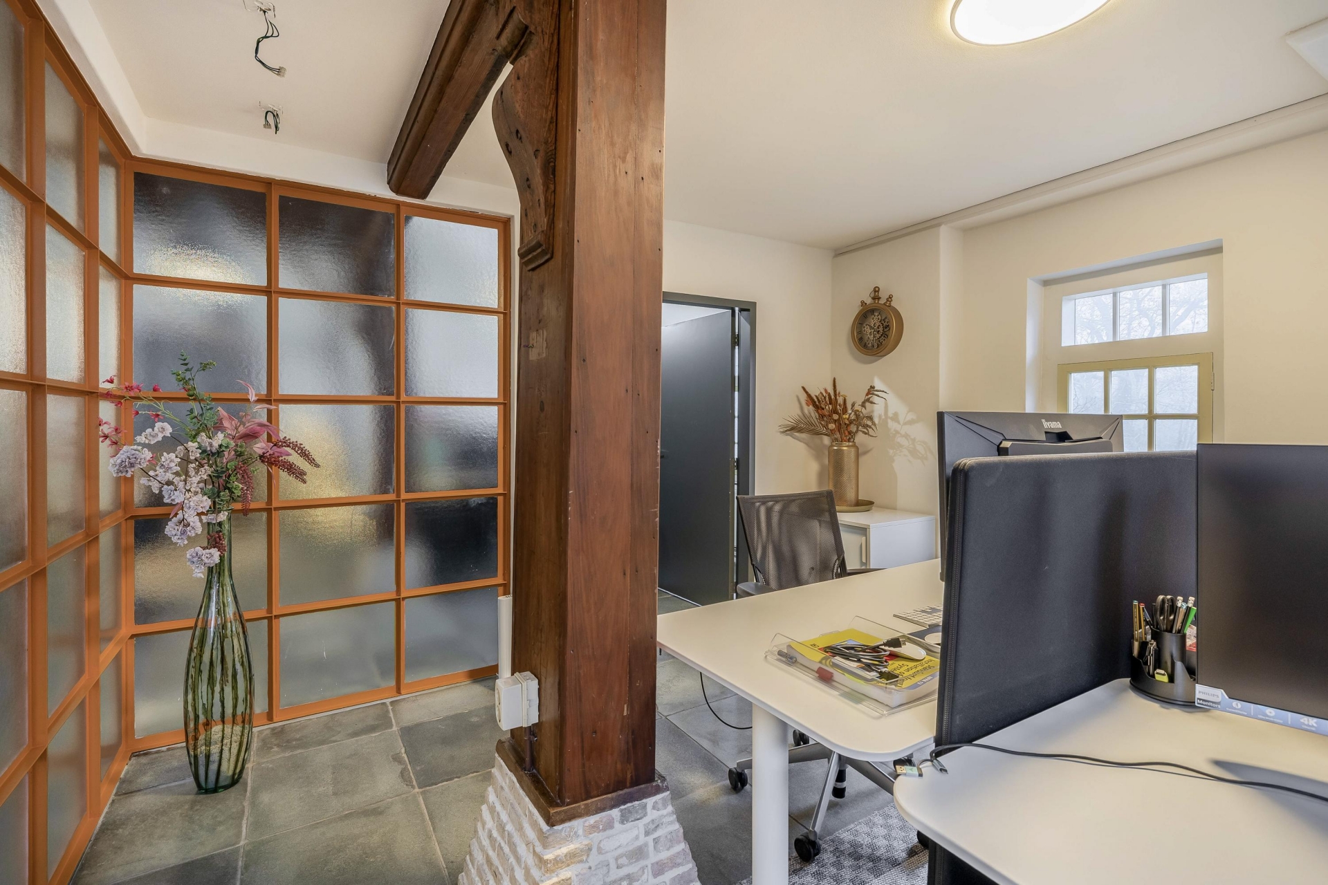 Via de gezamenlijke entree kom je binnen in een nette ontvangstruimte met kitchenette en dames- én herentoilet (gezamenlijk gebruik). Vanuit hier loop je door naar een lichte kantoorruimte van ca. 76 m², geschikt voor meerdere werkplekken. De ruimte beschikt over vloerverwarming, bijverwarming via radiatoren, airco en een warmtepomp. Het hoge plafond met originele balken en het uitzicht op de achtergelegen tuin zorgen voor een prettige en rustige werkomgeving.