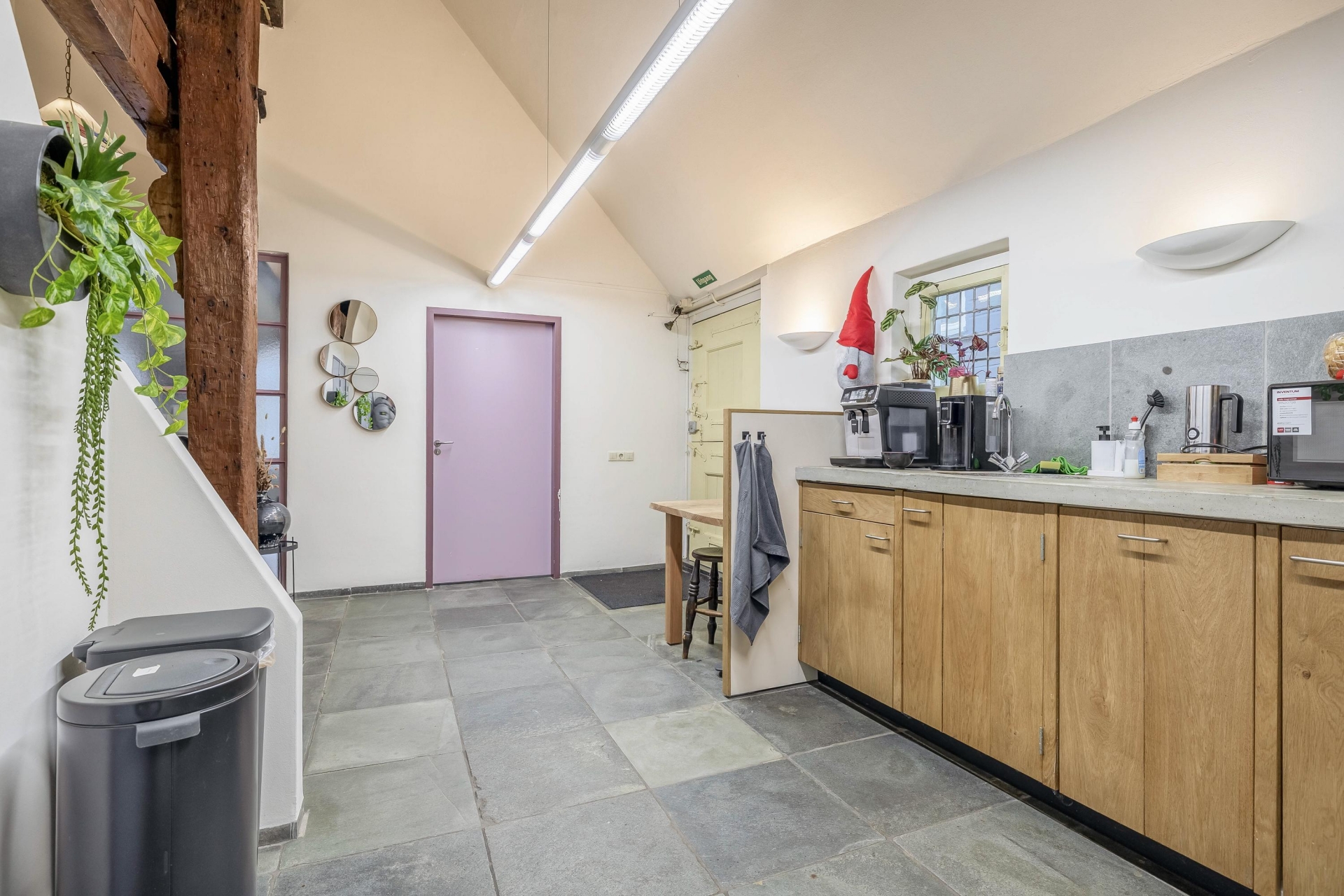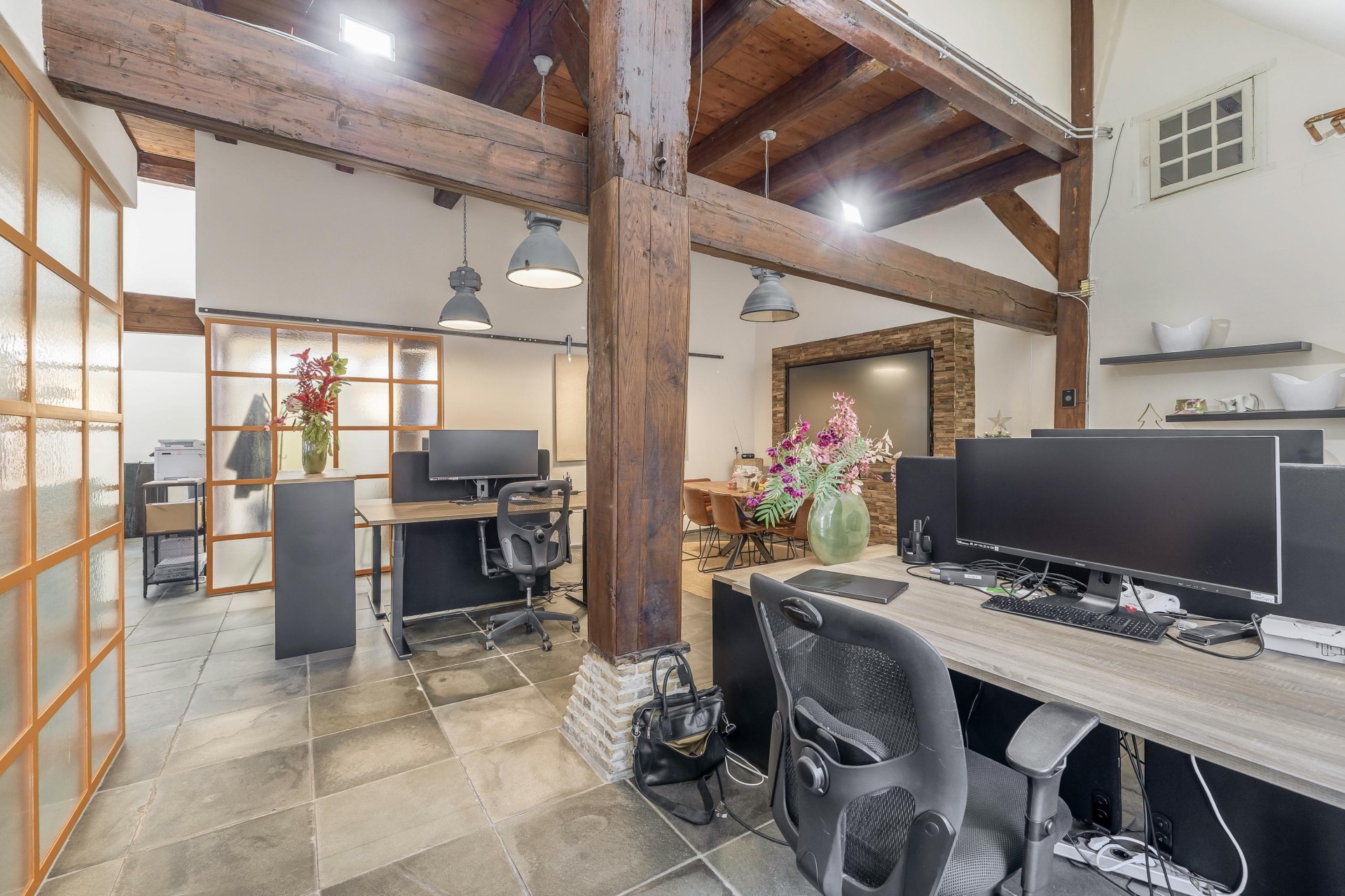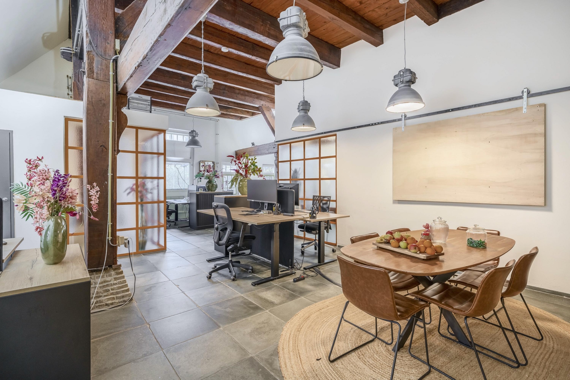 Via de gezamenlijke entree kom je binnen in een nette ontvangstruimte met kitchenette en dames- én herentoilet (gezamenlijk gebruik). Vanuit hier loop je door naar een lichte kantoorruimte van ca. 76 m², geschikt voor meerdere werkplekken. De ruimte beschikt over vloerverwarming, bijverwarming via radiatoren, airco en een warmtepomp. Het hoge plafond met originele balken en het uitzicht op de achtergelegen tuin zorgen voor een prettige en rustige werkomgeving.