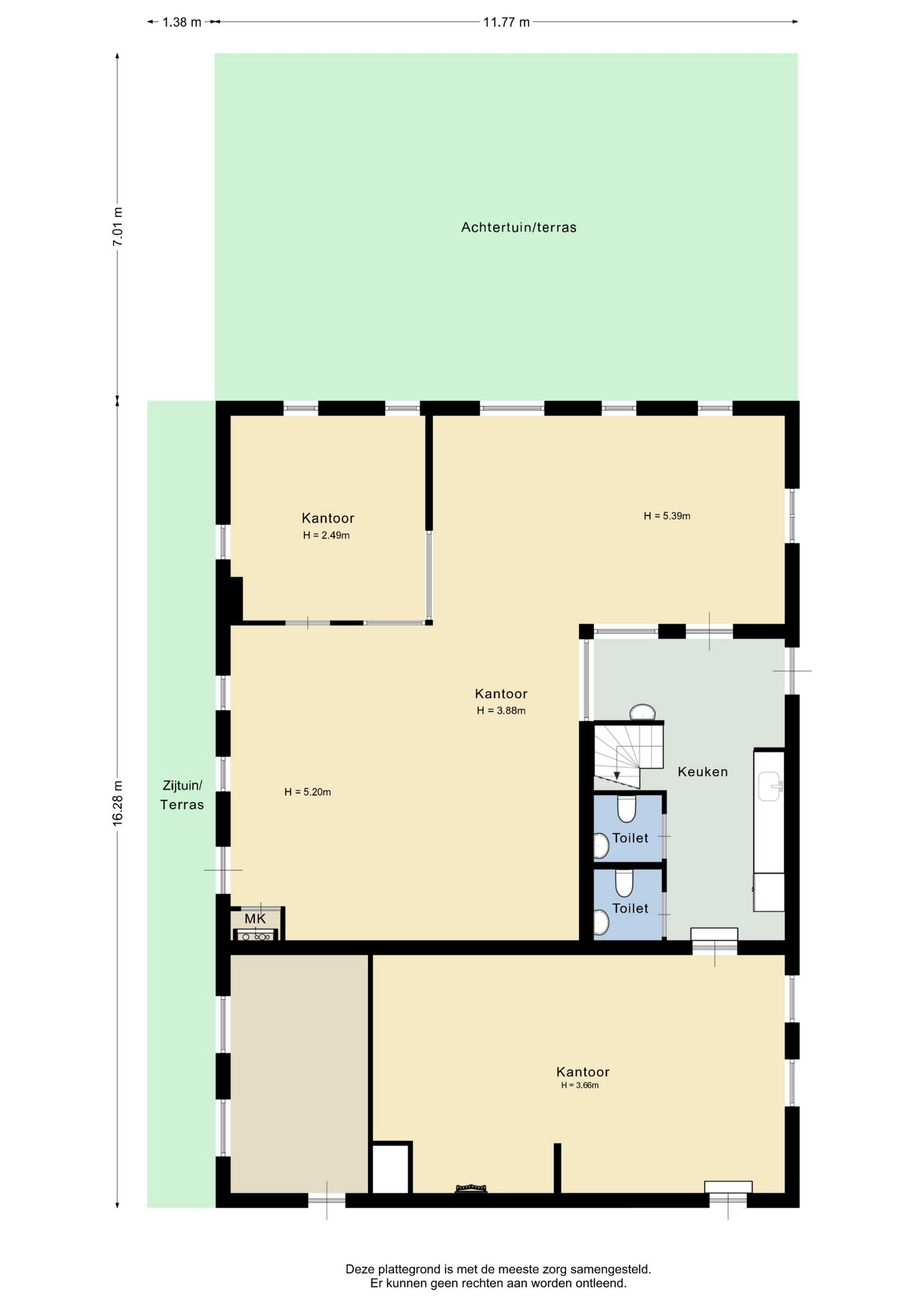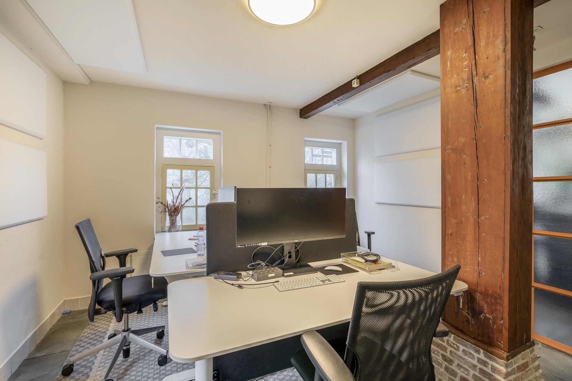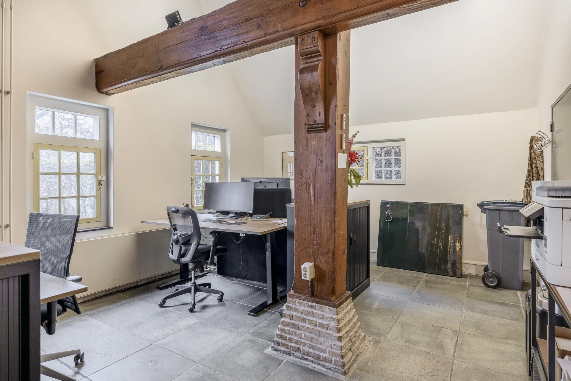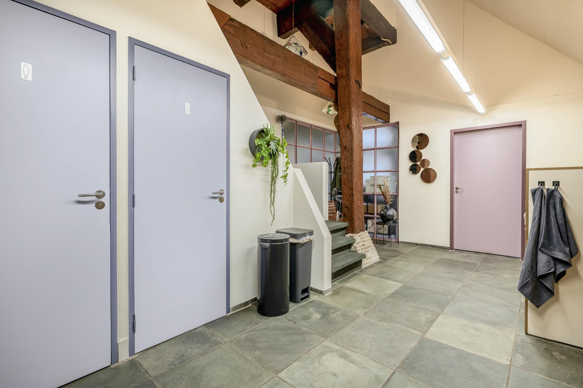 Via de gezamenlijke entree kom je binnen in een nette ontvangstruimte met kitchenette en dames- én herentoilet (gezamenlijk gebruik). Vanuit hier loop je door naar een lichte kantoorruimte van ca. 76 m², geschikt voor meerdere werkplekken. De ruimte beschikt over vloerverwarming, bijverwarming via radiatoren, airco en een warmtepomp. Het hoge plafond met originele balken en het uitzicht op de achtergelegen tuin zorgen voor een prettige en rustige werkomgeving.