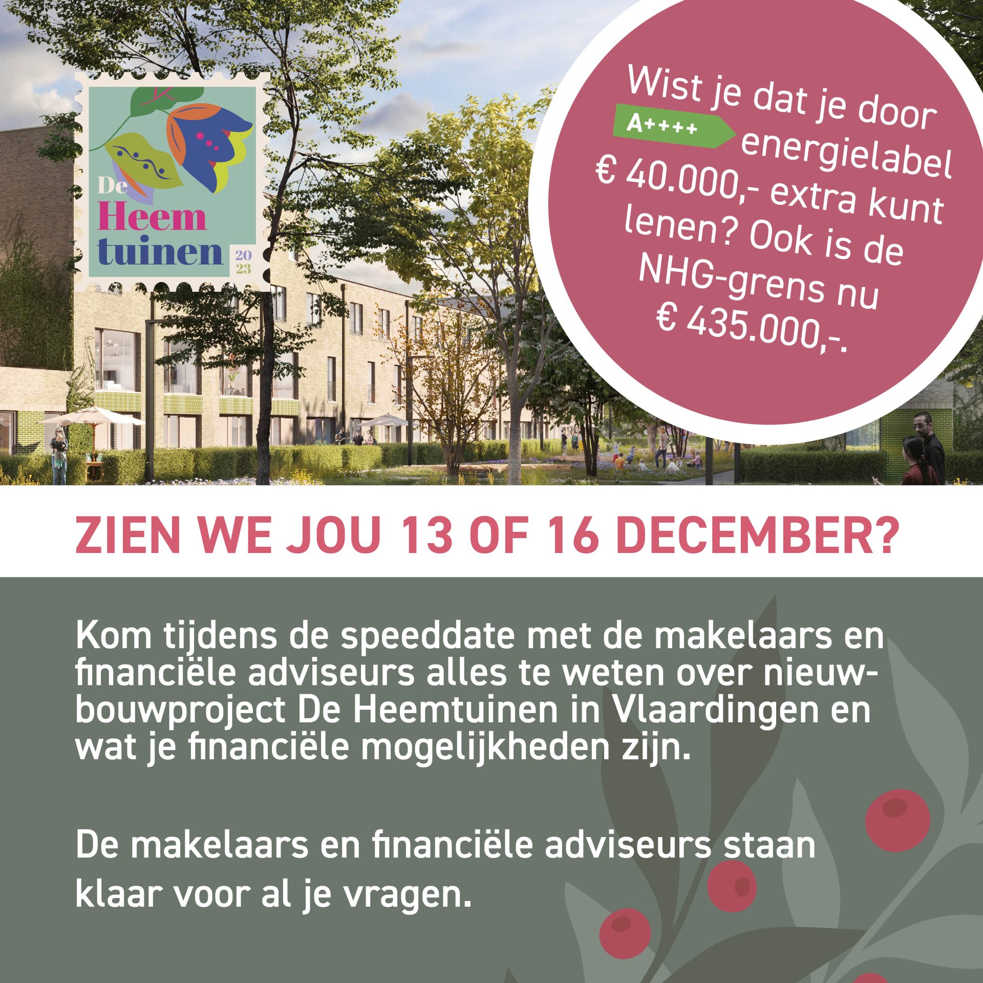 Kom jij speeddaten met één van onze makelaars en meer informatie op doen over het project De Heemtuinen? Woensdag 13 december en zaterdag 16 krijg je de mogelijkheid om langs te komen en te bespreken of het nieuwbouwproject aansluit bij je woonwensen en financiële mogelijkheden. Van Herk staat samen met de Rabobank en Fundament Financieel Advies klaar om om meer te vertellen over de zeer energiezuinige woningen in De Heemtuinen en de verruimde financiële mogelijkheden.