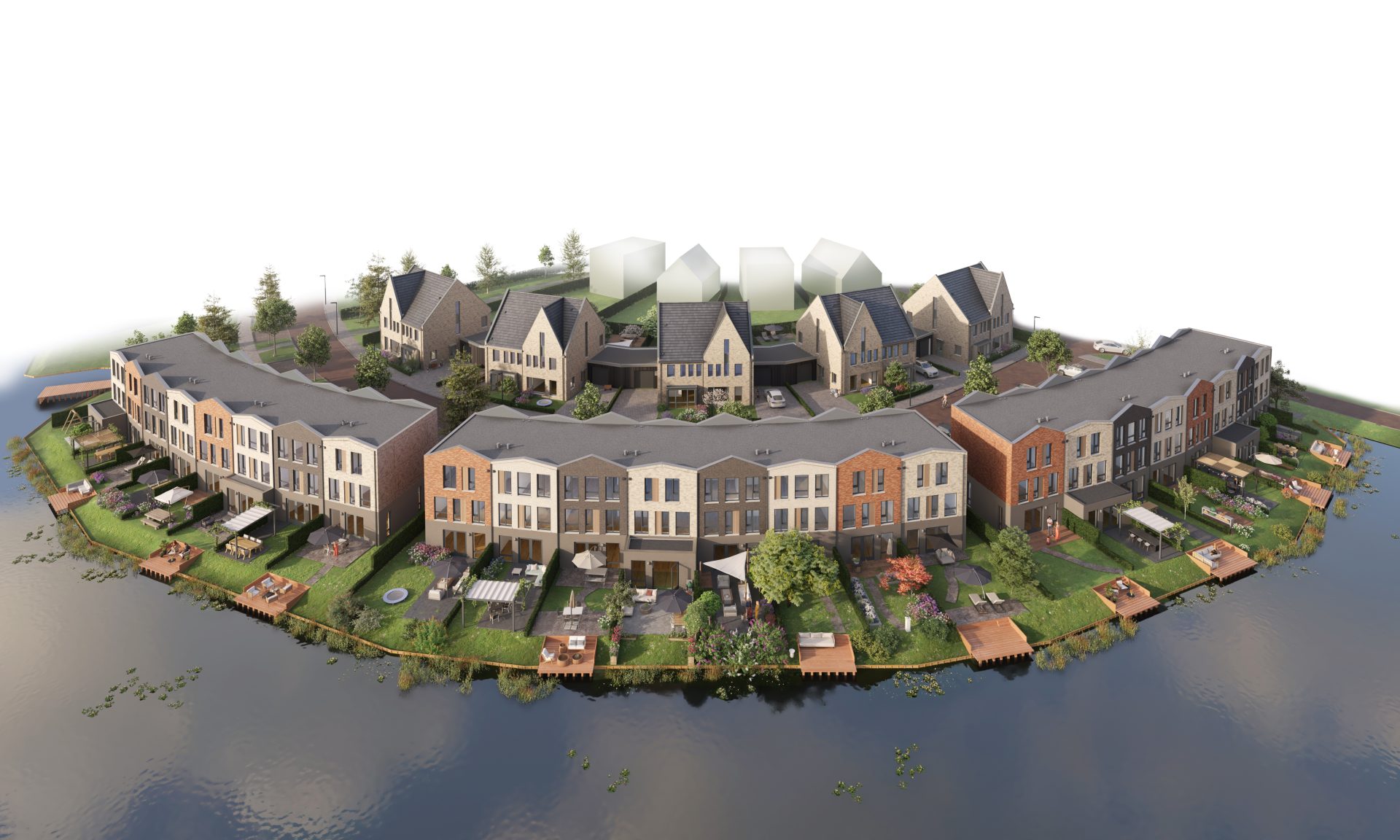 Het project bevindt zich aan de oostkant van Westergouwe, letterlijk tussen de stad en de natuur. Een heel bijzondere buurt, want hier woon je in alle vrijheid op je โeigenโ eiland.
