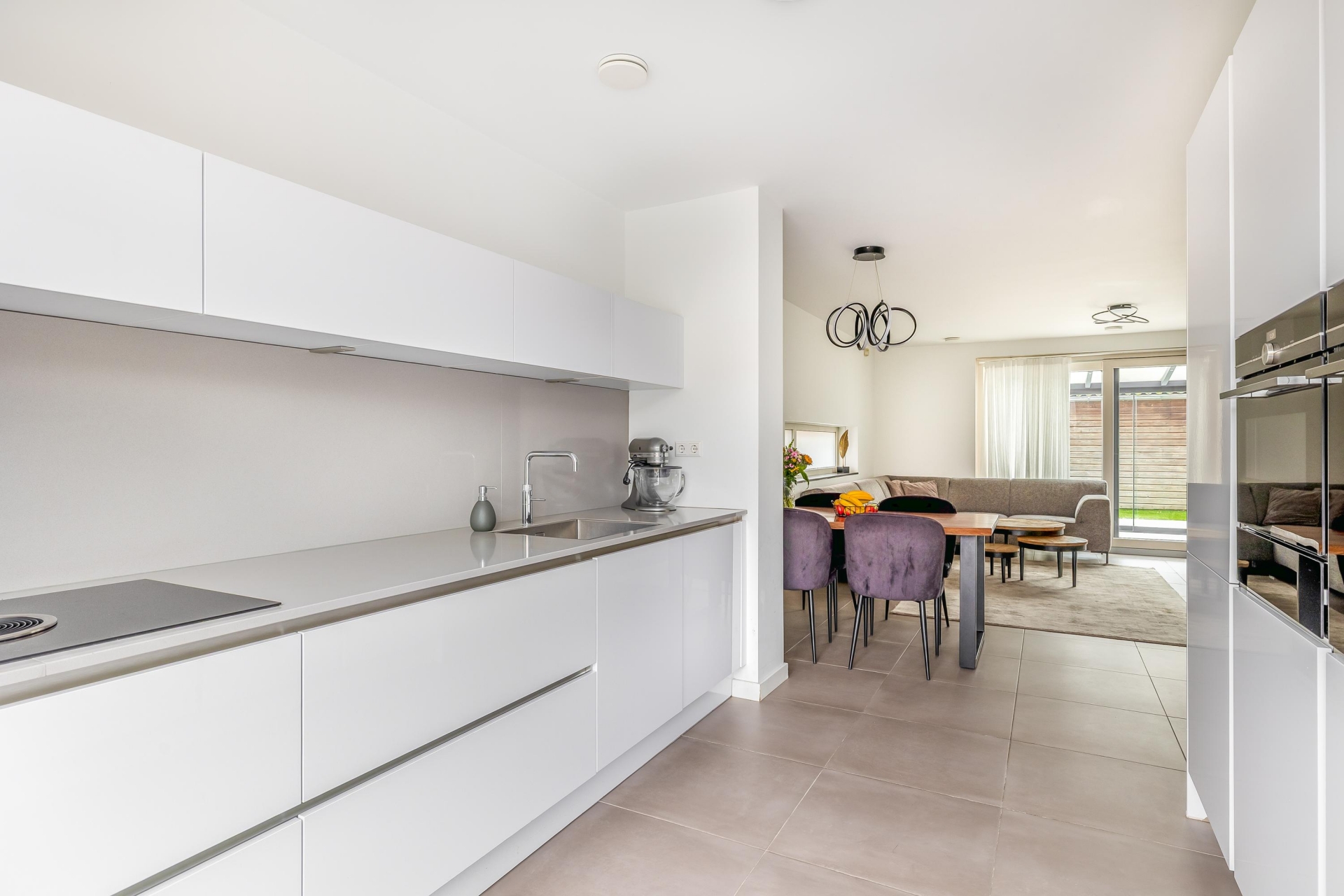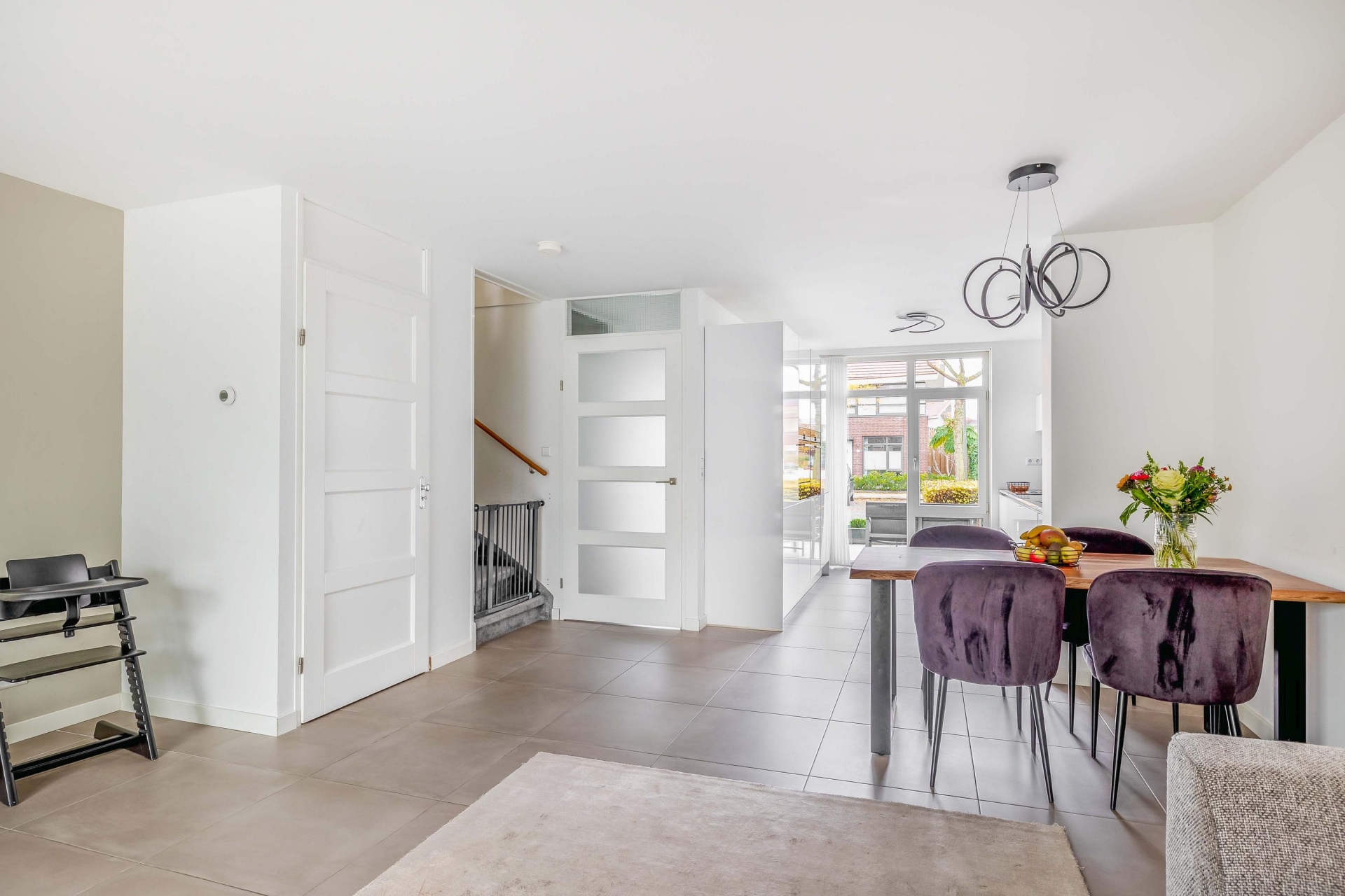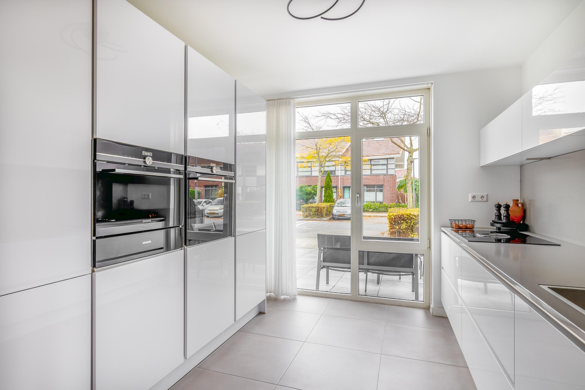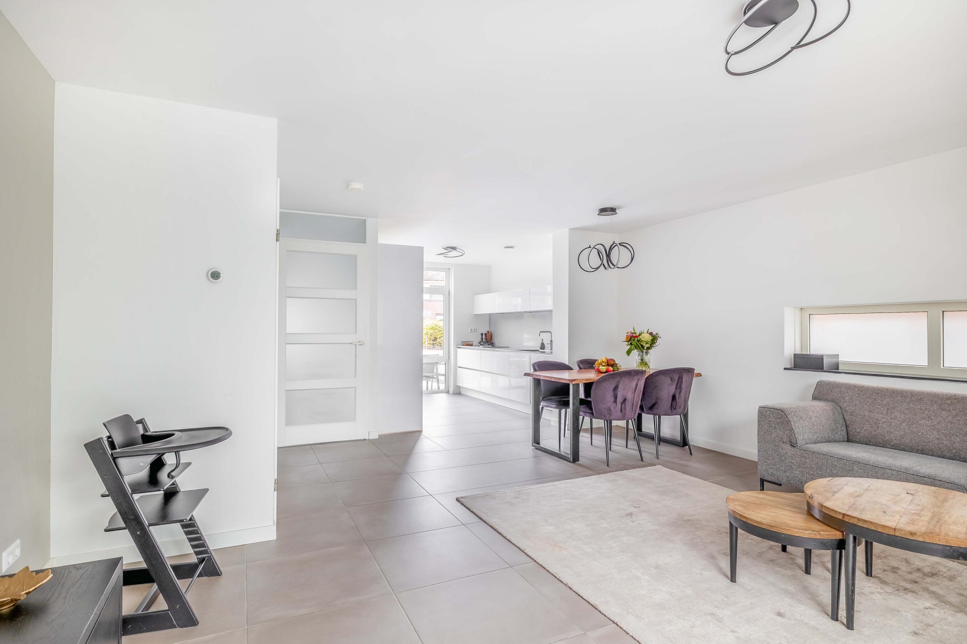 De open keuken sluit naadloos aan op de woonkamer. De strakke plavuizen vloer met vloerverwarming geeft een rustig beeld. Vanuit de woonkamer is de overkapping toegankelijk welke volledig dichtgemaakt kan worden met glazen wanden. Door de grote raampartijen heeft u extra veel licht en leuk zicht op de straat.