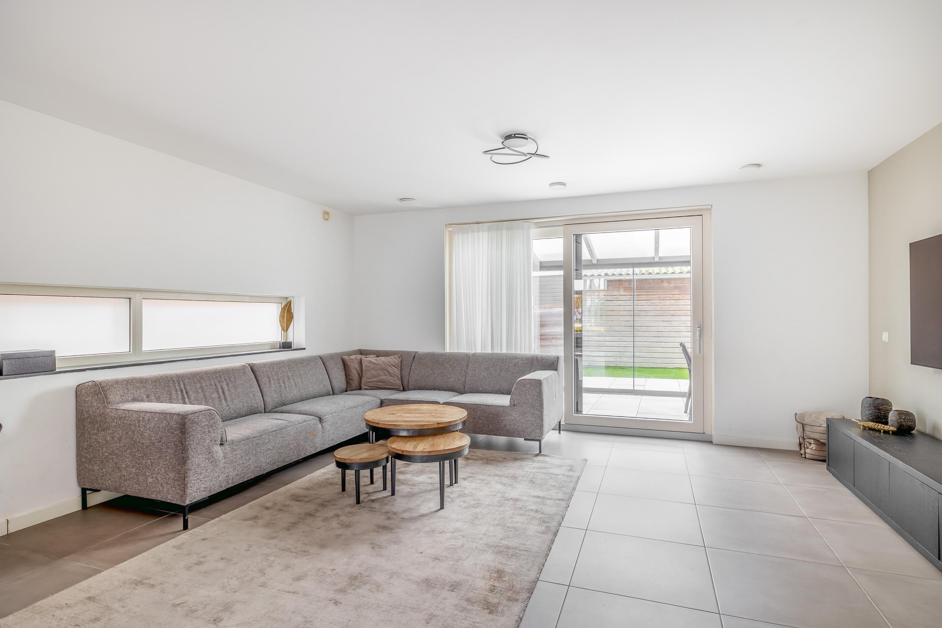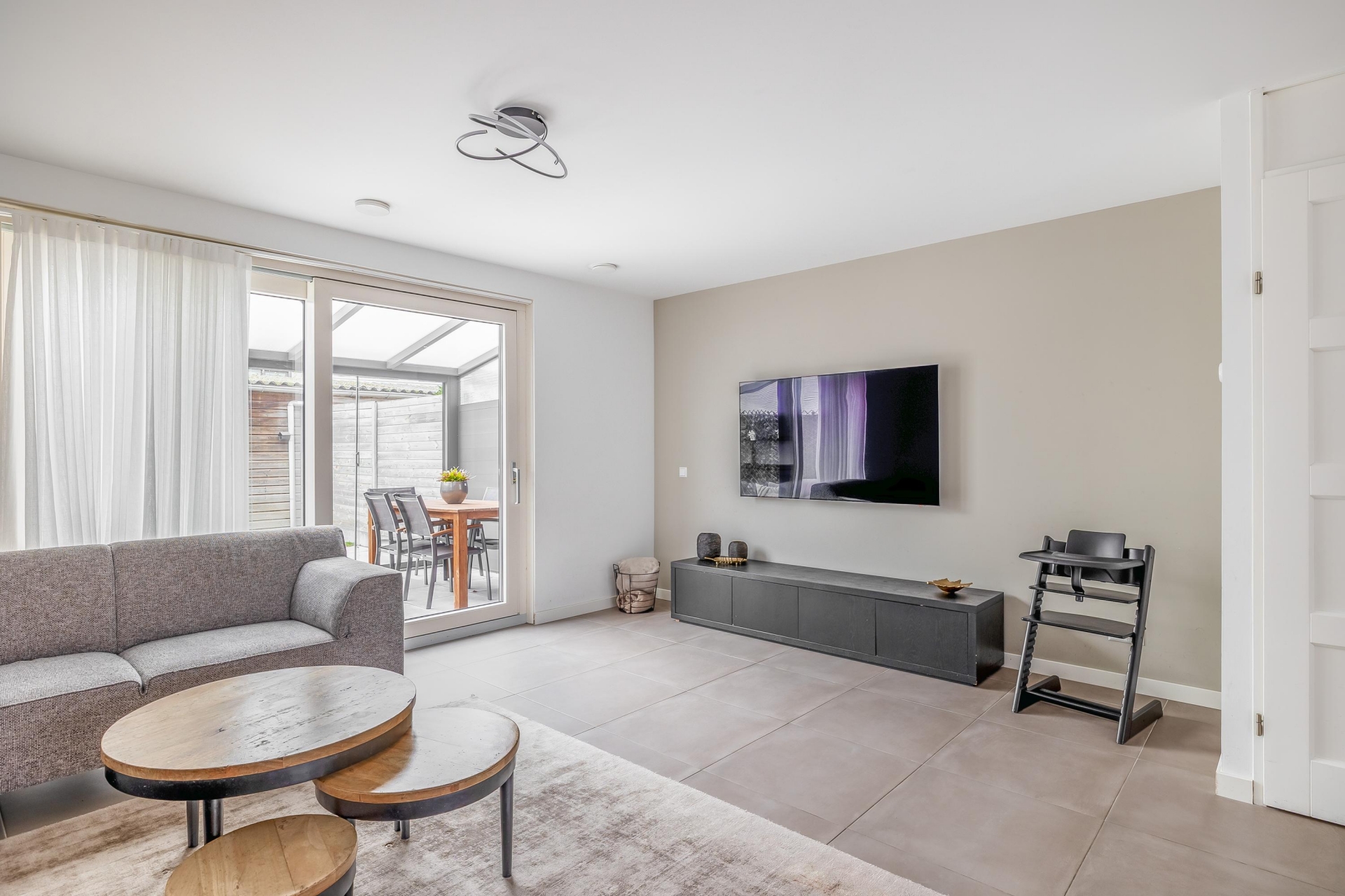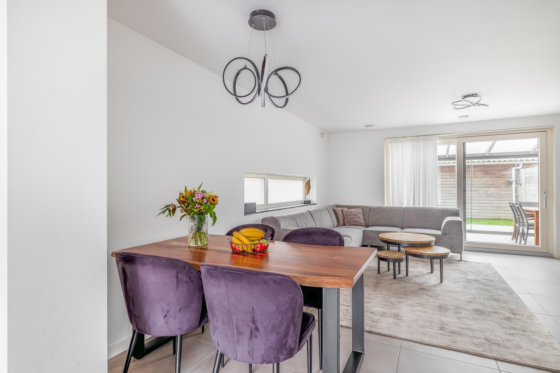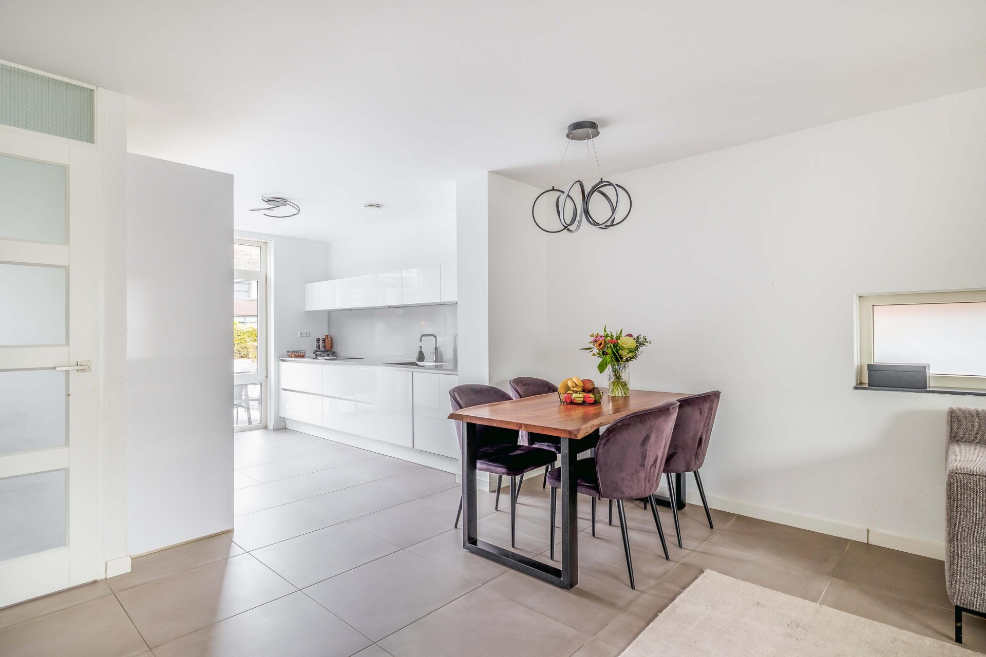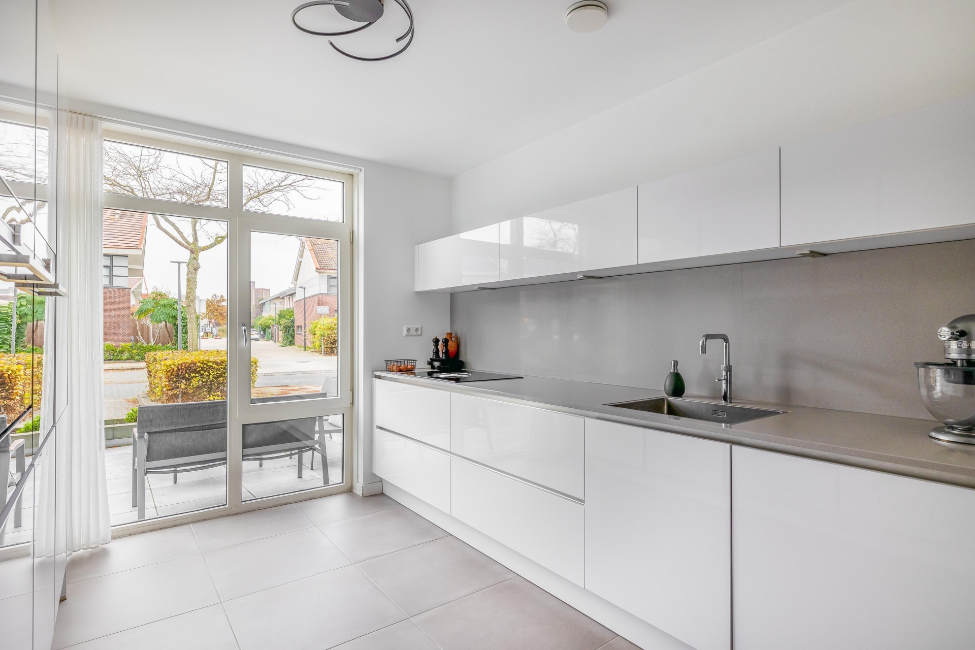 De open keuken sluit naadloos aan op de woonkamer. De strakke plavuizen vloer met vloerverwarming geeft een rustig beeld. Vanuit de woonkamer is de overkapping toegankelijk welke volledig dichtgemaakt kan worden met glazen wanden. Door de grote raampartijen heeft u extra veel licht en leuk zicht op de straat.