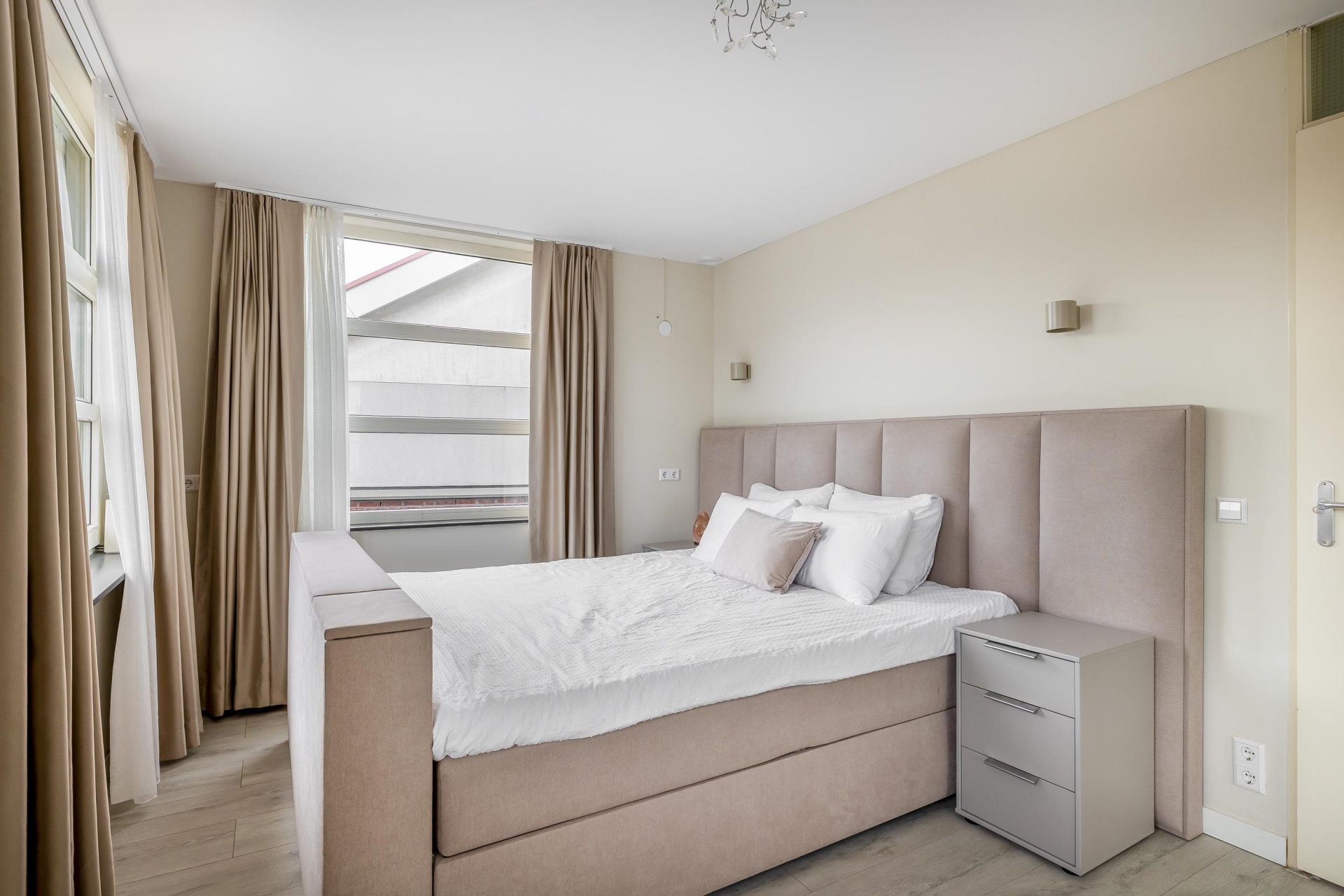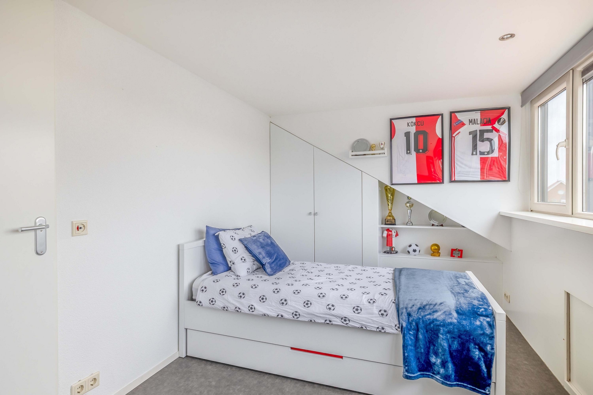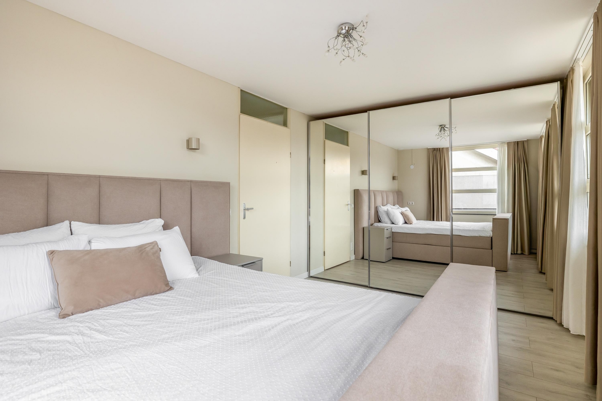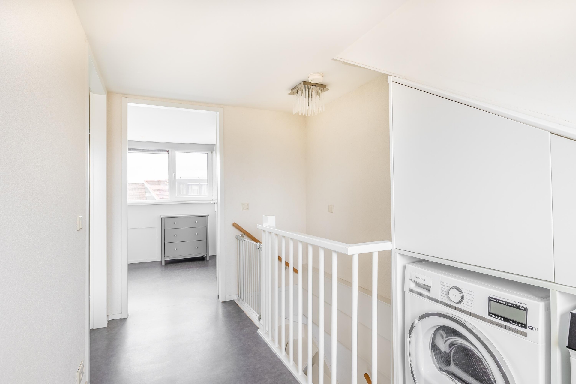 Via de trap in de woonkamer bereikt u de eerste verdieping. Vanaf de overloop zijn alle vertrekken toegankelijk. De overloop is voorzien van een vaste kast en trapopgang naar de tweede verdieping. Aan de voorzijde bevindt zich de royale master bedroom, die zich uitstrekt over de volledige breedte van de woning en daardoor voldoende ruimte biedt voor een grote kledingkast of extra opbergruimte.