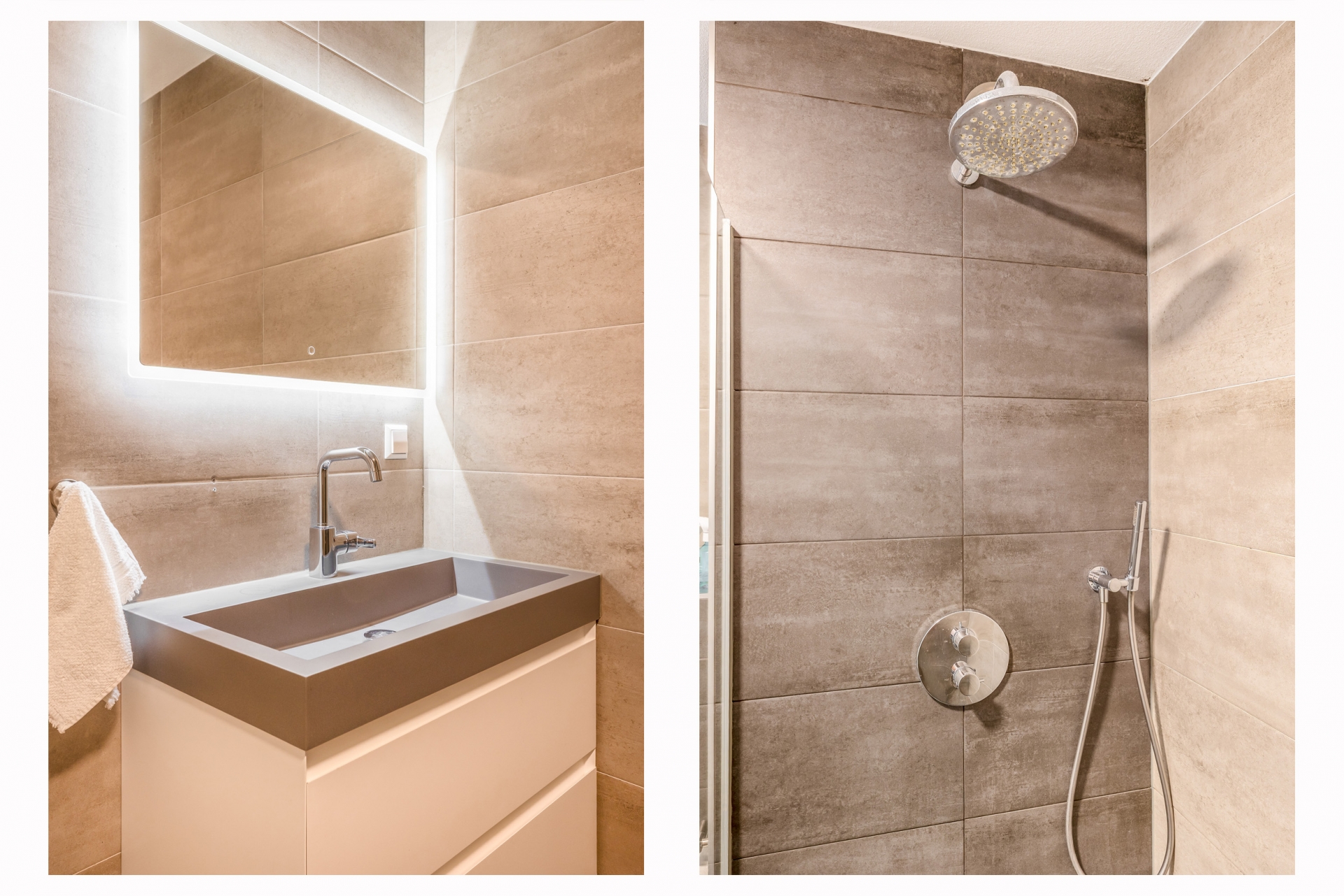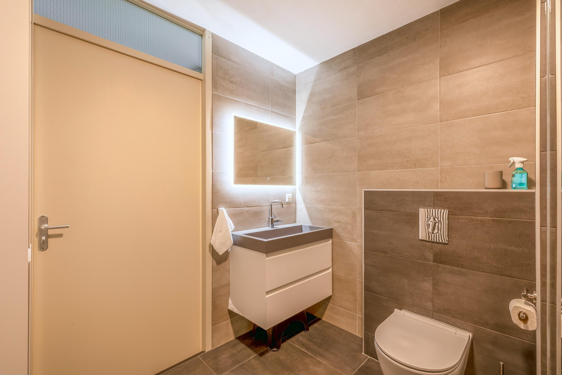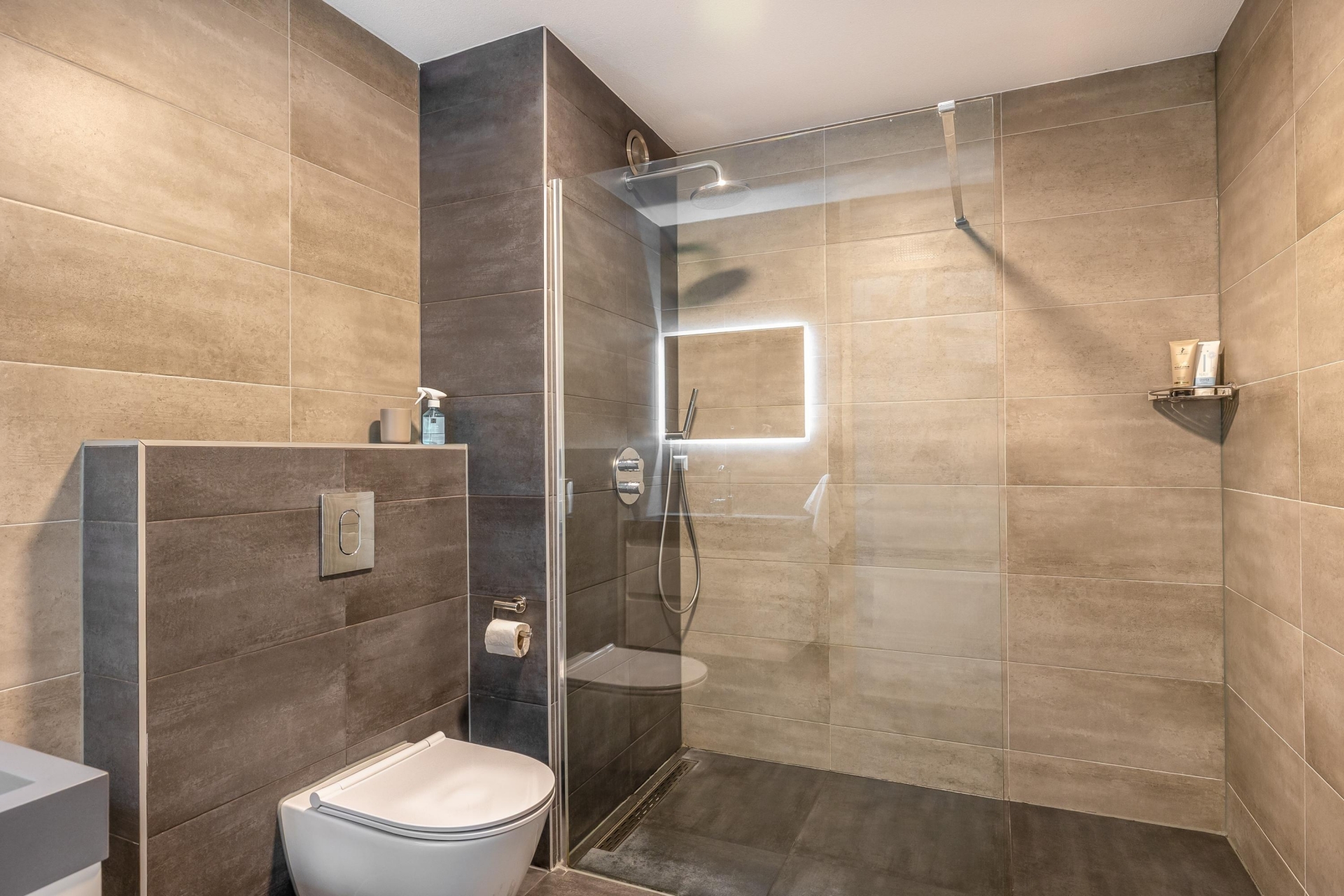 De badkamer is modern en strak afgewerkt en beschikt over een inloopdouche, een hangtoilet en een wastafelmeubel.