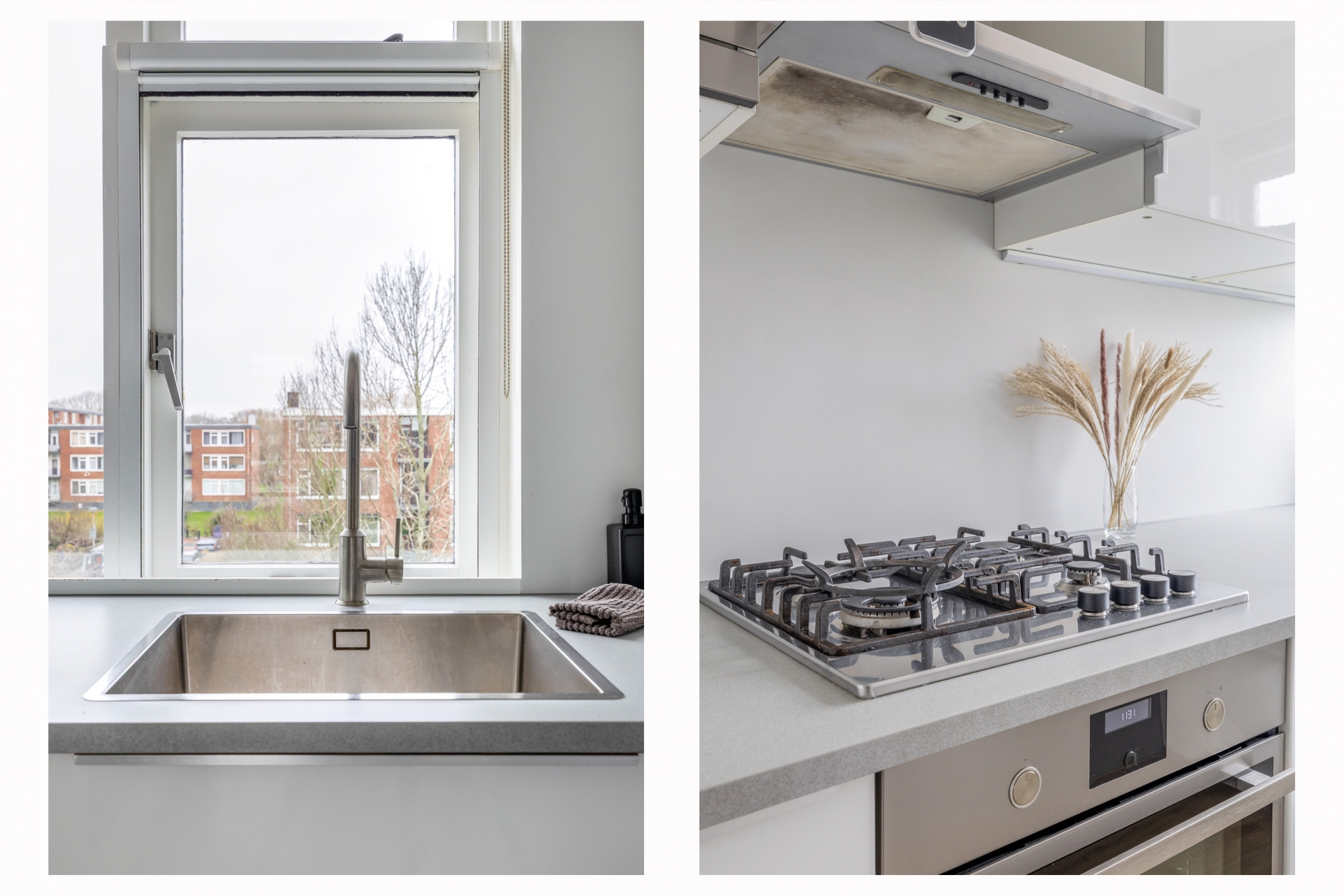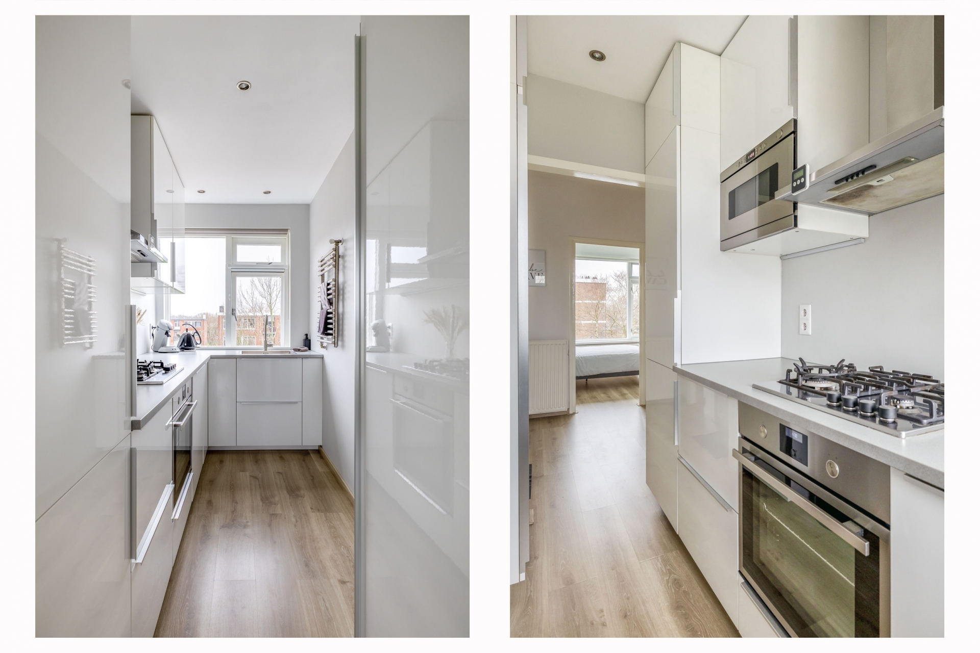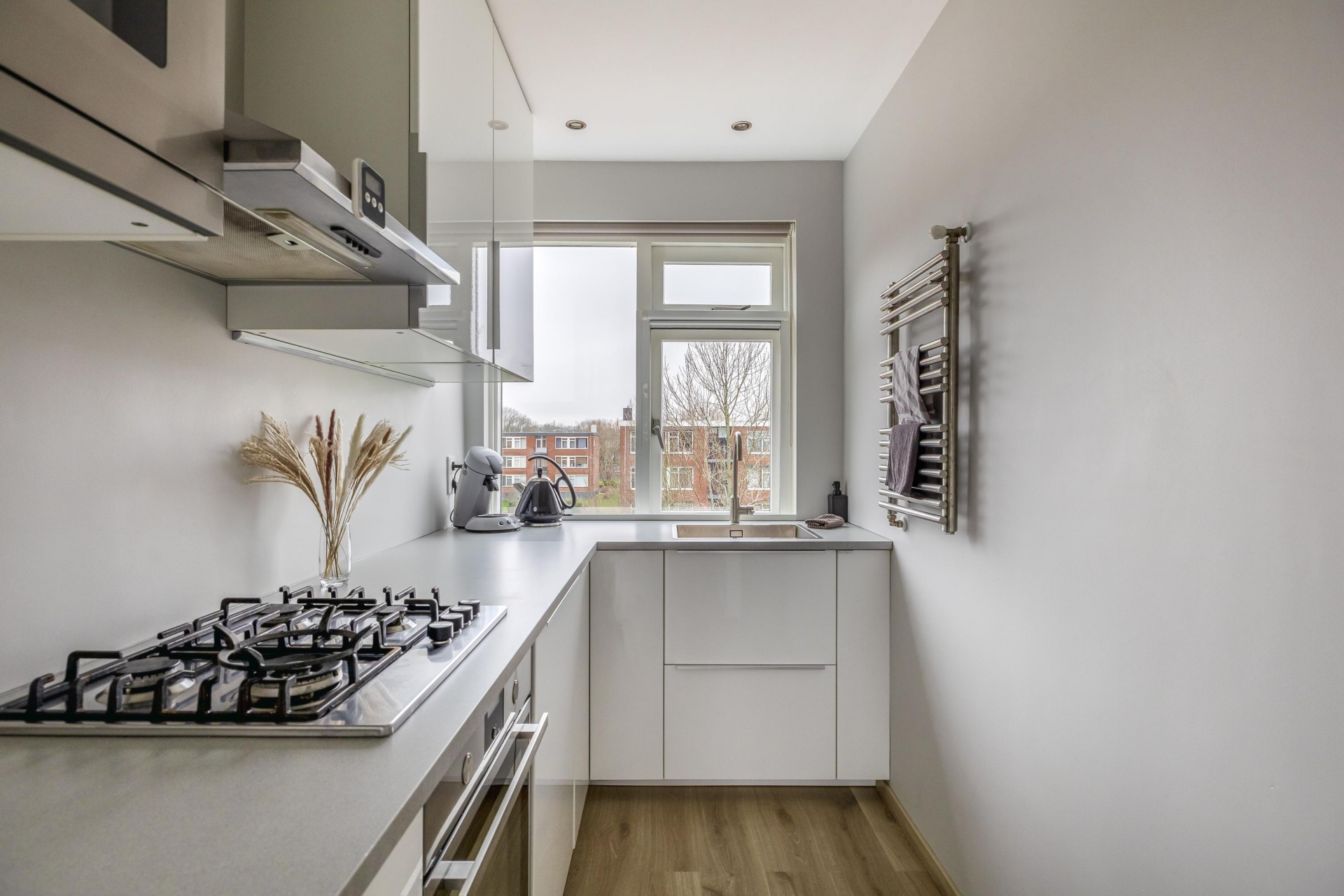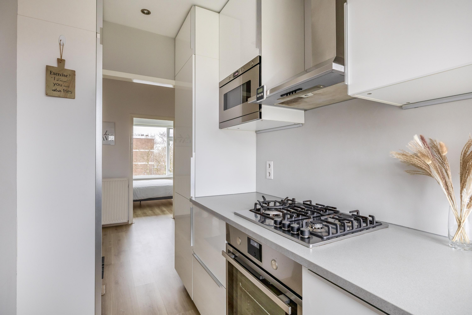 De keuken is strak uitgevoerd met een licht werkblad, wat het geheel een moderne uitstraling geeft. Je beschikt hier over een 4-pits gaskookplaat, afzuigkap, oven, magnetron, vaatwasser en koel-vriescombinatie. Ook aan opbergruimte is gedacht. Tevens bevindt zich hier nog een vaste kast met de opstelling cv combiketel Nefit HR.,