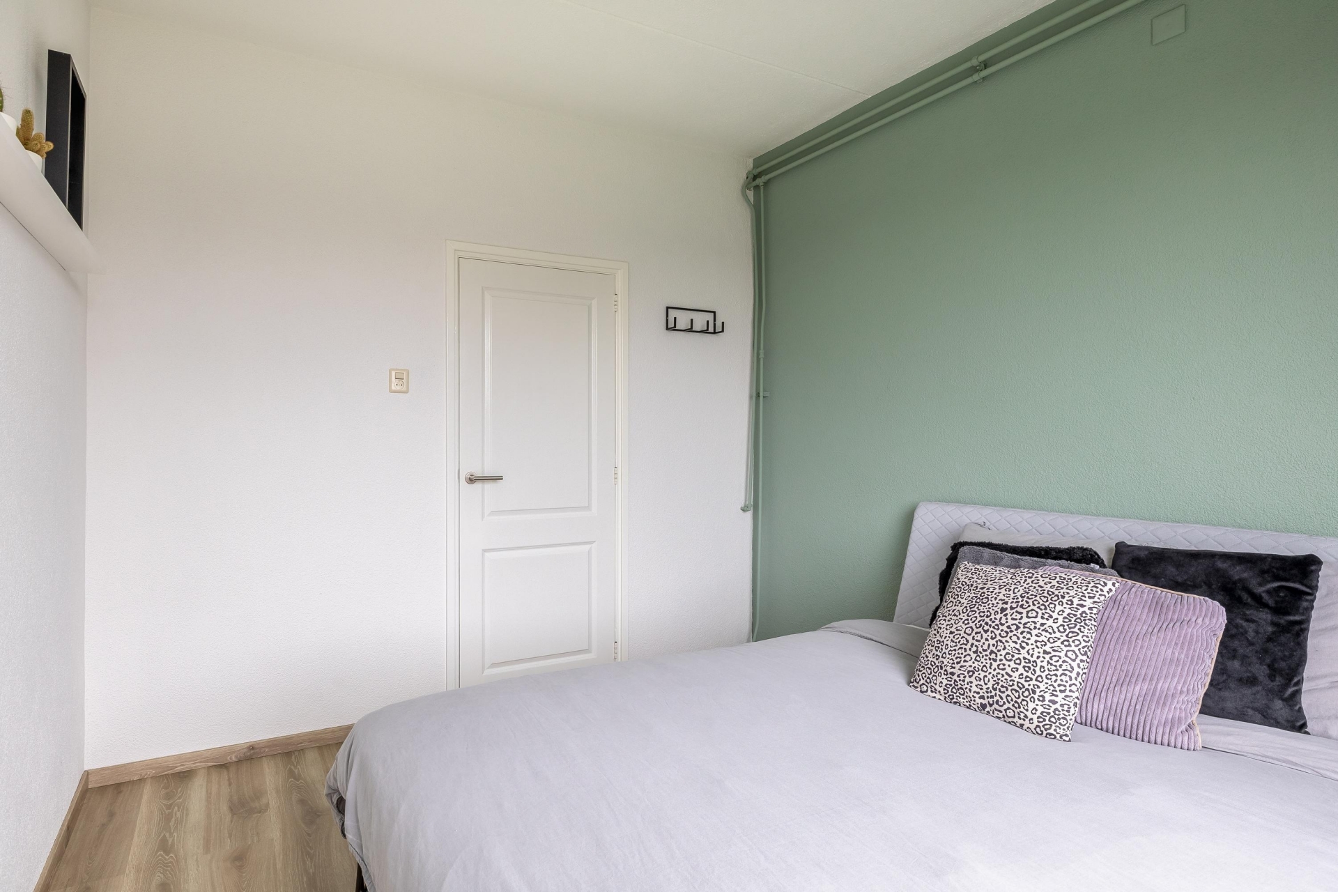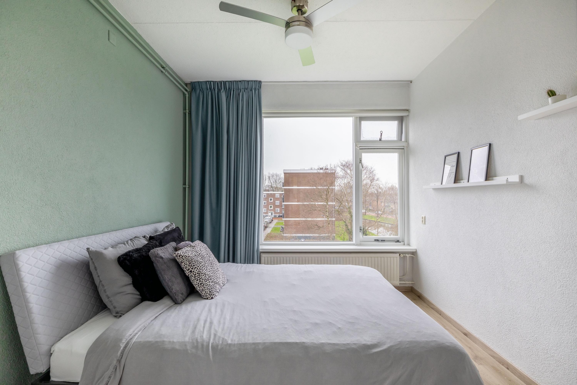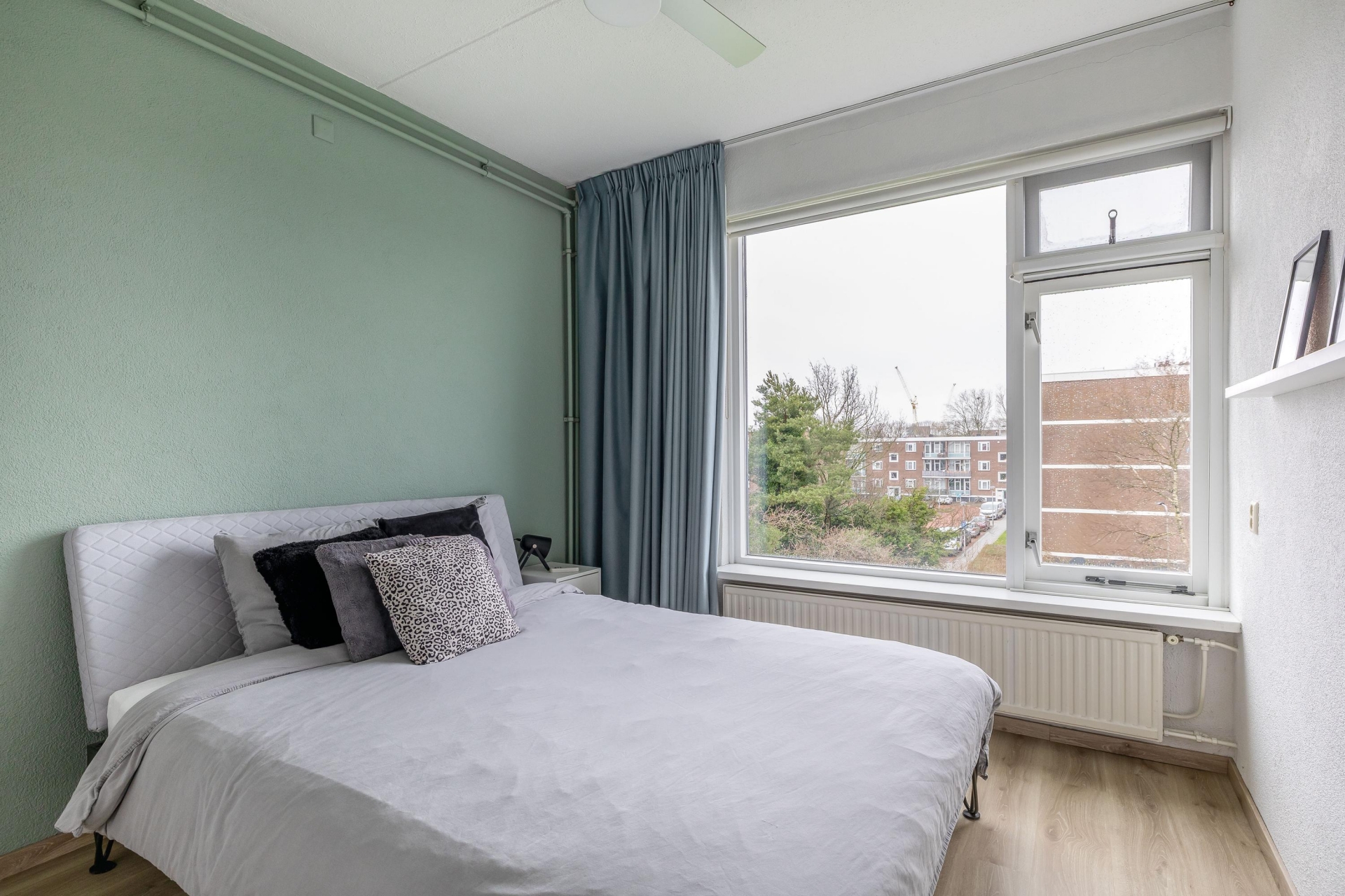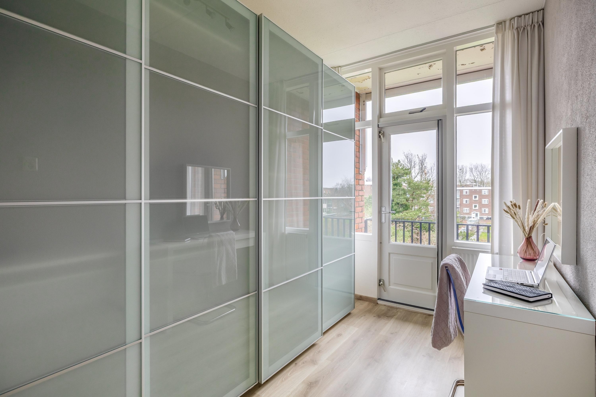 Van origine had dit appartement drie slaapkamers, maar één kamer is bij de woonkamer getrokken. Daardoor beschik je nu over een extra ruime living én twee goede slaapkamers. De master bedroom ligt aan de rustige achterzijde en heeft een groot raam met uitzicht over het groen. De tweede kamer, nu ingericht als werkkamer met kastenwand, biedt toegang tot het balkon op het zuidoosten.