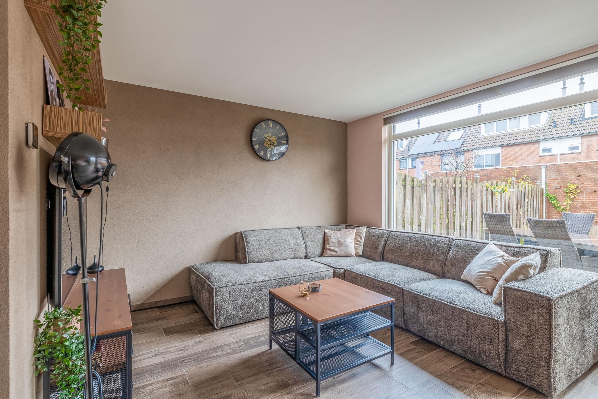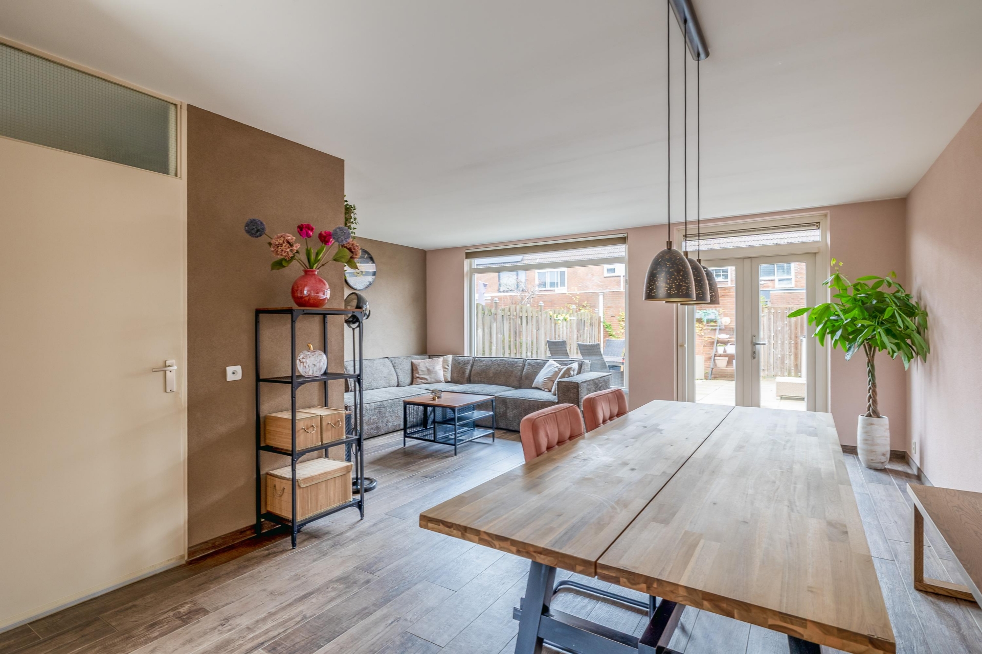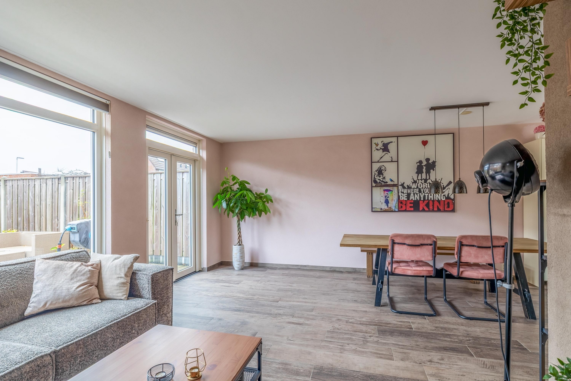 Bij binnenkomst valt meteen de aangename lichtinval op. De woonkamer is strak afgewerkt, voorzien van een doorlopende tegelvloer in warme houtlook en biedt ruimte voor zowel een zithoek als een eethoek. De openslaande deuren naar de achtertuin zorgen voor een natuurlijke verbinding tussen binnen en buiten, perfect voor zomerse dagen en gezellige avonden.