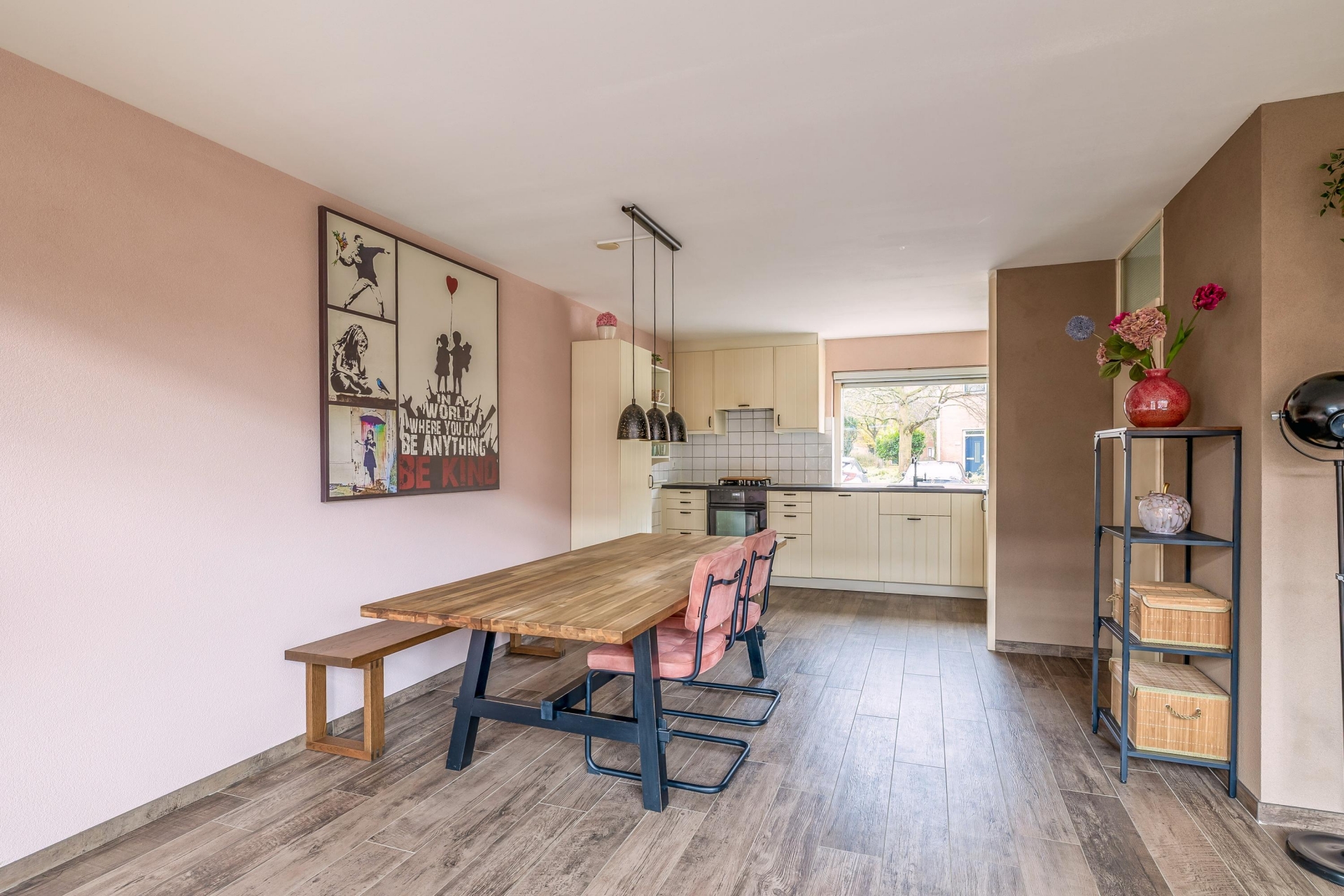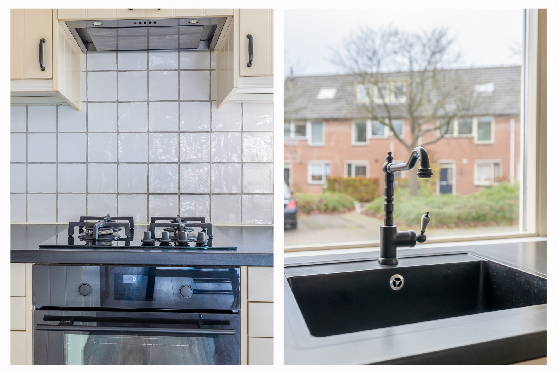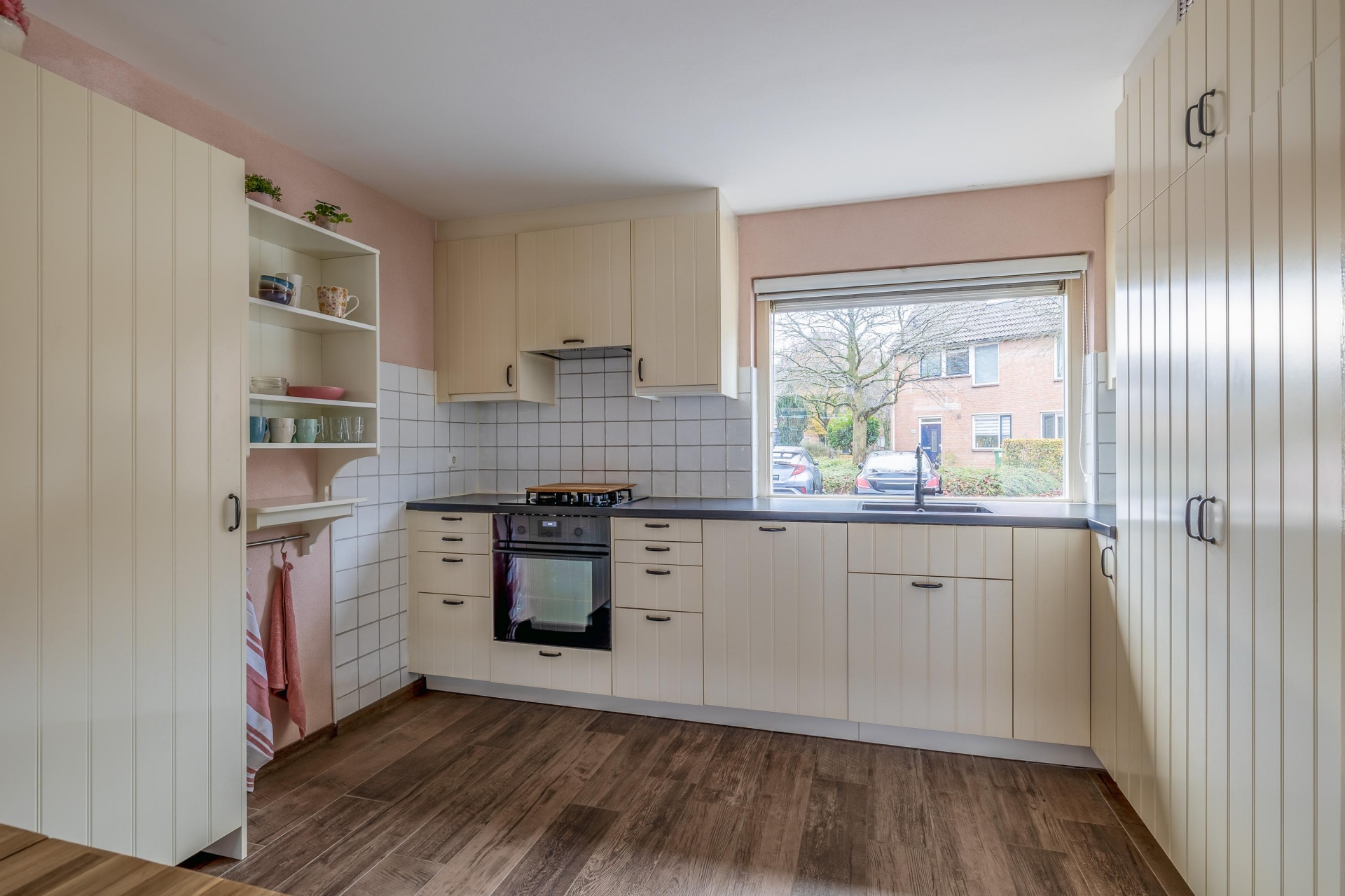 De keuken aan de voorzijde is vernieuwd in 2017 en biedt volop werk- en bergruimte. De landelijke uitstraling met paneeldeuren combineert mooi met de moderne inbouwapparatuur, waaronder een oven, gaskookplaat en vaatwasser. Dankzij het grote raam kijk je hier uit over de rustige straat aan de voorzijde terwijl je kookt.