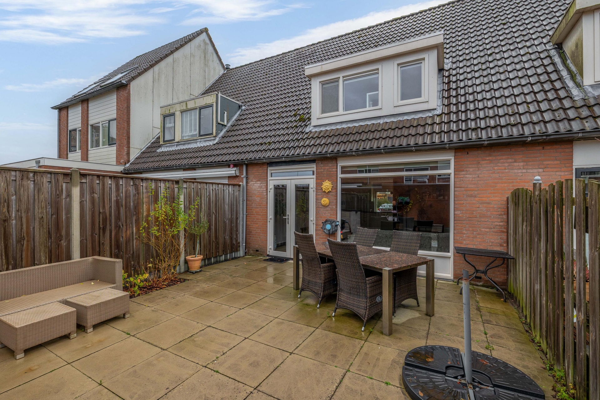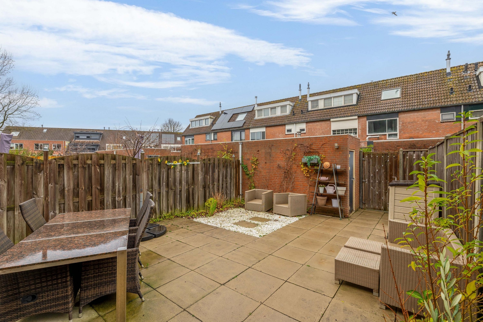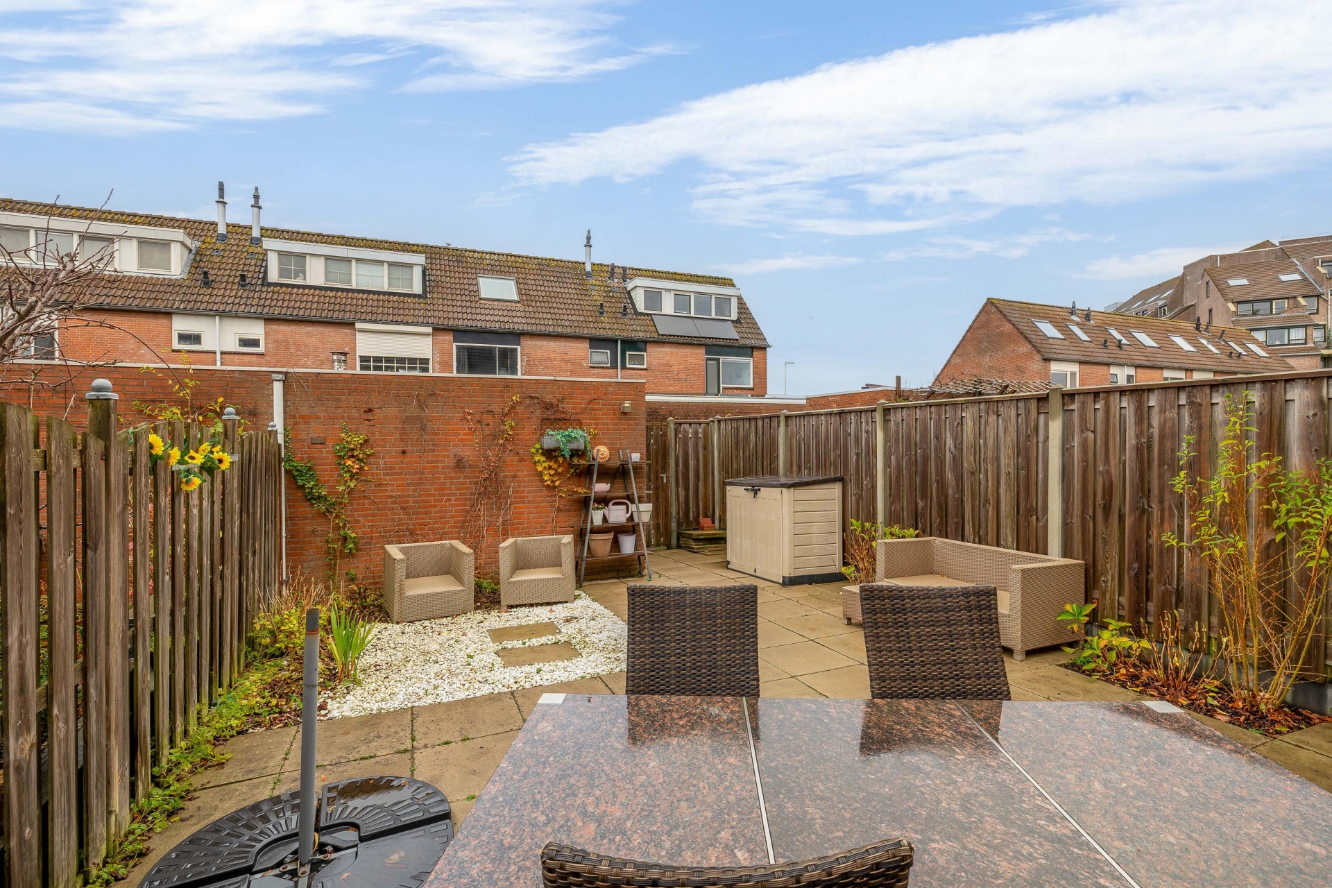 De achtertuin is zonder twijfel een van de pluspunten van dit huis. Dankzij de noordwestelijke ligging zit je hier heerlijk in de middag- en avondzon. De tuin is grotendeels betegeld, waardoor hij onderhoudsvriendelijk is, en biedt daarnaast voldoende ruimte om te tuinieren, te spelen of gewoon lekker te ontspannen. De vrijstaande stenen berging biedt praktische opbergruimte voor fietsen of gereedschap en dankzij de achterom is de tuin ook via de achterzijde bereikbaar!