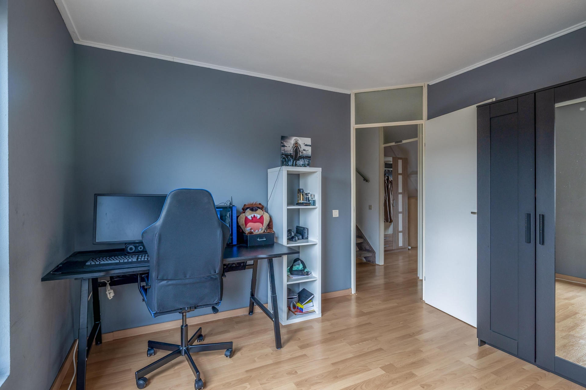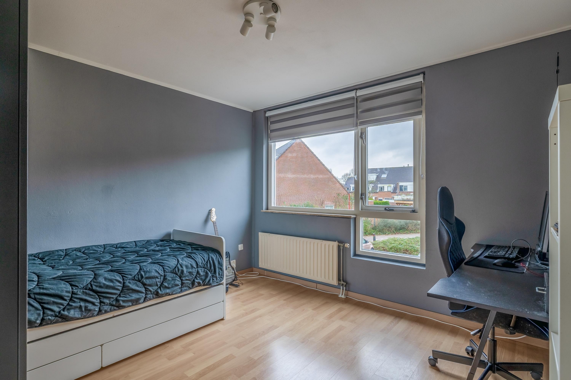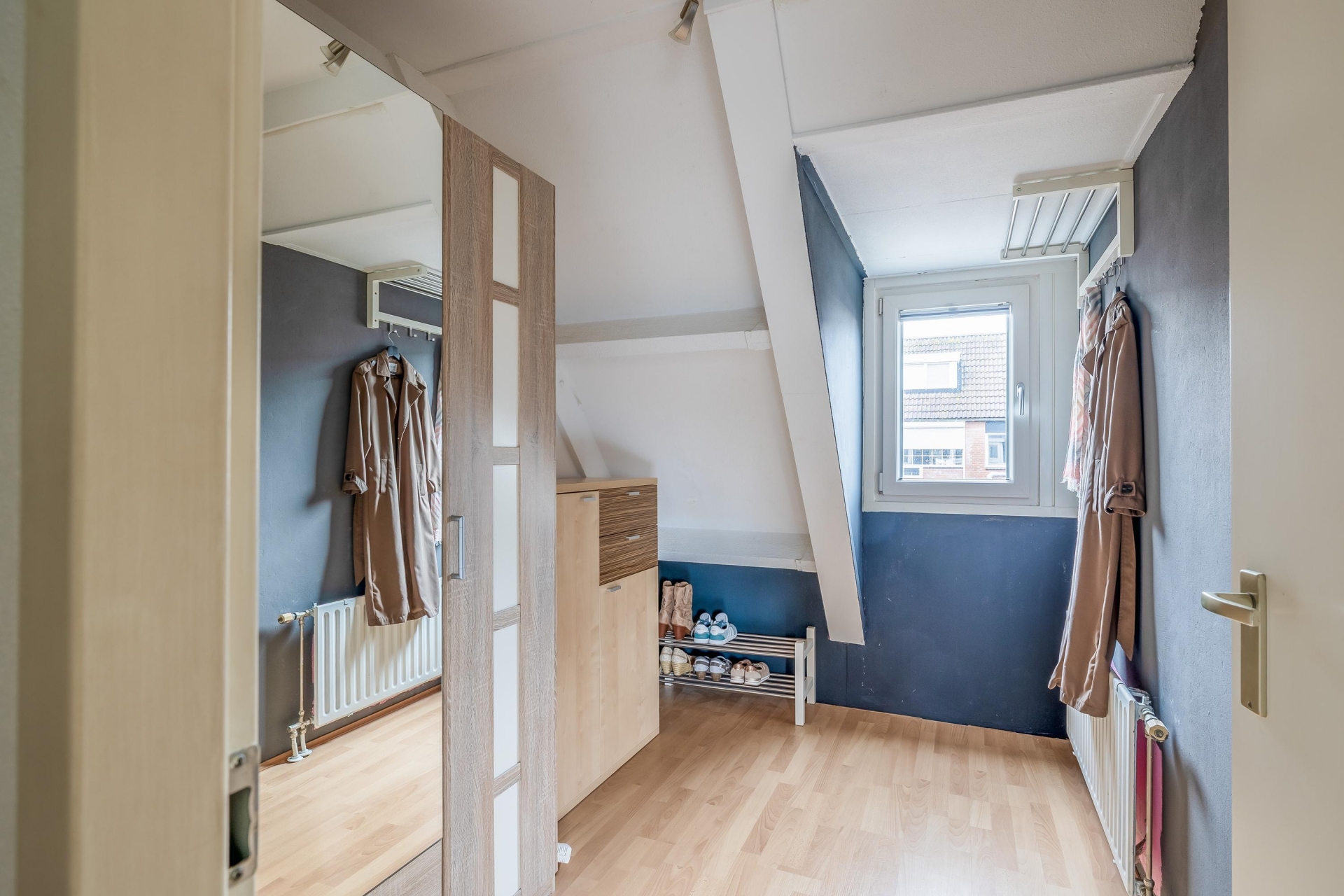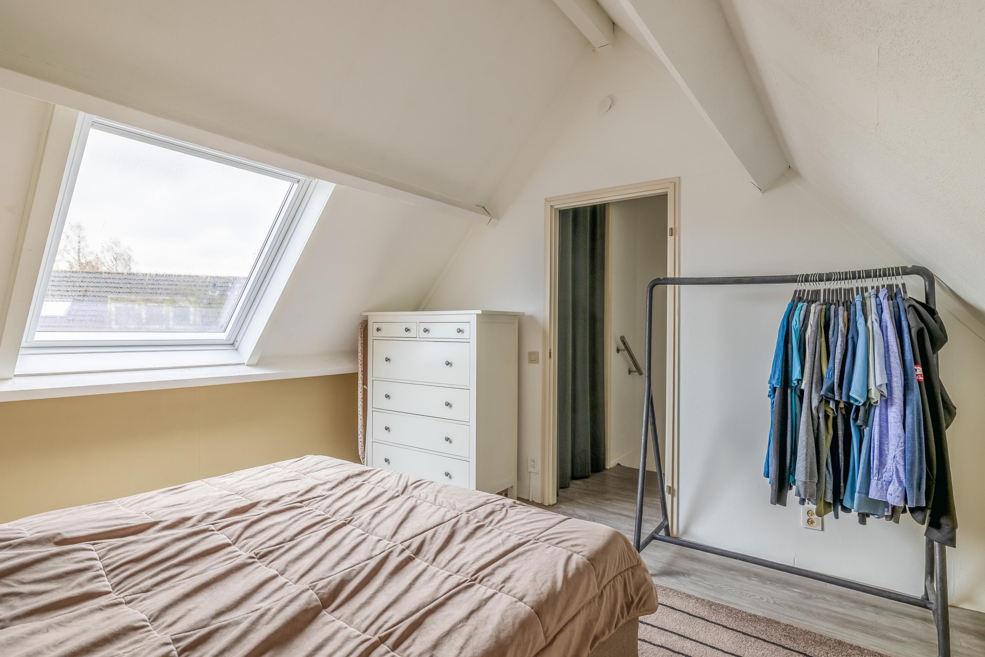 Verspreid over de eerste en tweede verdieping vind je in totaal vier slaapkamers, wat dit huis ideaal maakt voor gezinnen, thuiswerkers of logees. De grootste slaapkamer bevindt zich aan de voorzijde op de eerste verdieping en biedt plek voor een groot tweepersoonsbed en kastruimte. Verder zijn er nog twee slaapkamers op deze verdieping en een ruime zolderkamer op de bovenste etage, bereikbaar via een vaste trap. Deze zolderkamer is voorzien van een dakraam en kan ook perfect fungeren als hobbyruimte of werkkamer.