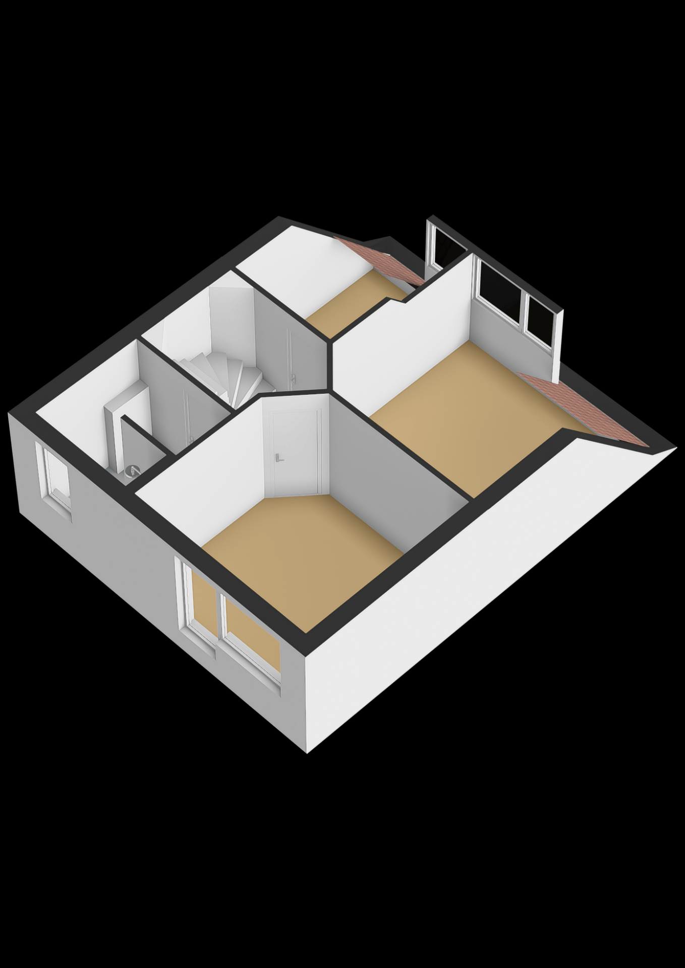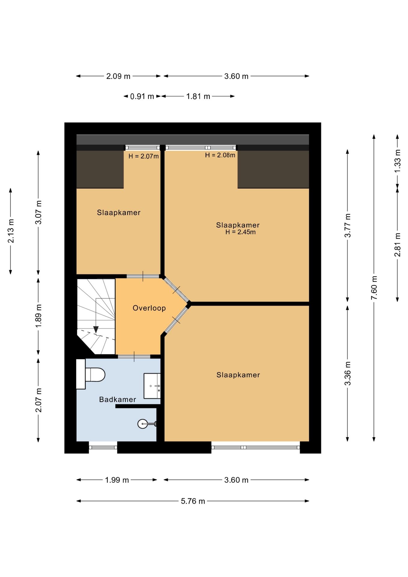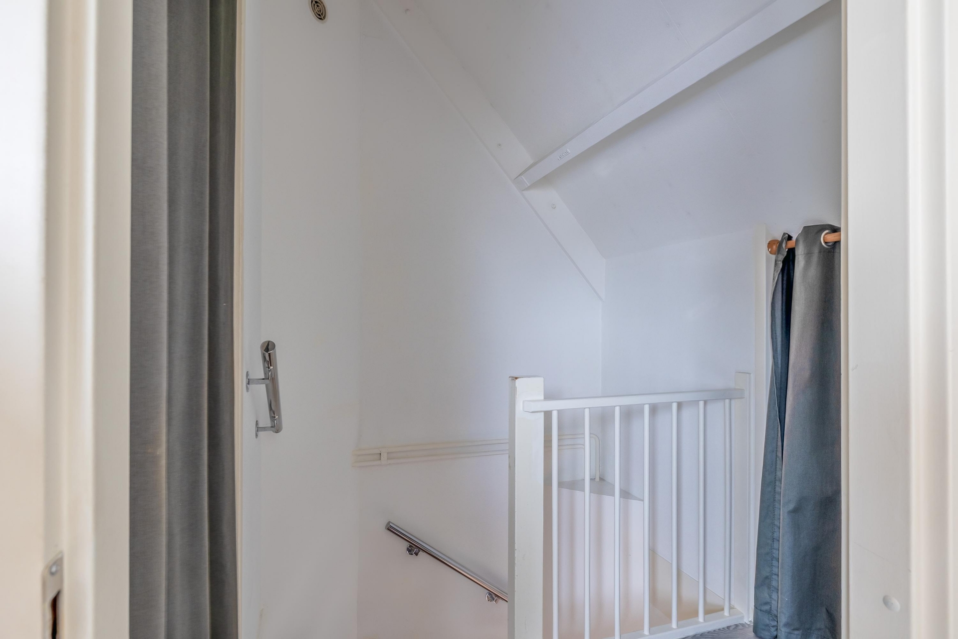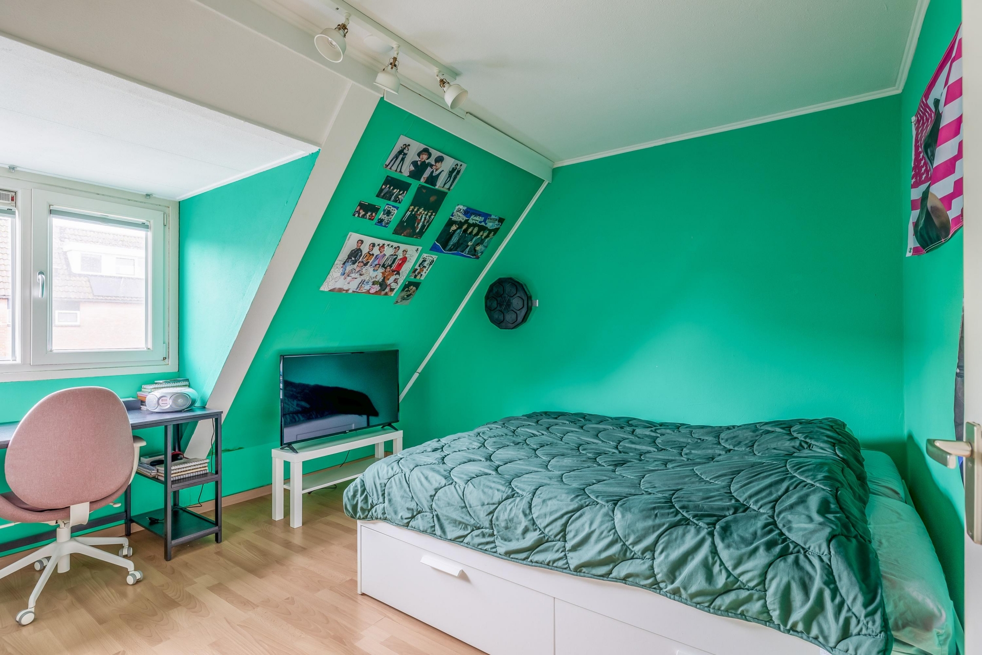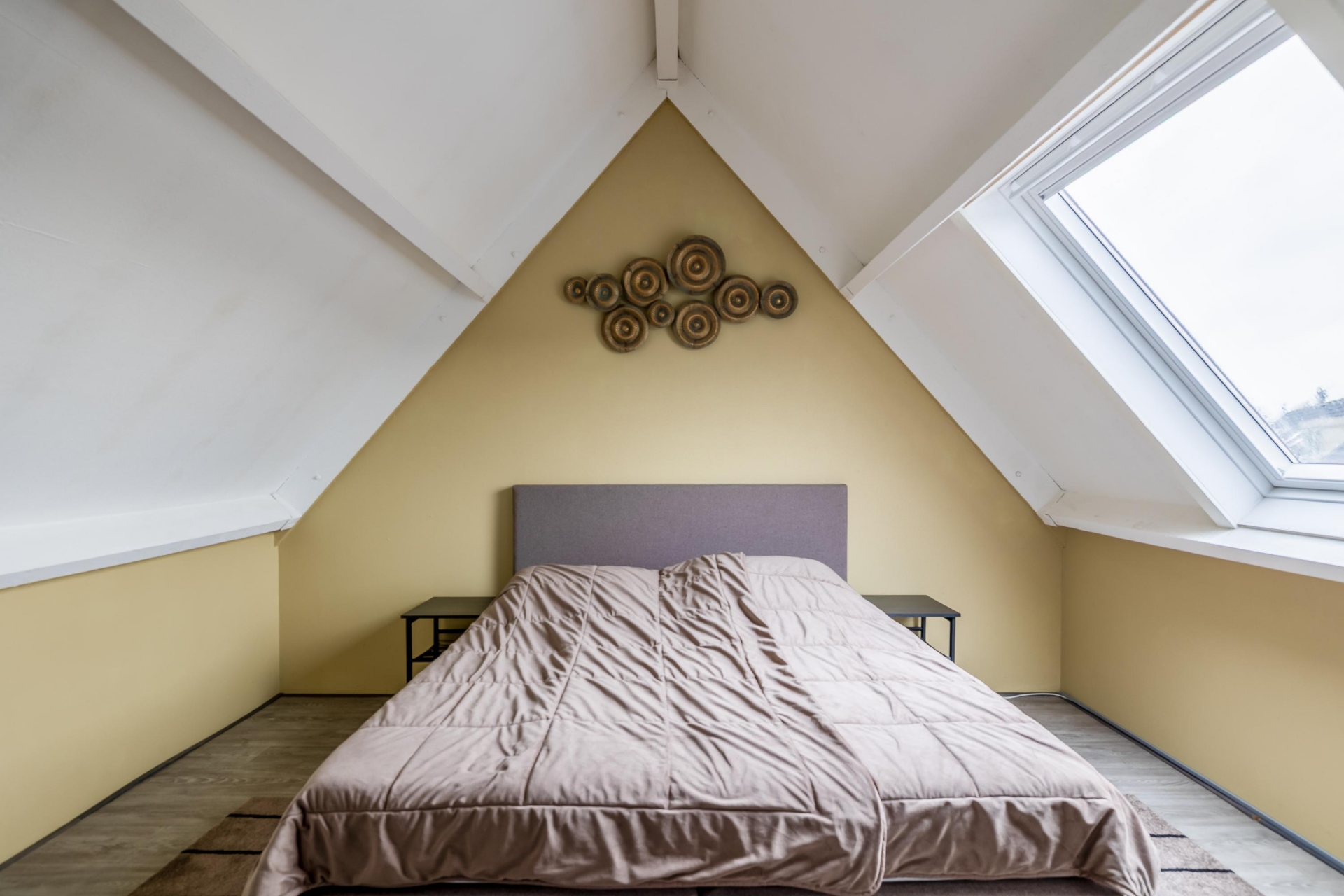 Verspreid over de eerste en tweede verdieping vind je in totaal vier slaapkamers, wat dit huis ideaal maakt voor gezinnen, thuiswerkers of logees. De grootste slaapkamer bevindt zich aan de voorzijde op de eerste verdieping en biedt plek voor een groot tweepersoonsbed en kastruimte. Verder zijn er nog twee slaapkamers op deze verdieping en een ruime zolderkamer op de bovenste etage, bereikbaar via een vaste trap. Deze zolderkamer is voorzien van een dakraam en kan ook perfect fungeren als hobbyruimte of werkkamer.