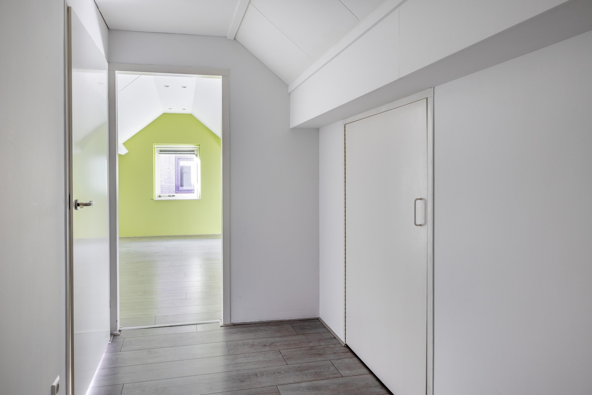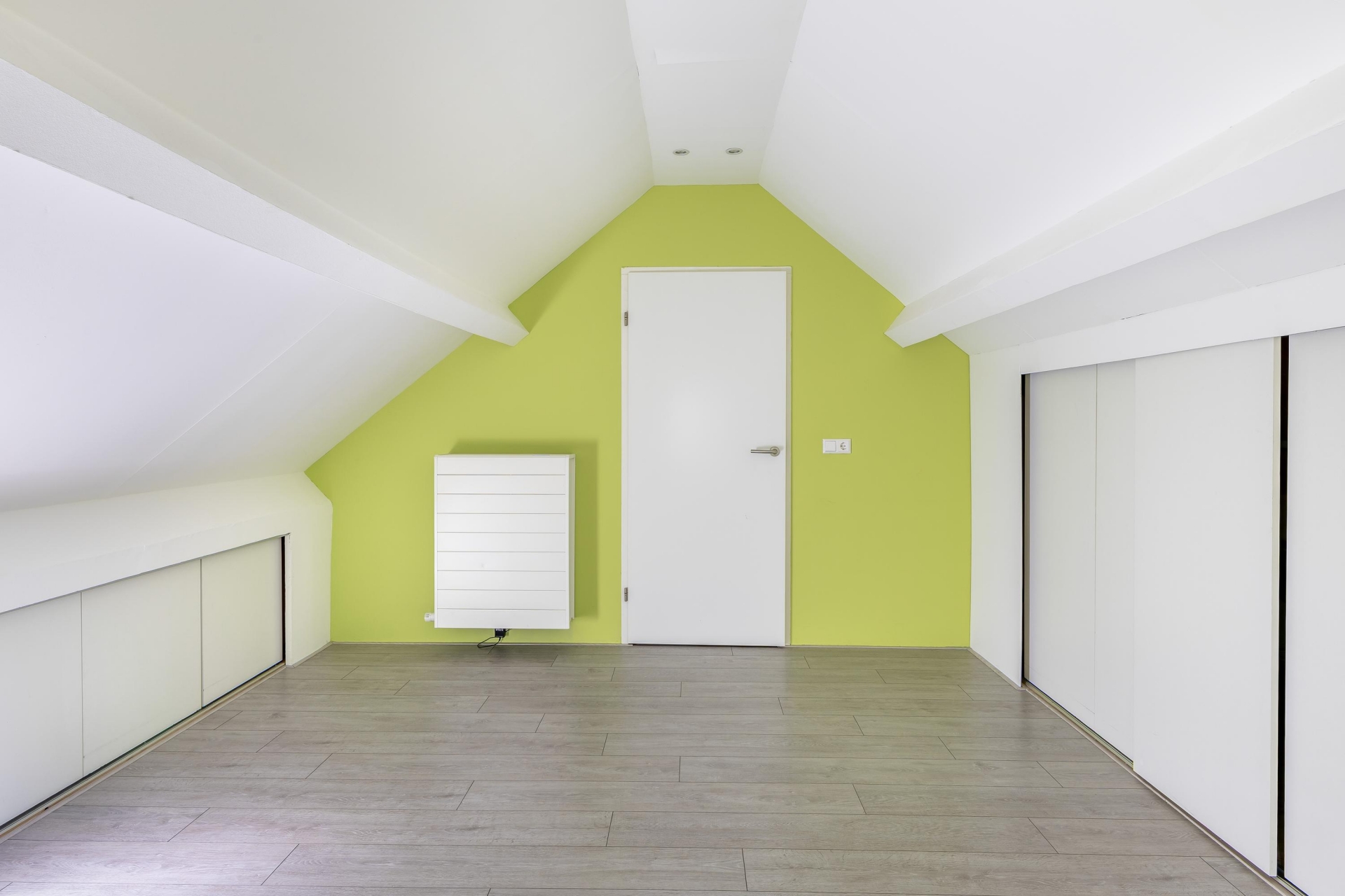 Overloop met bergruimte; 2 tal slaapkamers van respectievelijk circa 12 m2 en 7.9 m2. In de slaapkamers zijn lage temperatuur convectoren geplaatst.
