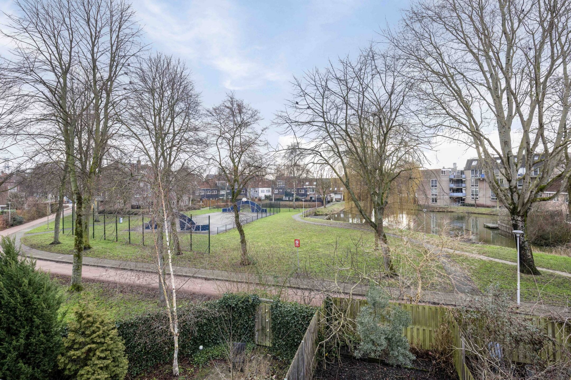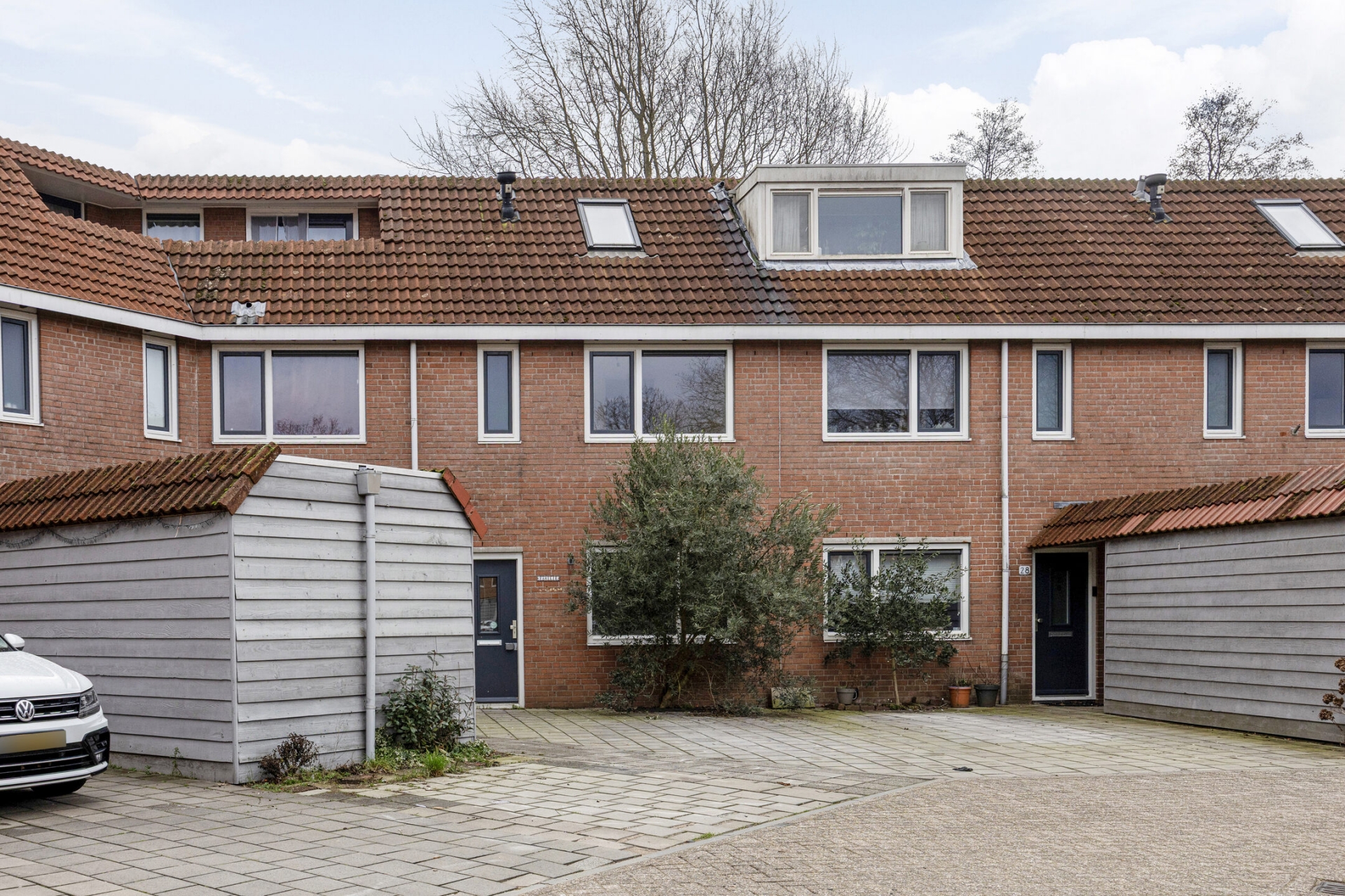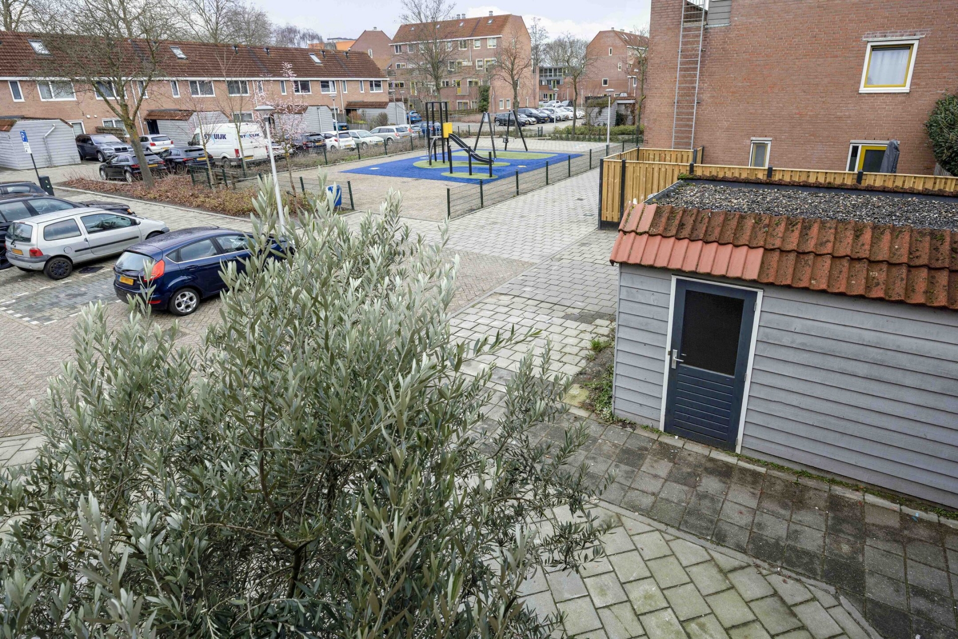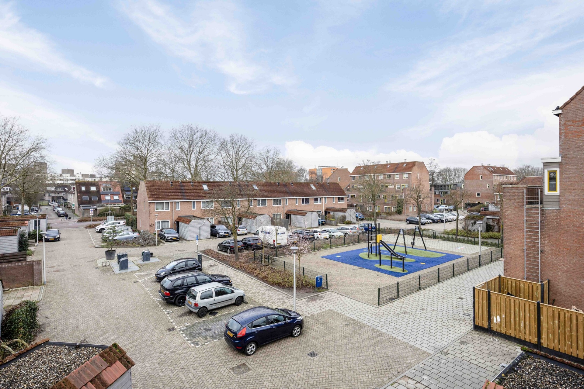 De voortuin biedt de mogelijkheid om op eigen terrein te parkeren. Dat is prettig thuiskomen: geen zoektocht naar een parkeerplek, maar gewoon je auto voor de deur. De straat zelf is rustig opgezet met veel gezinnen in de directe omgeving. Hier spelen kinderen nog gewoon buiten.