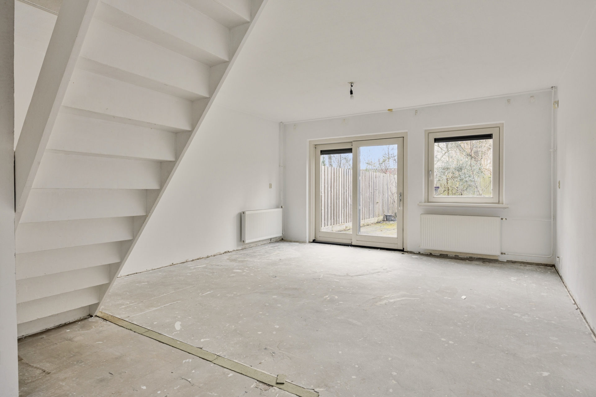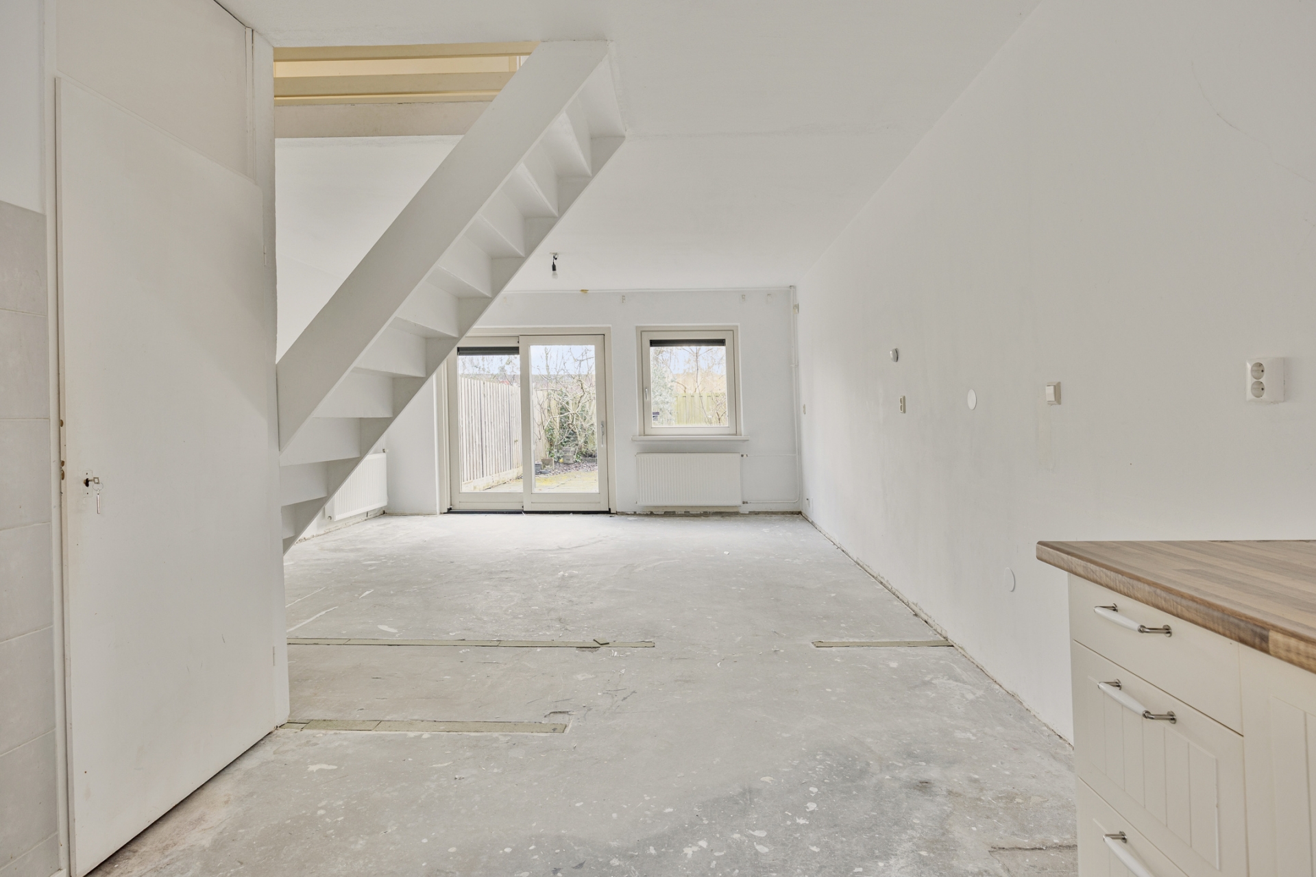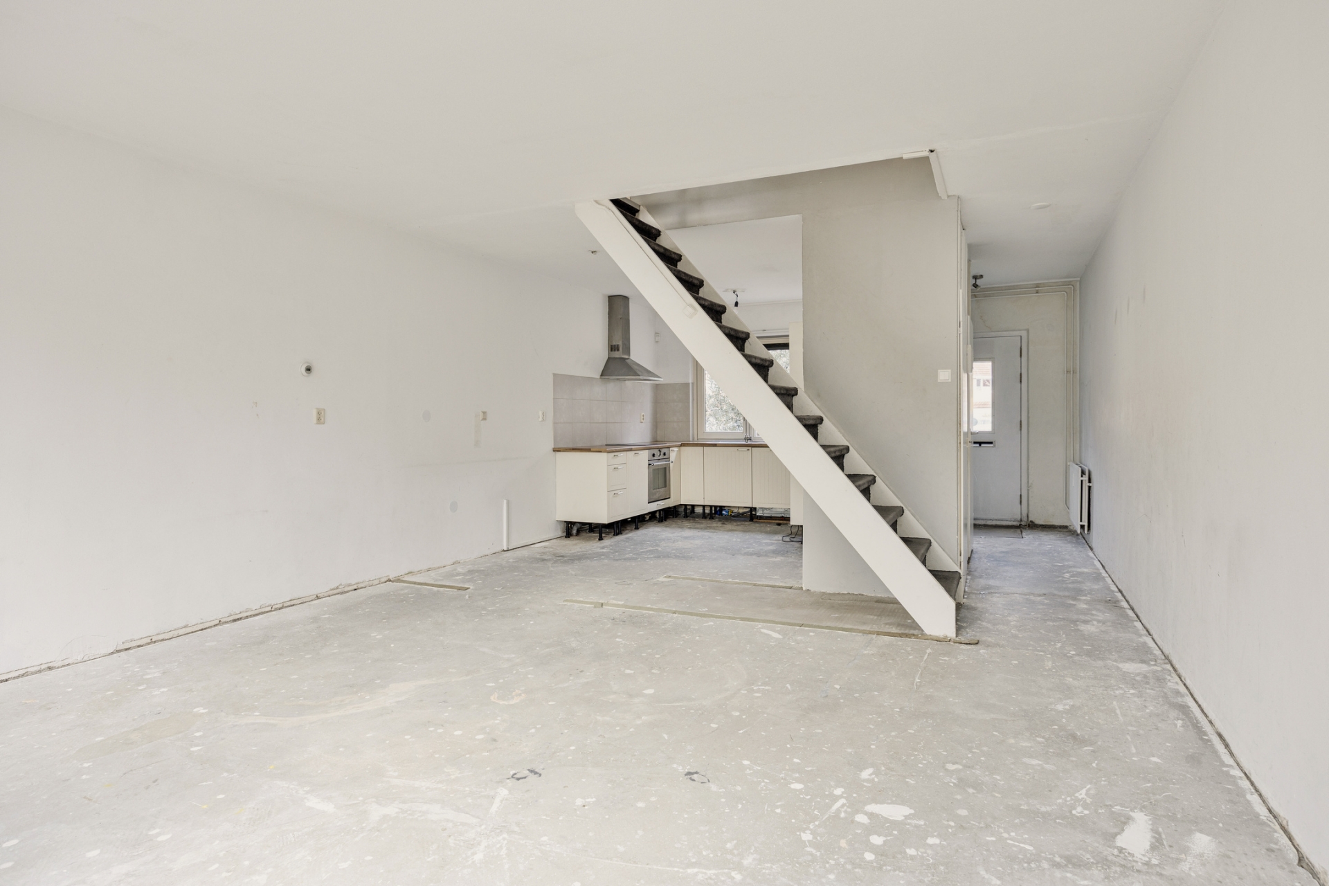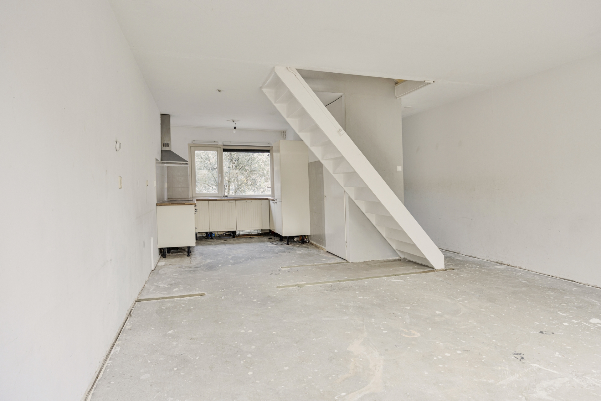 De open trap in de woonkamer zorgt voor een speels element in de ruimte. De huidige afwerking is eenvoudig, waardoor je hier echt jouw eigen stijl kunt doorvoeren. Zie je het al voor je? Een warme houten vloer, strak gestucte wanden en een moderne leefkeuken aan de voorzijde.