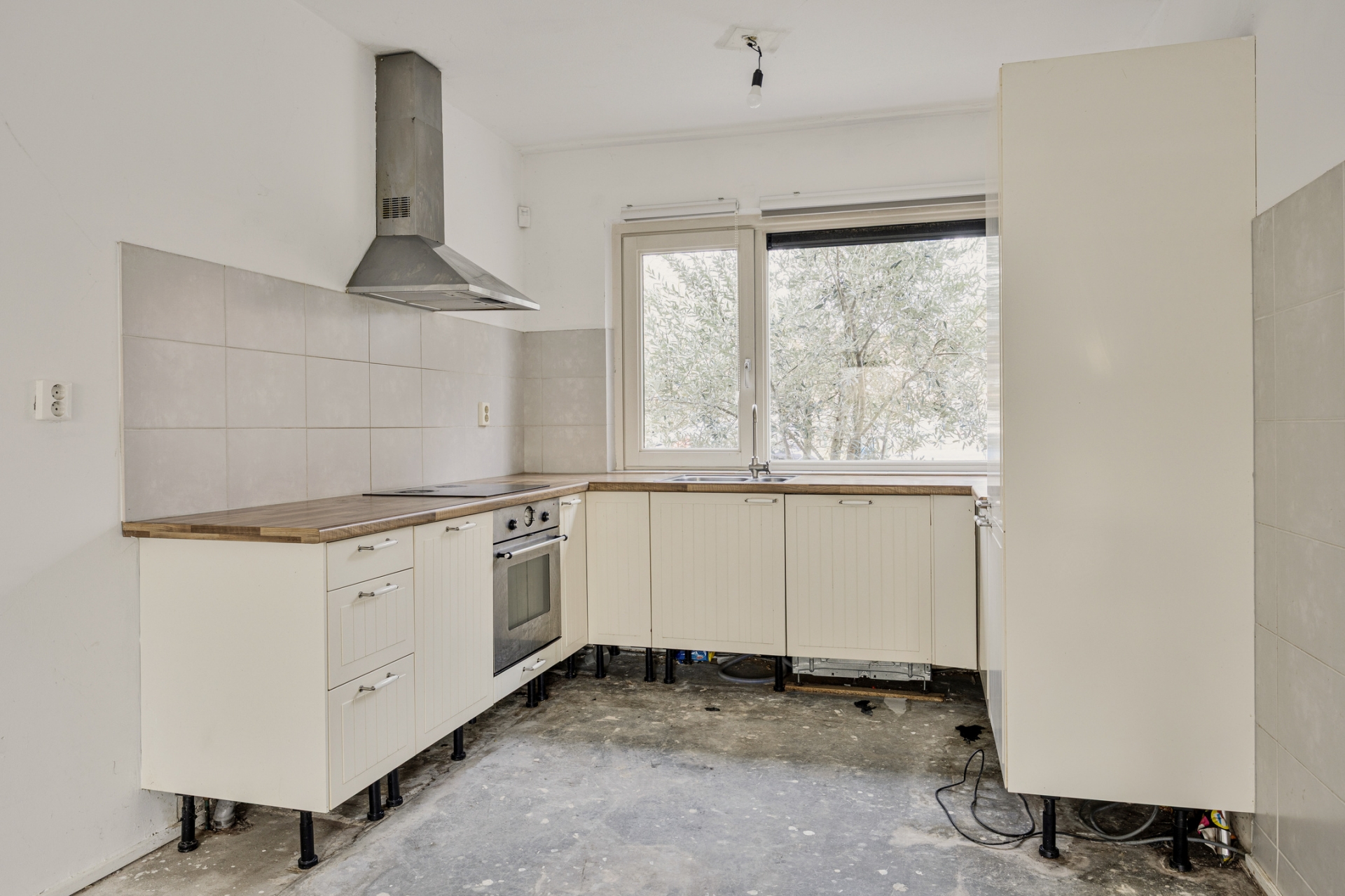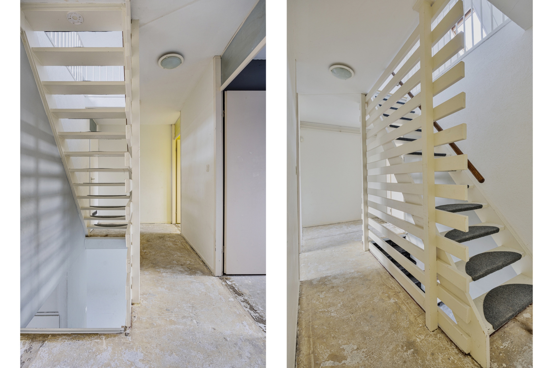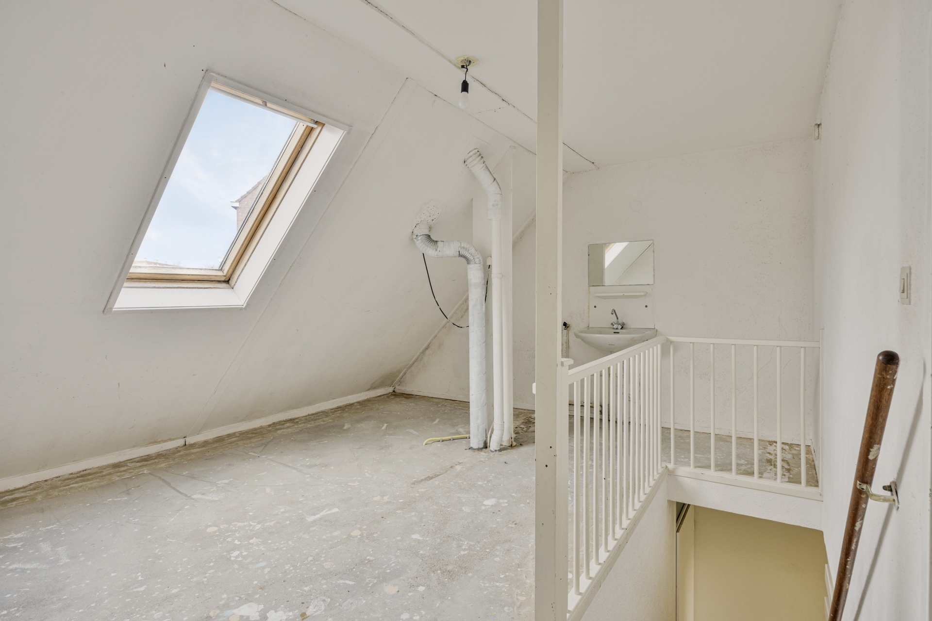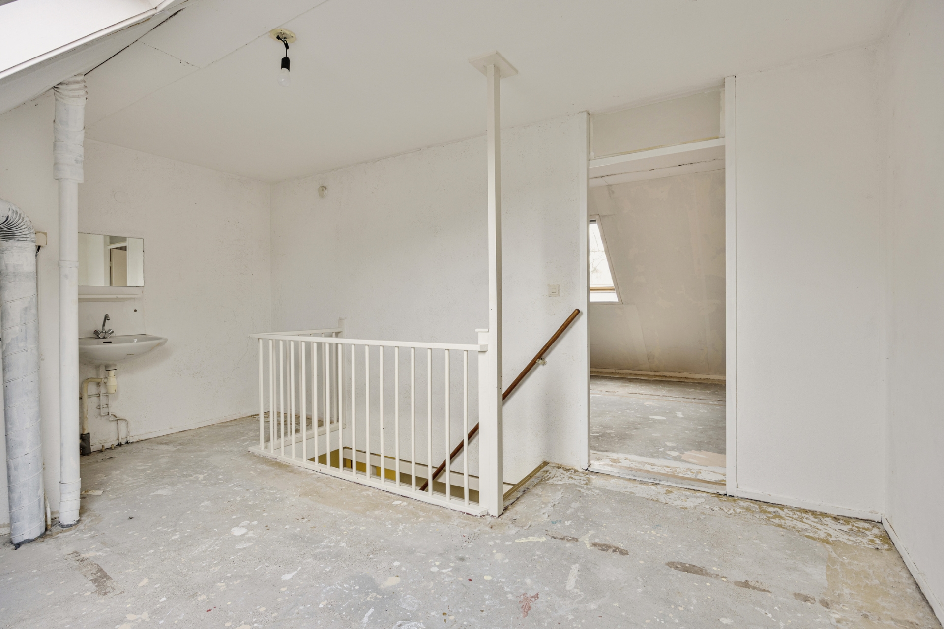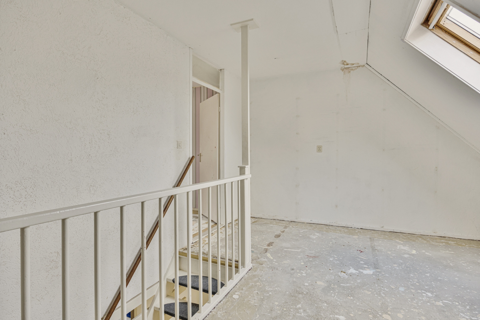 De open trap in de woonkamer zorgt voor een speels element in de ruimte. De huidige afwerking is eenvoudig, waardoor je hier echt jouw eigen stijl kunt doorvoeren. Zie je het al voor je? Een warme houten vloer, strak gestucte wanden en een moderne leefkeuken aan de voorzijde.