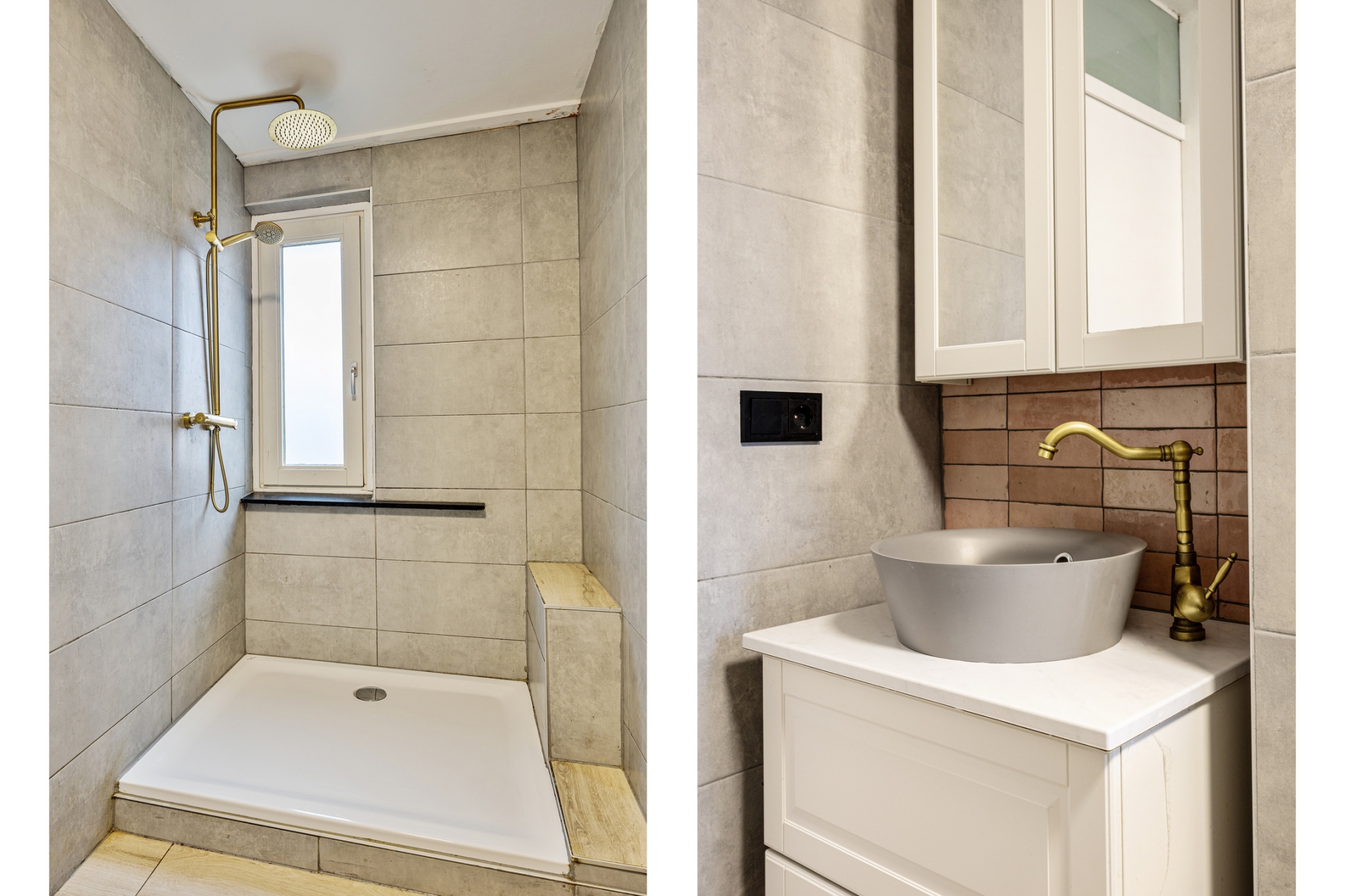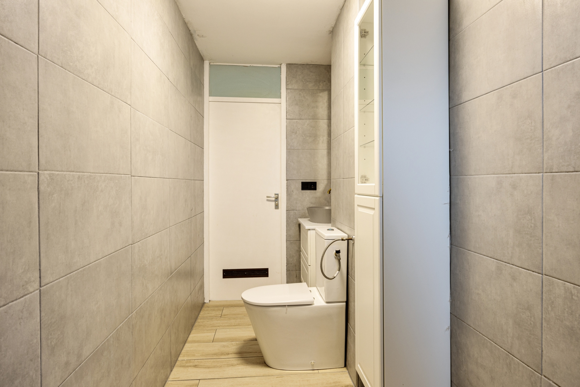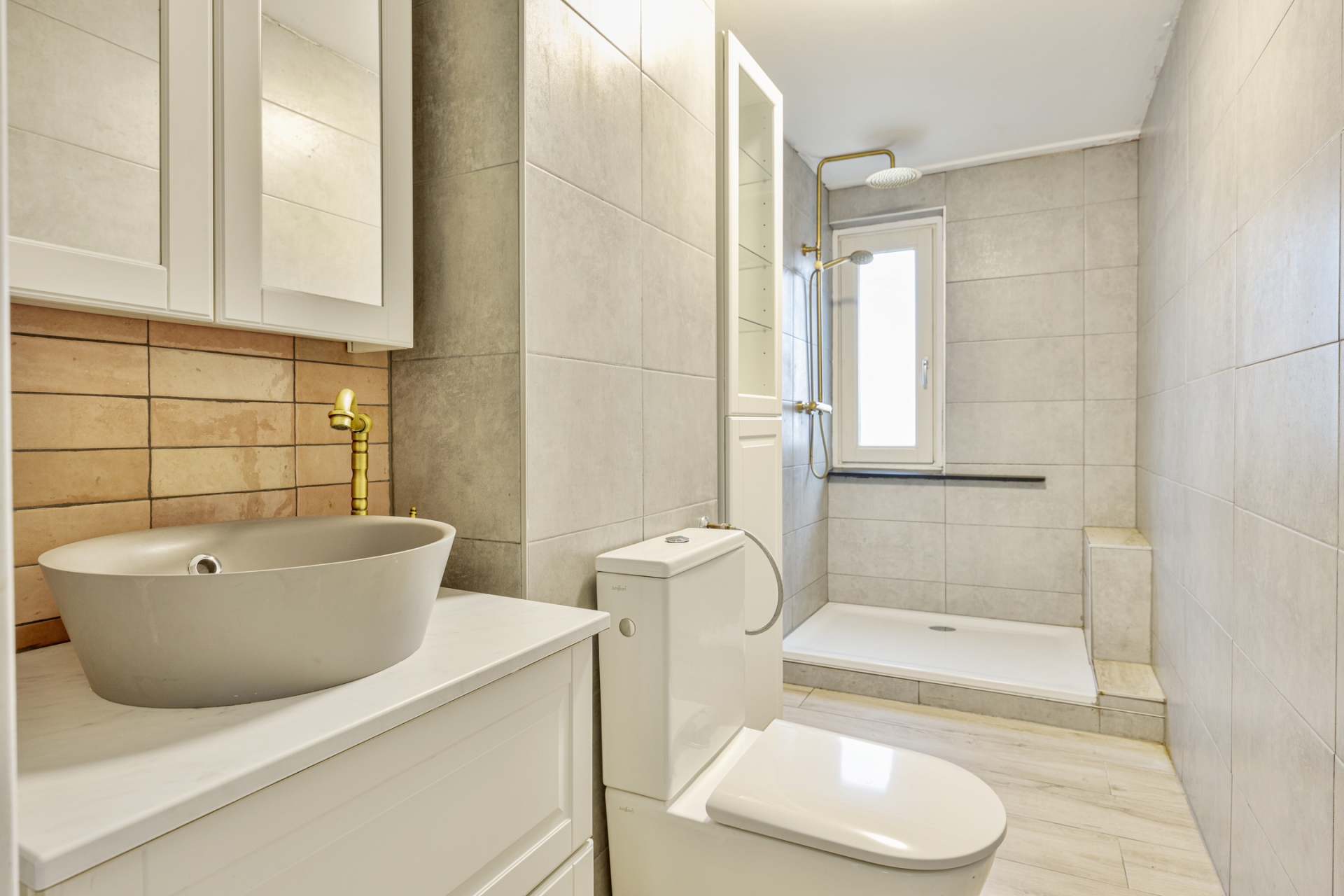 De badkamer is modern uitgevoerd met groot formaat tegels, een inloopdouche, toilet en een stijlvol wastafelmeubel. Het raam zorgt voor prettig daglicht en natuurlijke ventilatie. Hier hoef je weinig aan te doen.
