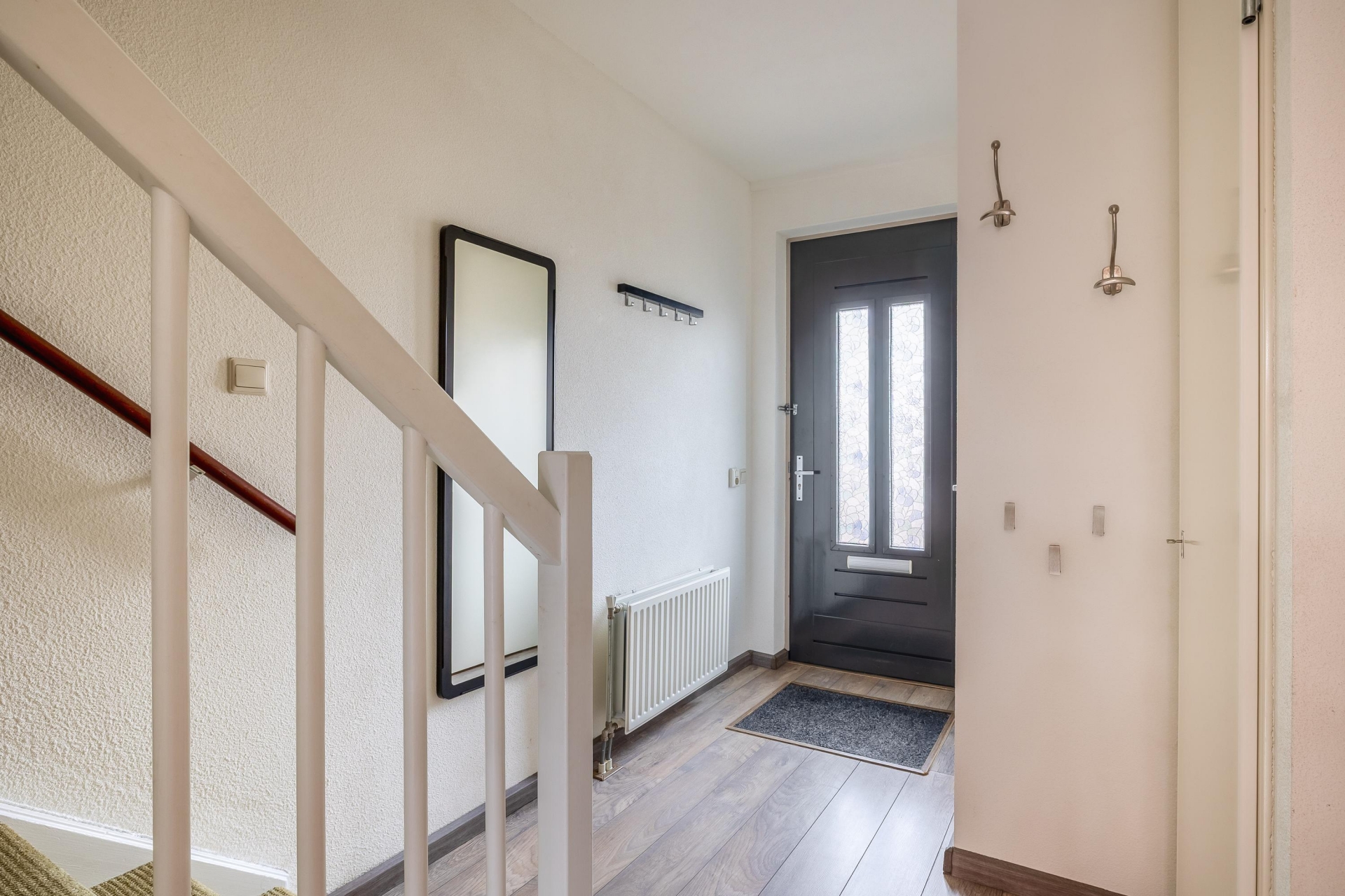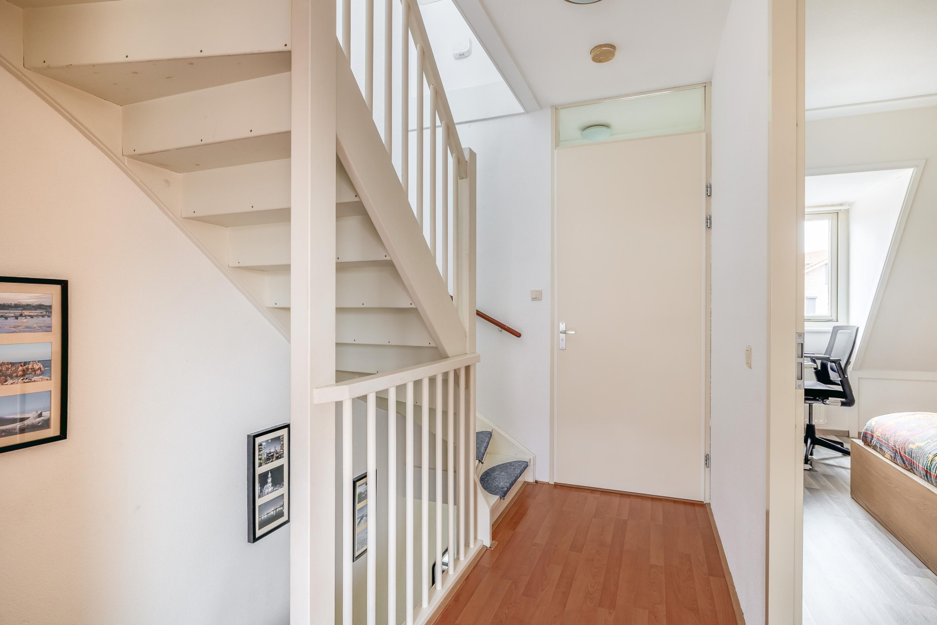 De overloop geeft toegang tot twee slaapkamers en de badkamer.