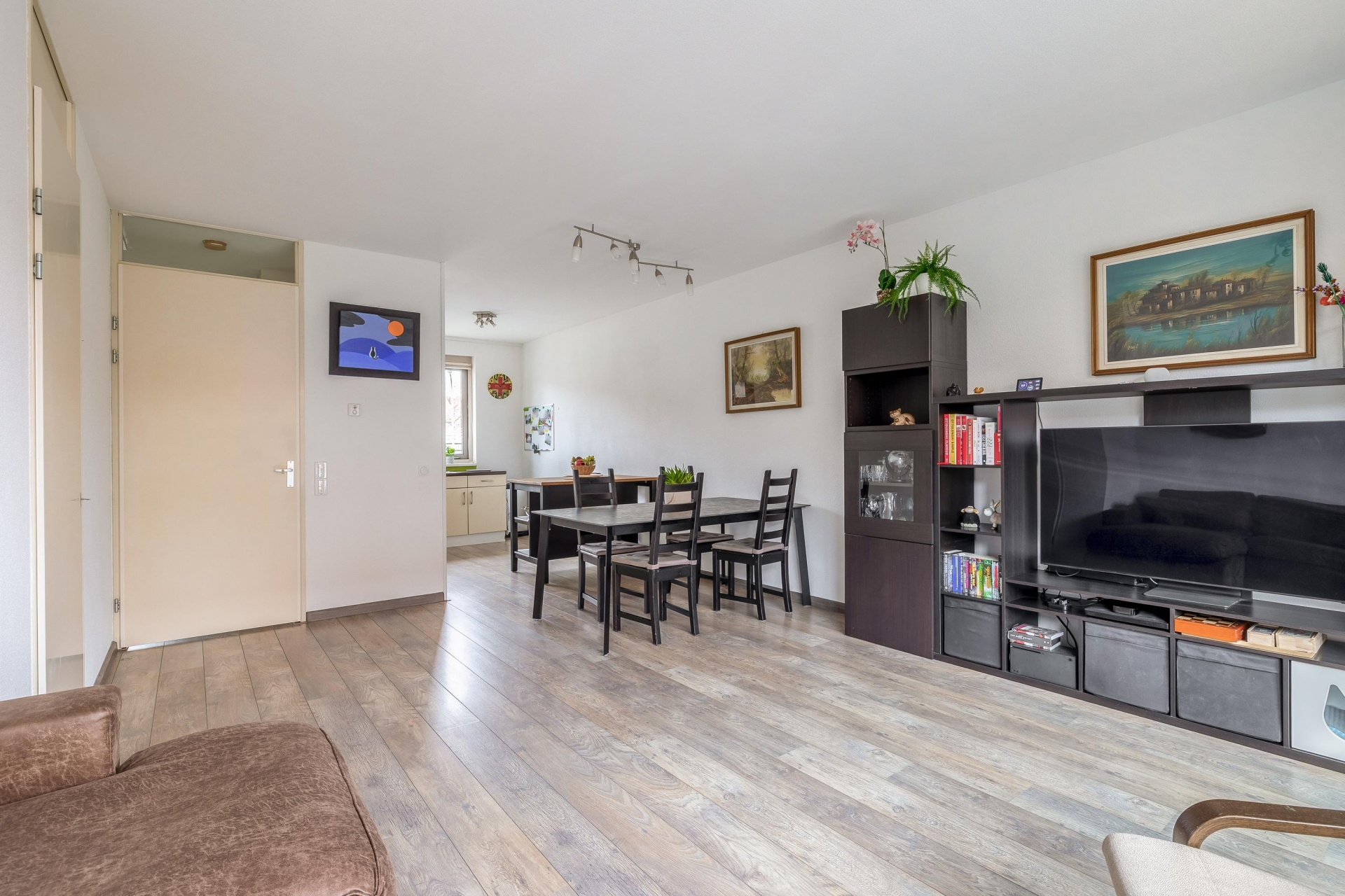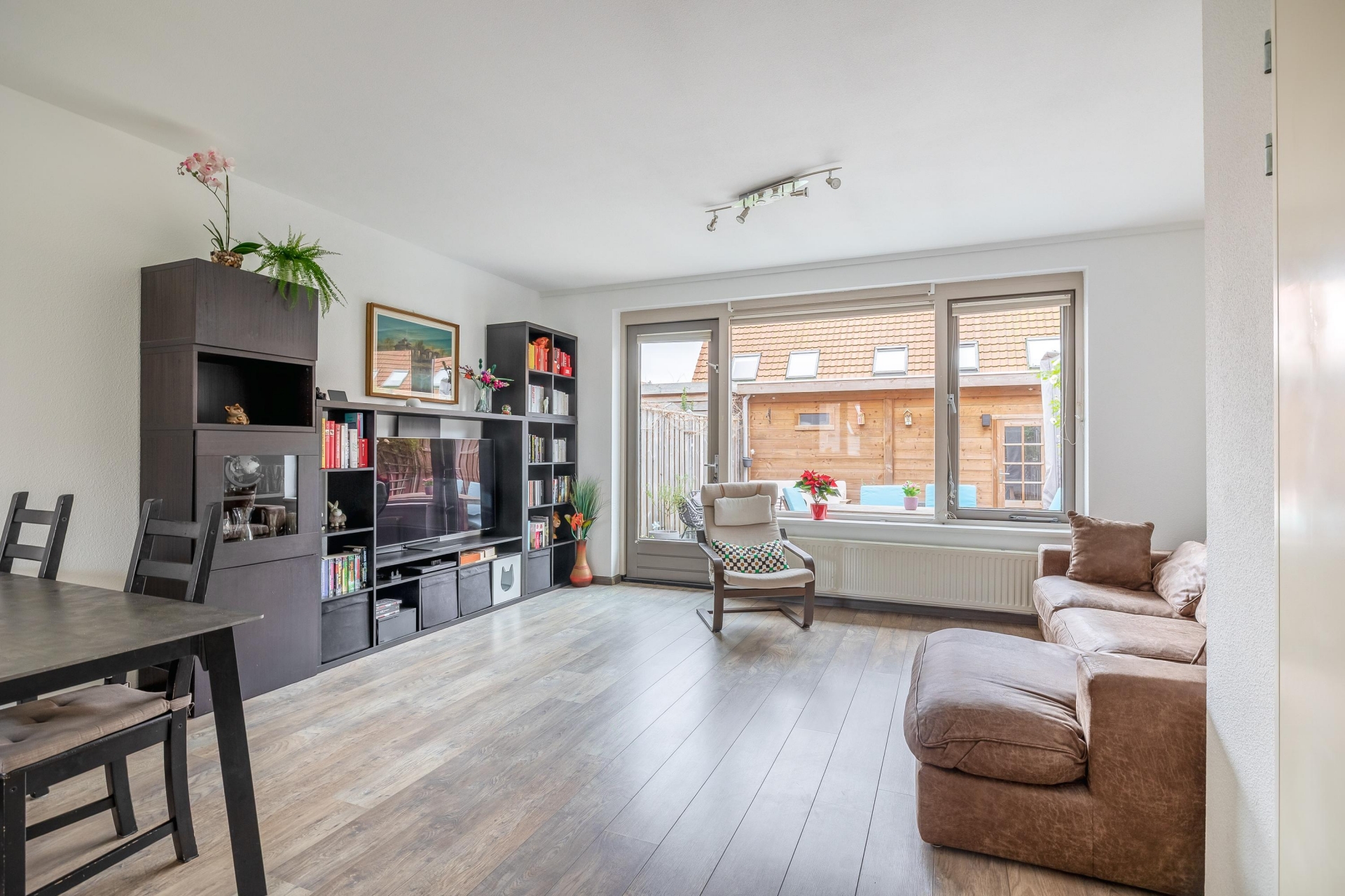 Via de entree met hal, meterkast en toilet met fonteintje betreedt u de lichte woonkamer. De woonkamer biedt volop ruimte voor een comfortabele zithoek en een eethoek en heeft directe toegang tot de zonnige achtertuin.