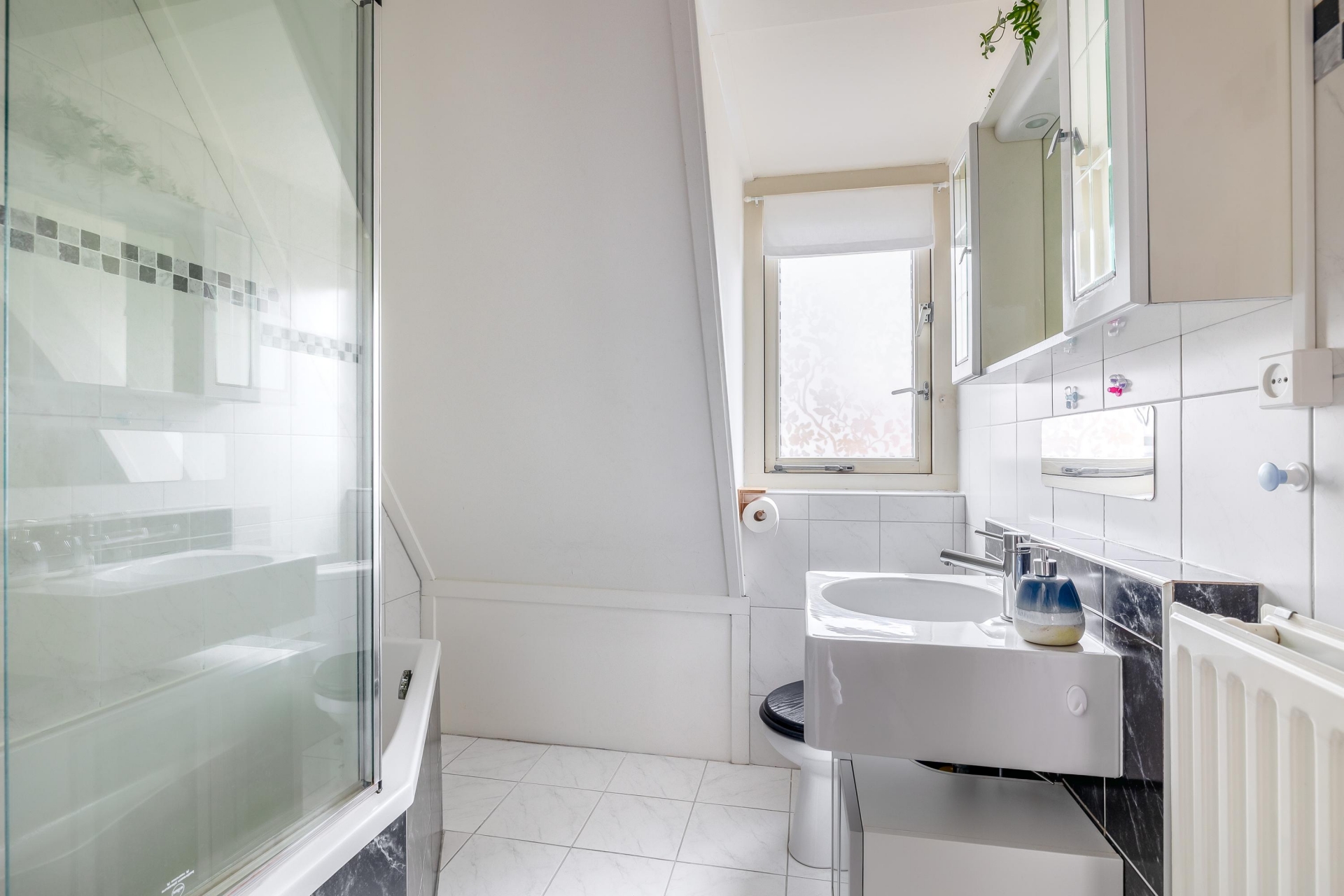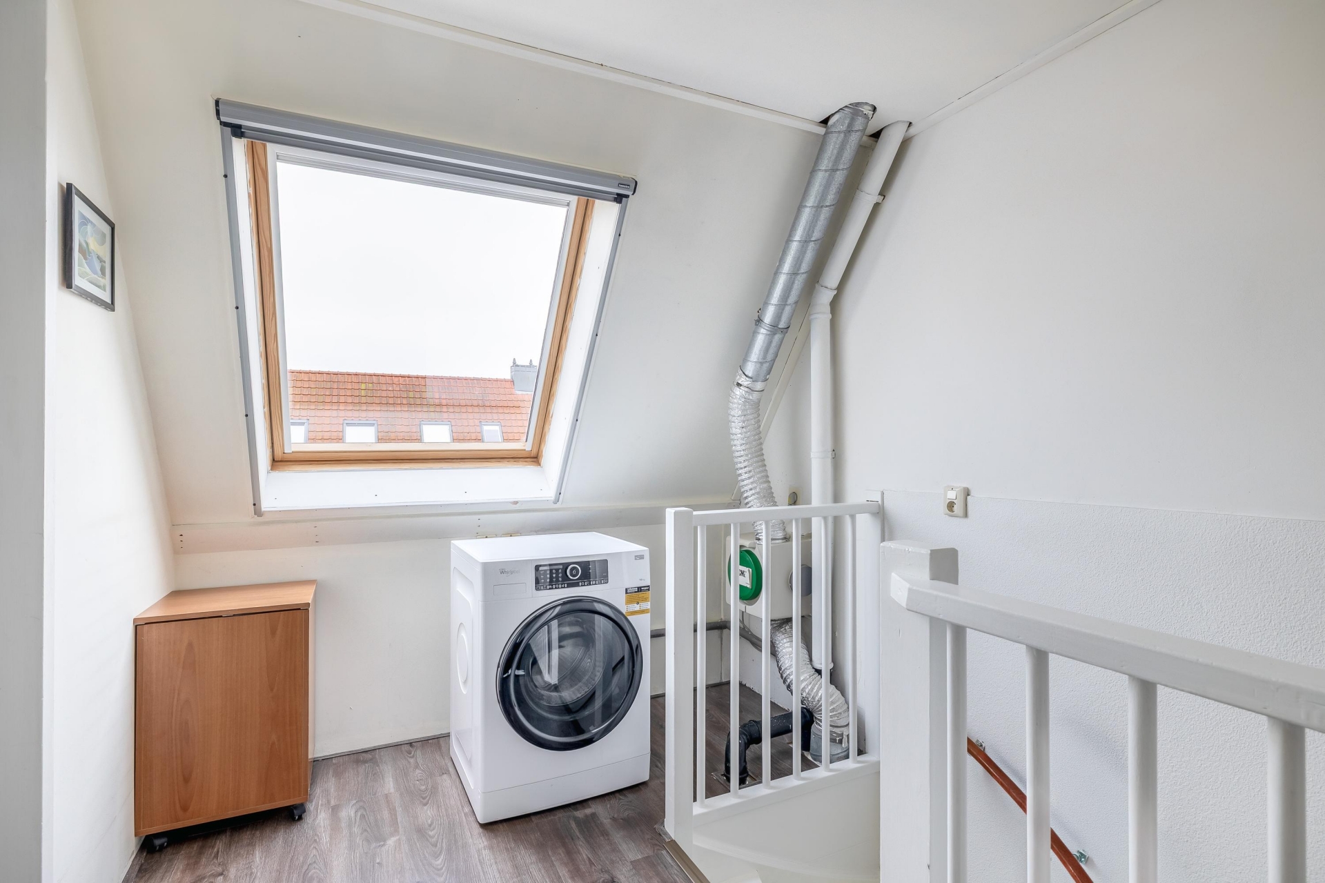 Via de vaste trap bereikt u de tweede verdieping. Op de overloop met dakvenster bevinden zich de technische installaties, waaronder de CV-combiketel en de aansluitingen voor de wasmachine en droger.