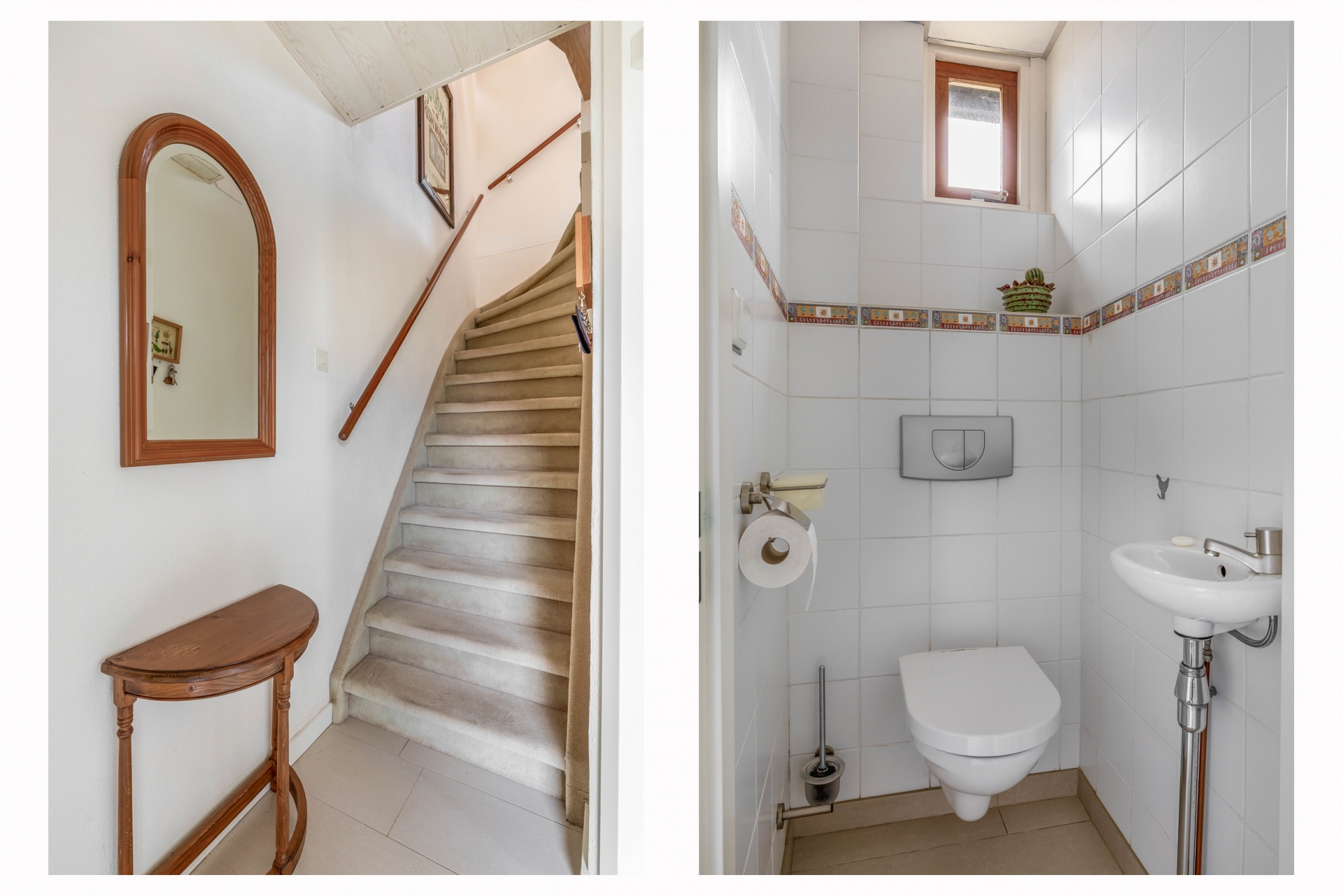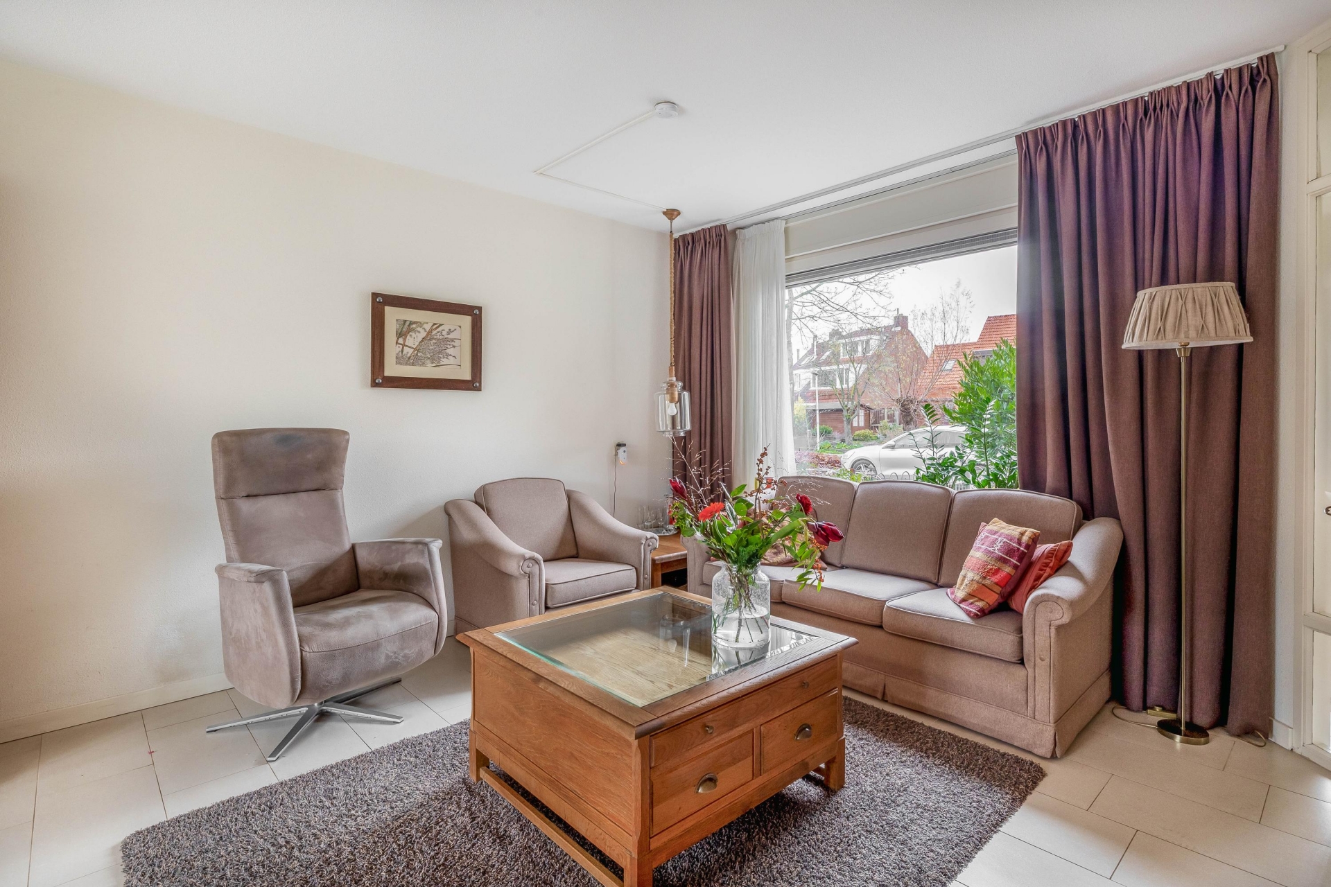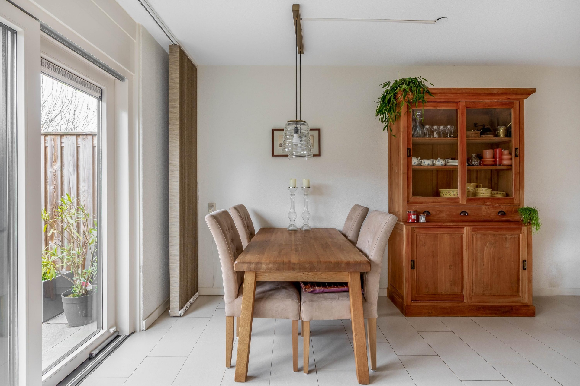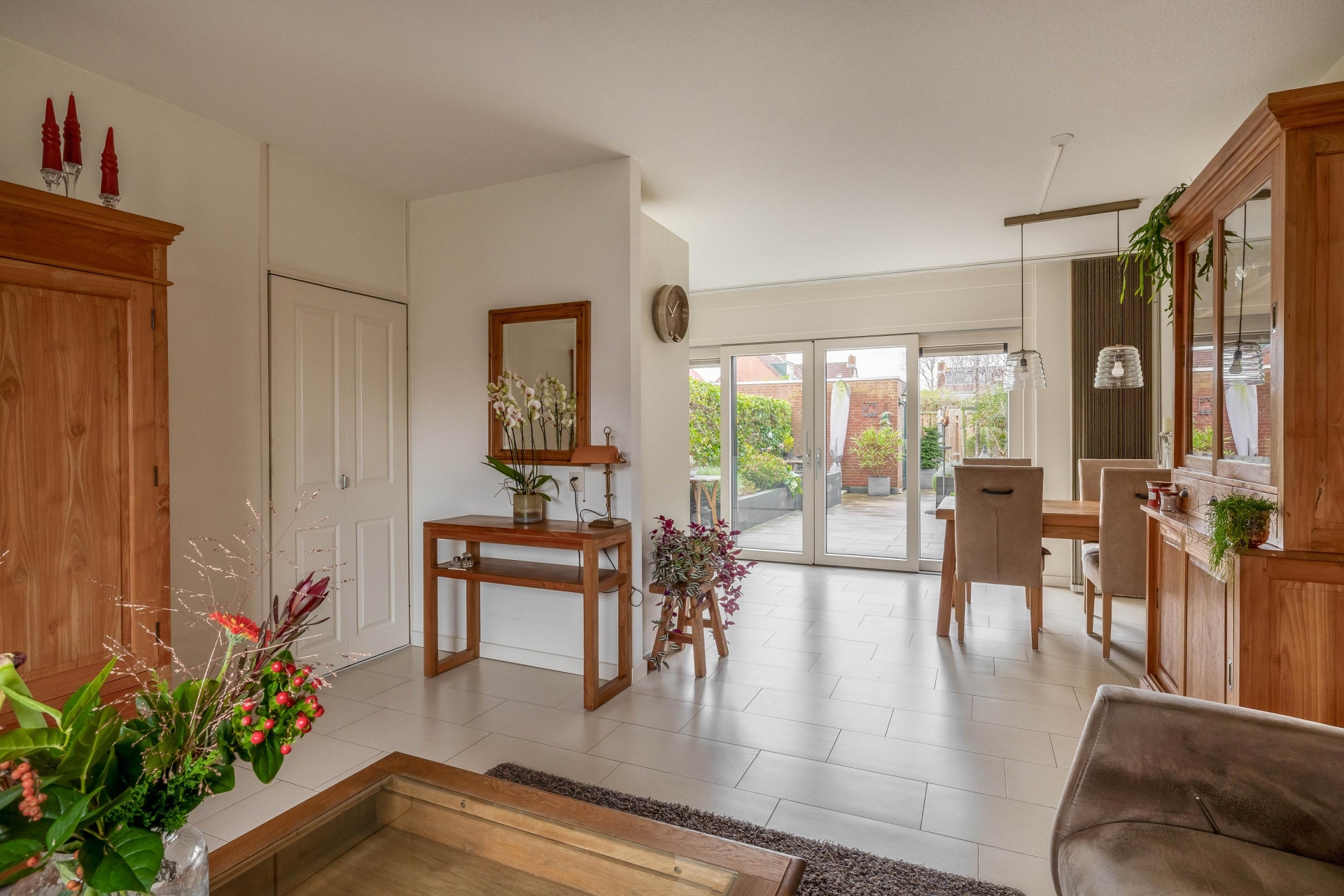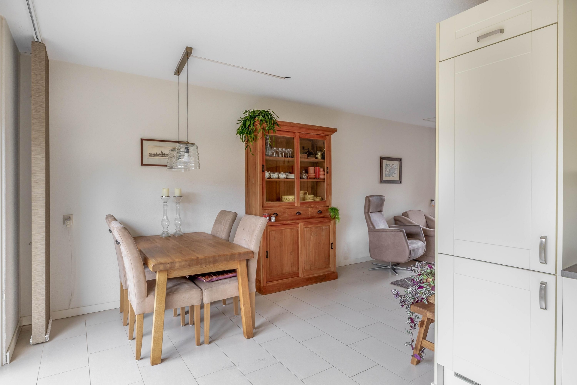 Je komt binnen in een nette hal met modern toilet, trapopgang en toegang tot de woonkamer. De living is licht, ruim en heeft een prettige indeling met een open verbinding naar de eetkamer en keuken. Grote ramen en een schuifpui aan de tuinzijde zorgen voor veel natuurlijk licht. De vloer is voorzien van lichte tegels en vloerverwarming, wat zorgt voor een strak en comfortabel geheel.
