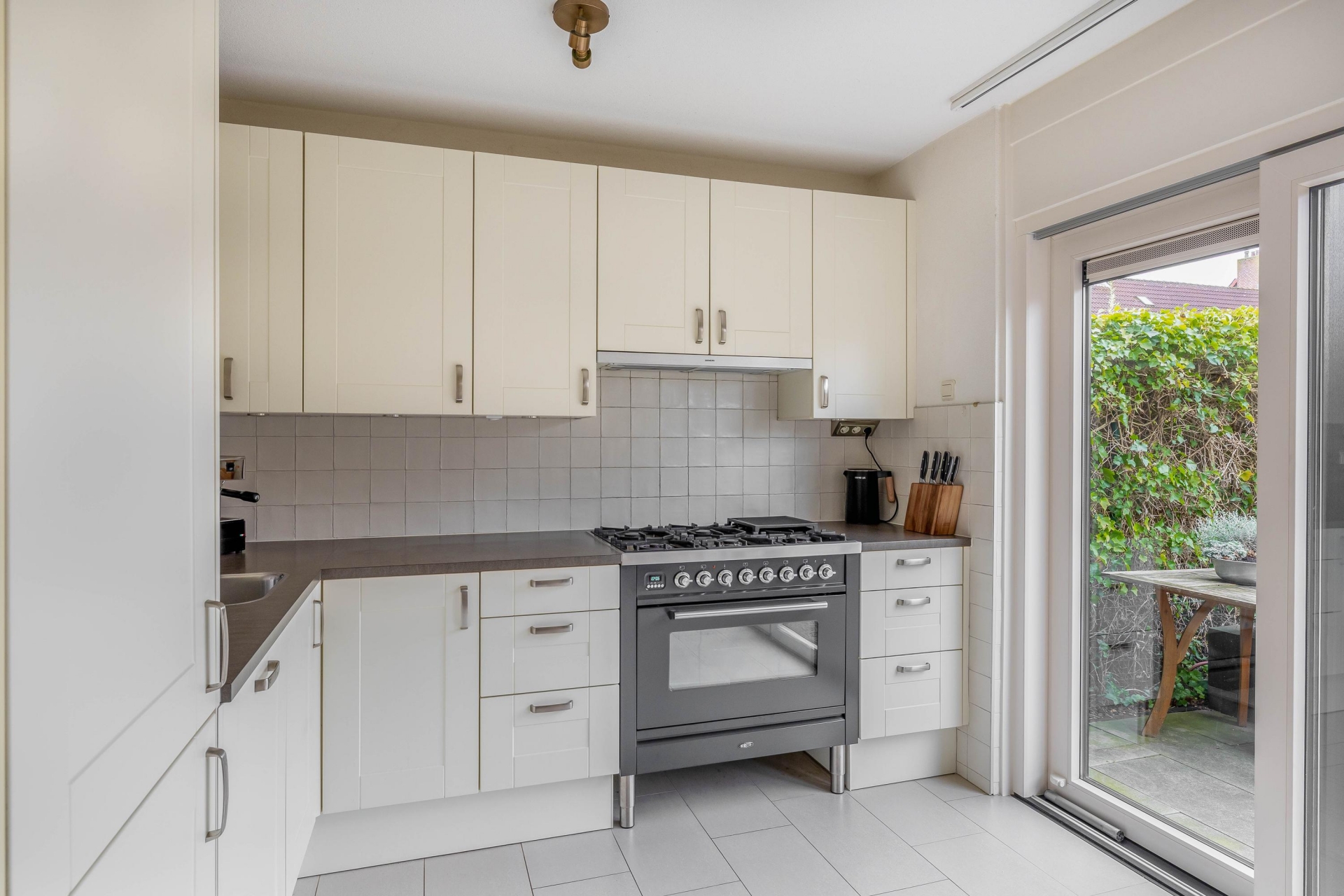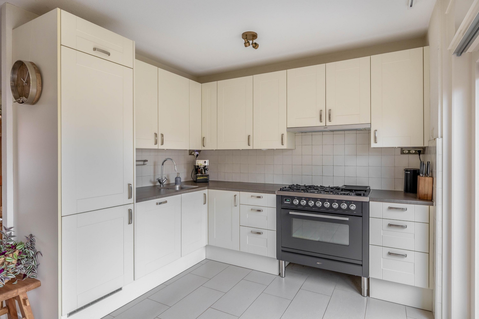 De open keuken is modern en strak uitgevoerd met een donker werkblad en een vrijstaand 6-pits gasfornuis met oven. Daarnaast is er een vaatwasser, koelkast en vriezer aanwezig. Vanuit de keuken kijk je uit op de achtertuin – handig als je kookt terwijl de kinderen buiten spelen.