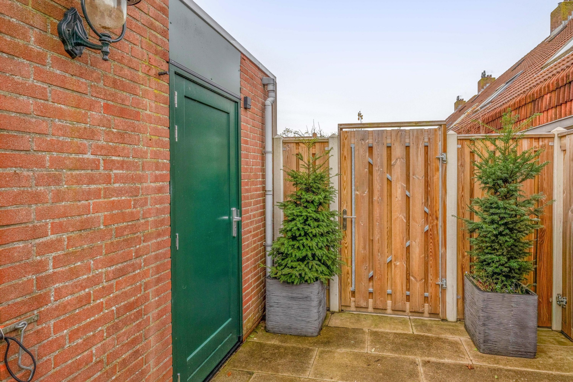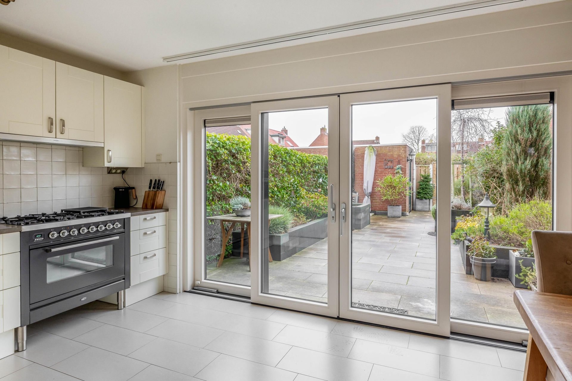 Via de schuifpui loop je zo de zonnige achtertuin in, gelegen op het zuidwesten. Hier zit je tot laat in de middag heerlijk in de zon. De tuin is keurig aangelegd met grote terrastegels, groene borders en een vrijstaande stenen berging met elektra. Door de achterom is de tuin ook makkelijk bereikbaar voor fietsen of tuinspullen.