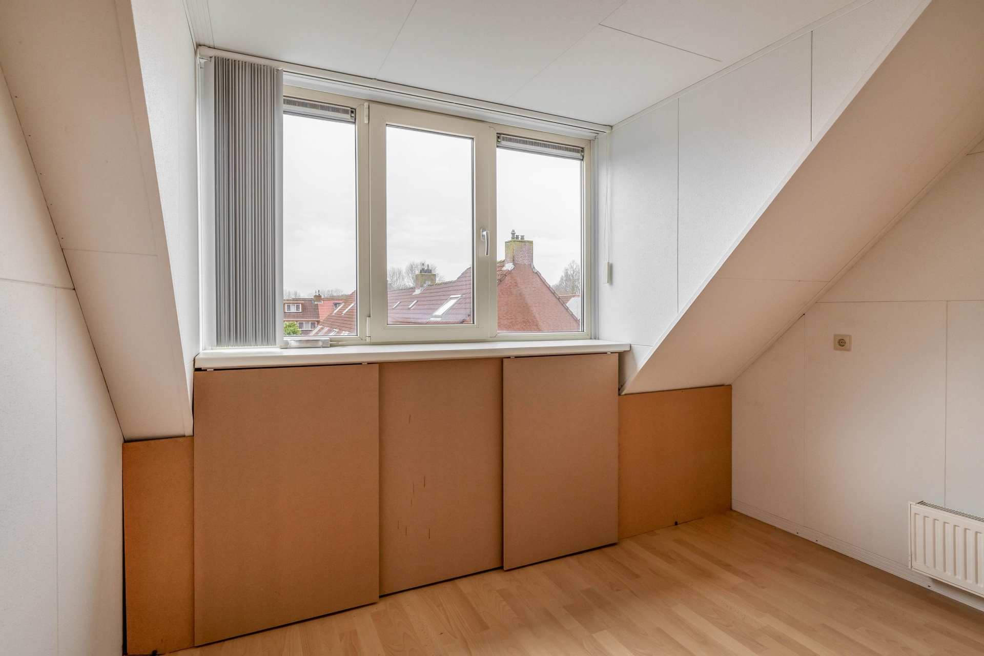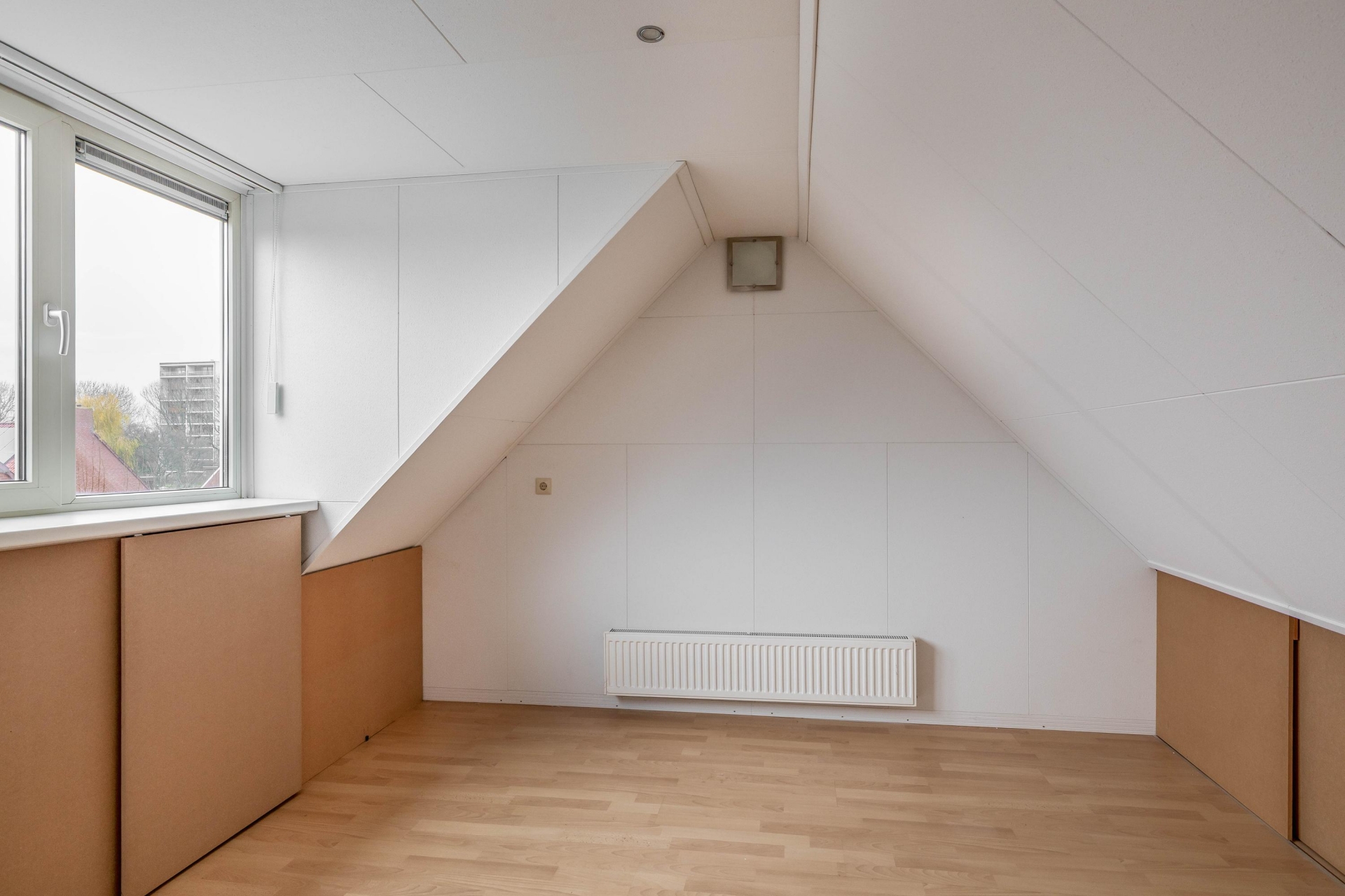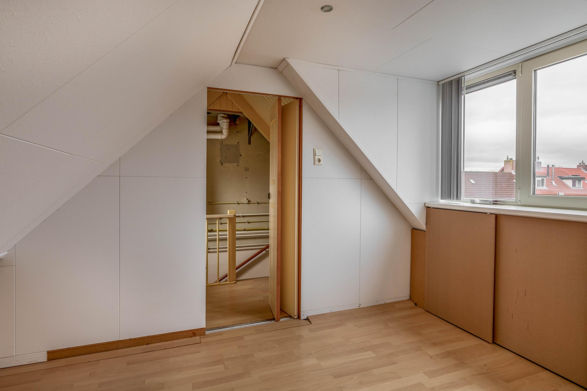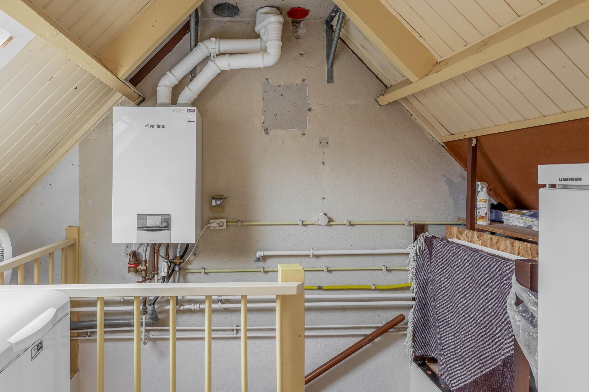 De tweede verdieping is bereikbaar via een vaste trap. Hier vind je de derde slaapkamer, voorzien van een tweede dakkapel en handige bergruimte achter de knieschotten. Op de overloop is ook de opstelplaats van de CV-ketel (Vaillant HR uit 2022, eigendom) en de wasmachine.