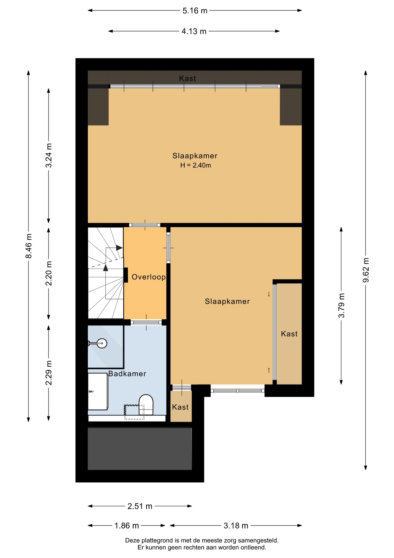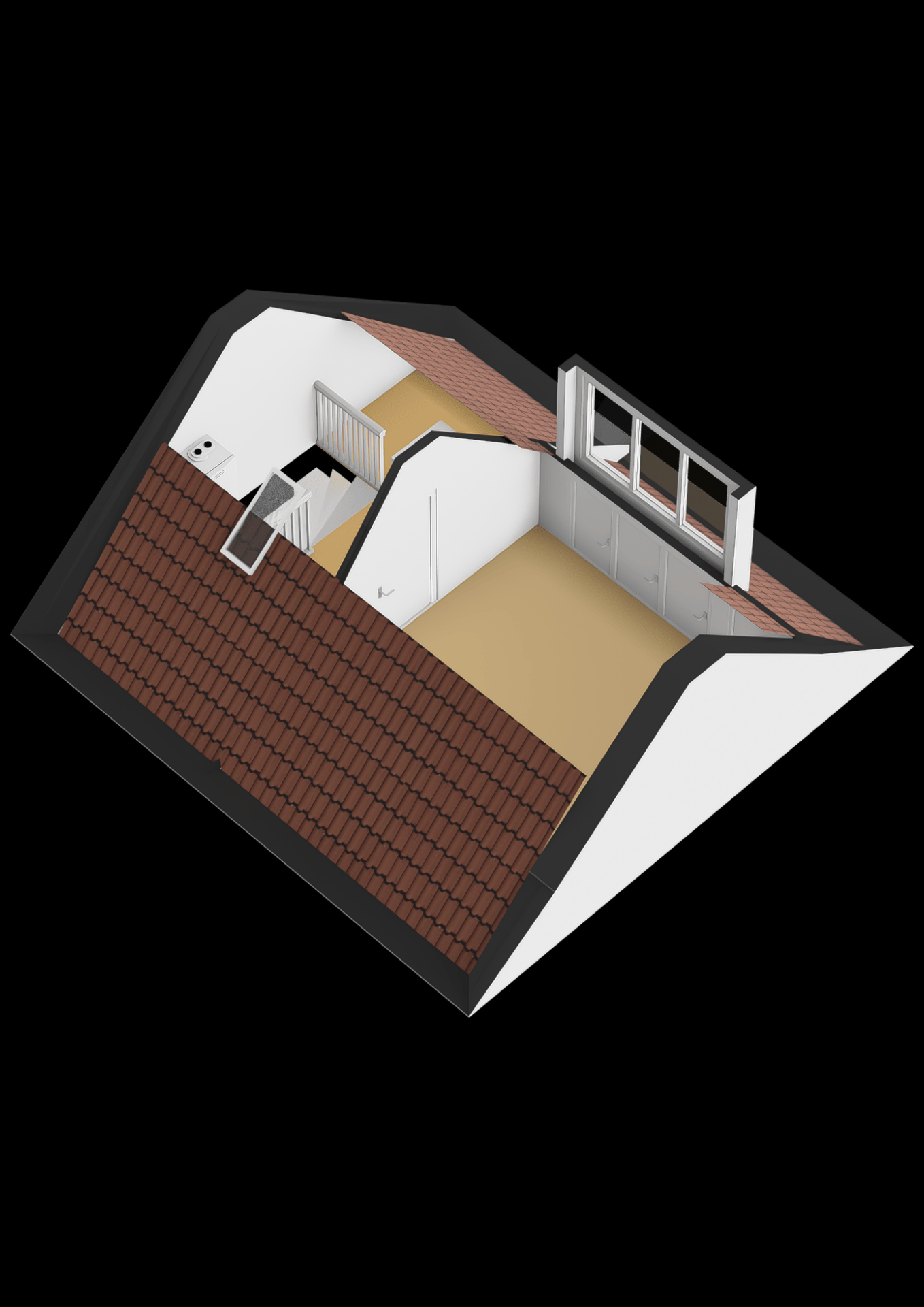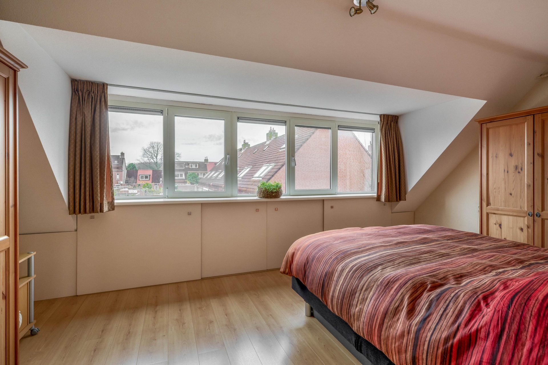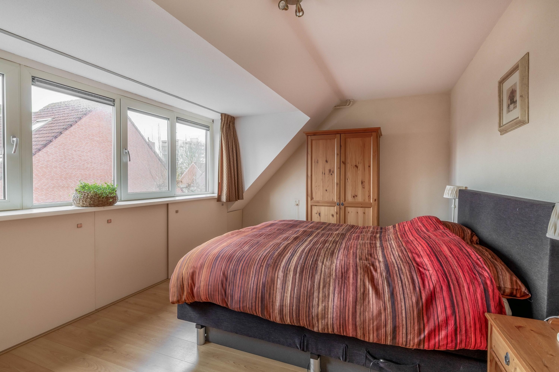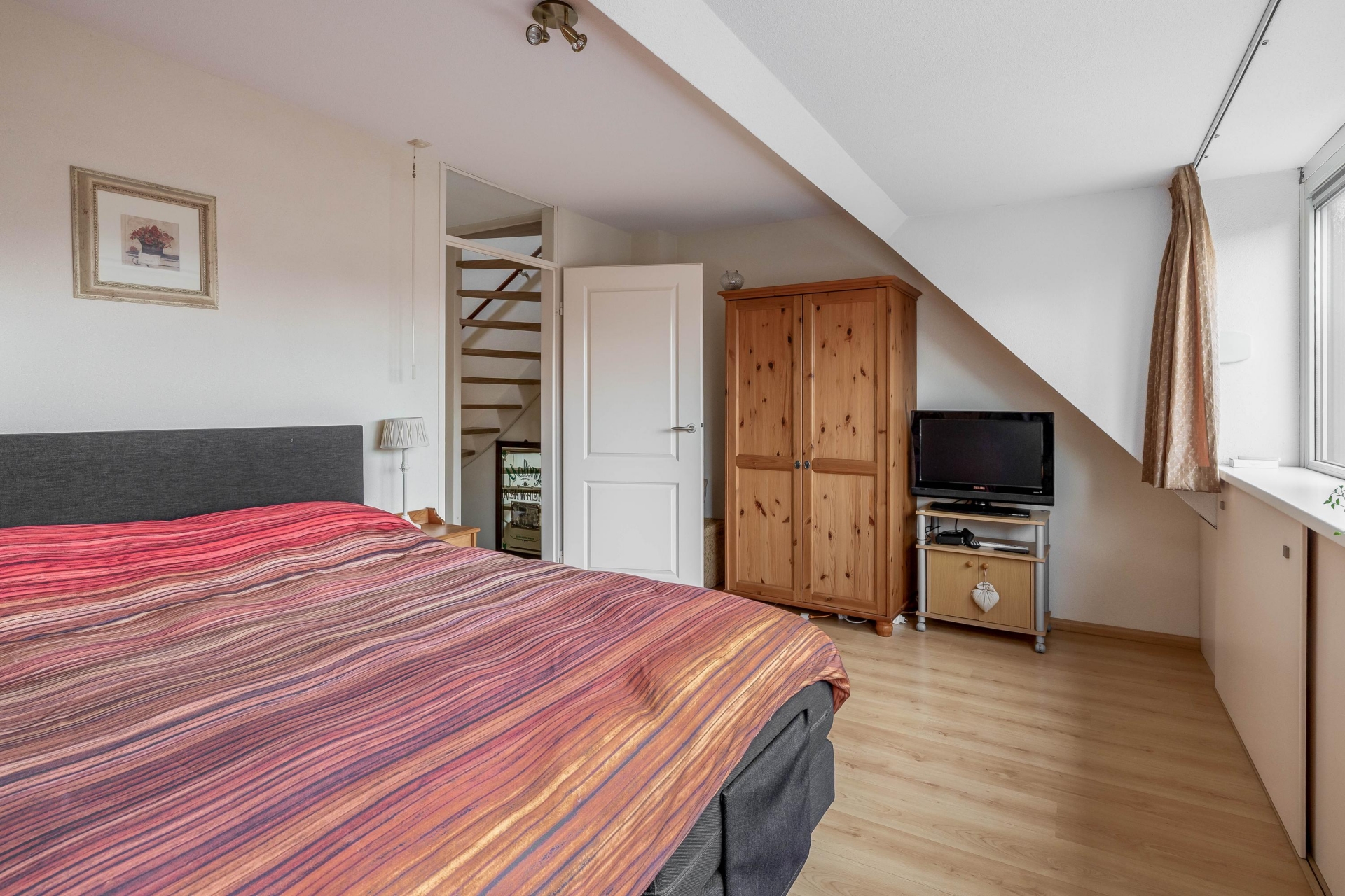 De tweede verdieping is bereikbaar via een vaste trap. Hier vind je de derde slaapkamer, voorzien van een tweede dakkapel en handige bergruimte achter de knieschotten. Op de overloop is ook de opstelplaats van de CV-ketel (Vaillant HR uit 2022, eigendom) en de wasmachine.