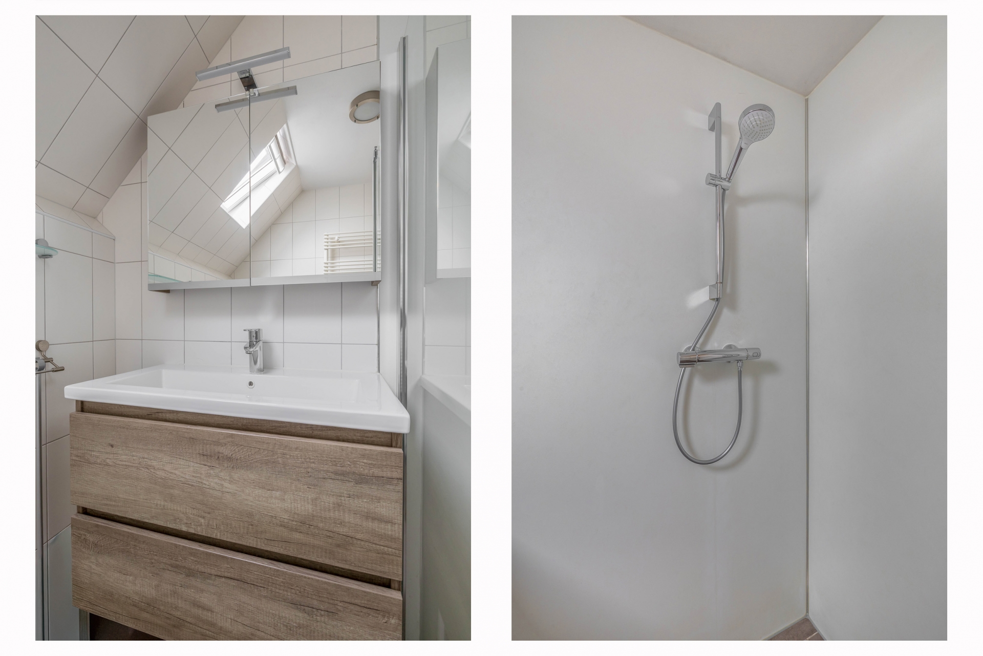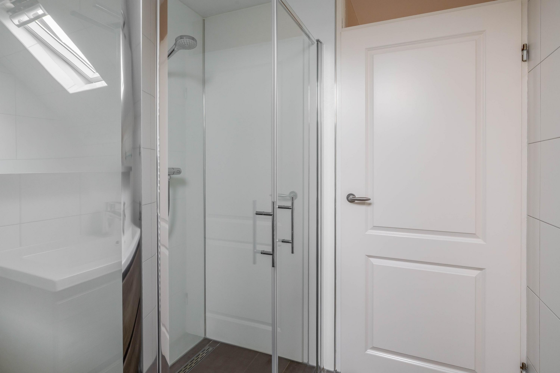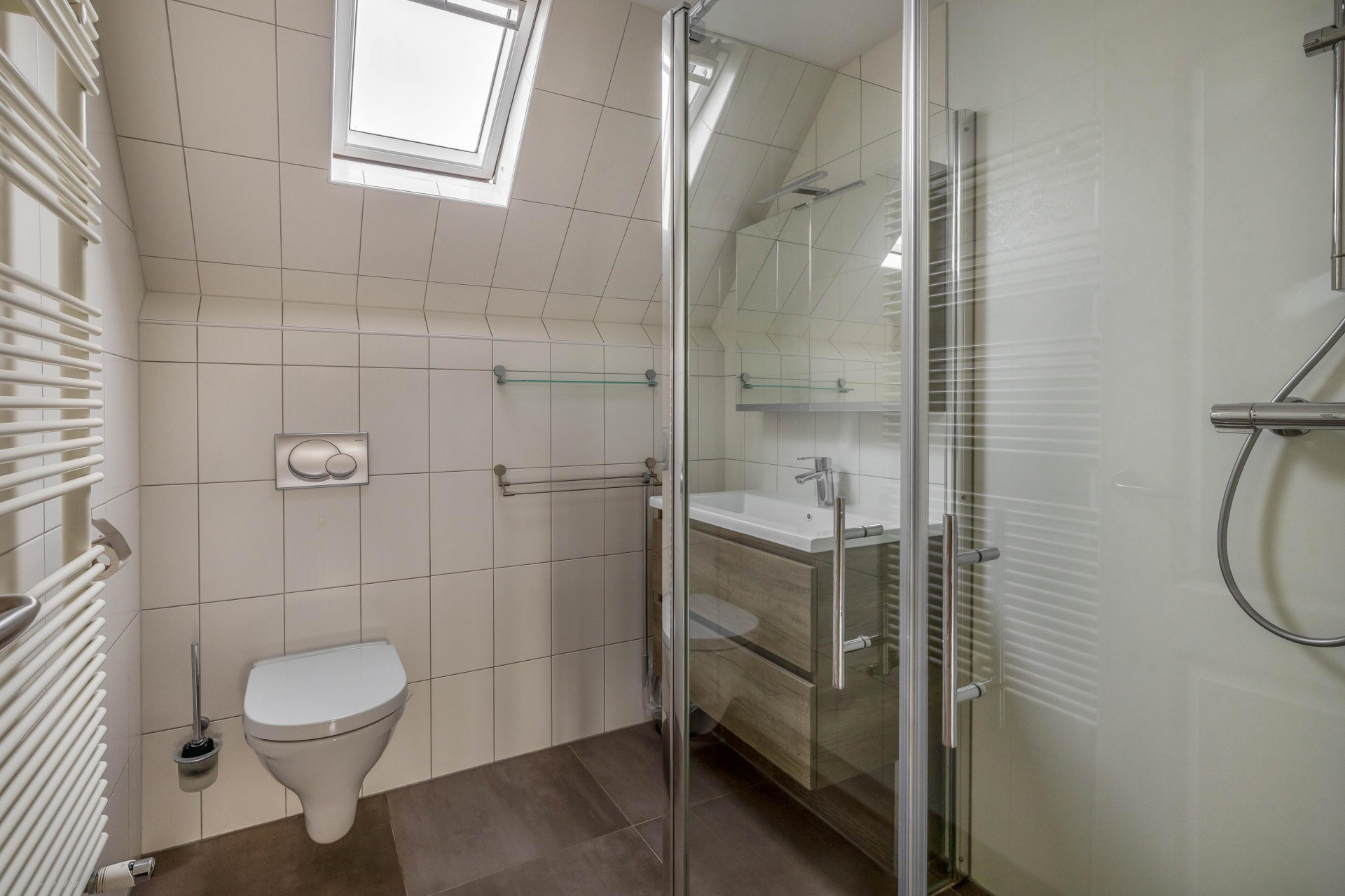Op de eerste verdieping vind je twee slaapkamers, waaronder een royale master bedroom aan de achterzijde met een brede dakkapel. De tweede slaapkamer aan de voorzijde is eveneens van goed formaat en beschikt over veel lichtinval. De badkamer is modern uitgevoerd met een inloopdouche, wastafelmeubel, tweede toilet, designradiator en een dakraam voor natuurlijke ventilatie.