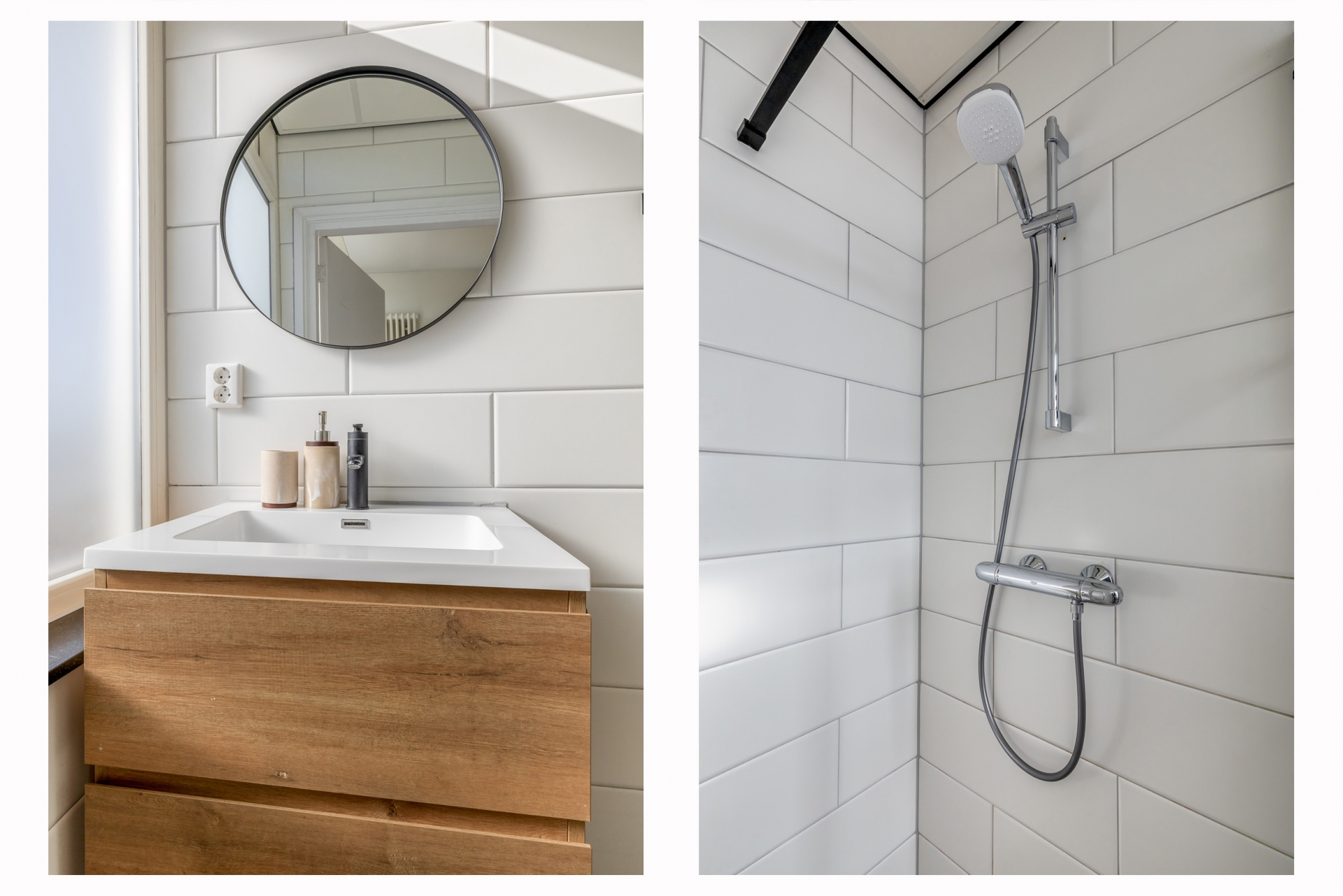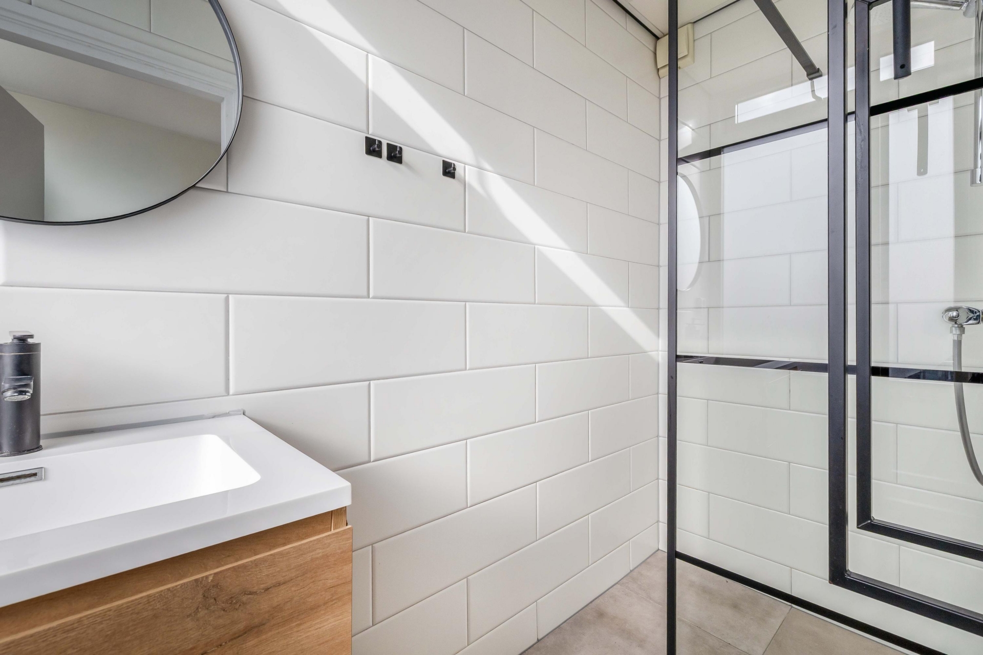 De badkamer is netjes afgewerkt en heeft een moderne uitstraling. De combinatie van strakke tegels, een inloopdouche en een stijlvol wastafelmeubel zorgt voor een frisse en verzorgde ruimte waar je zo gebruik van kunt maken.