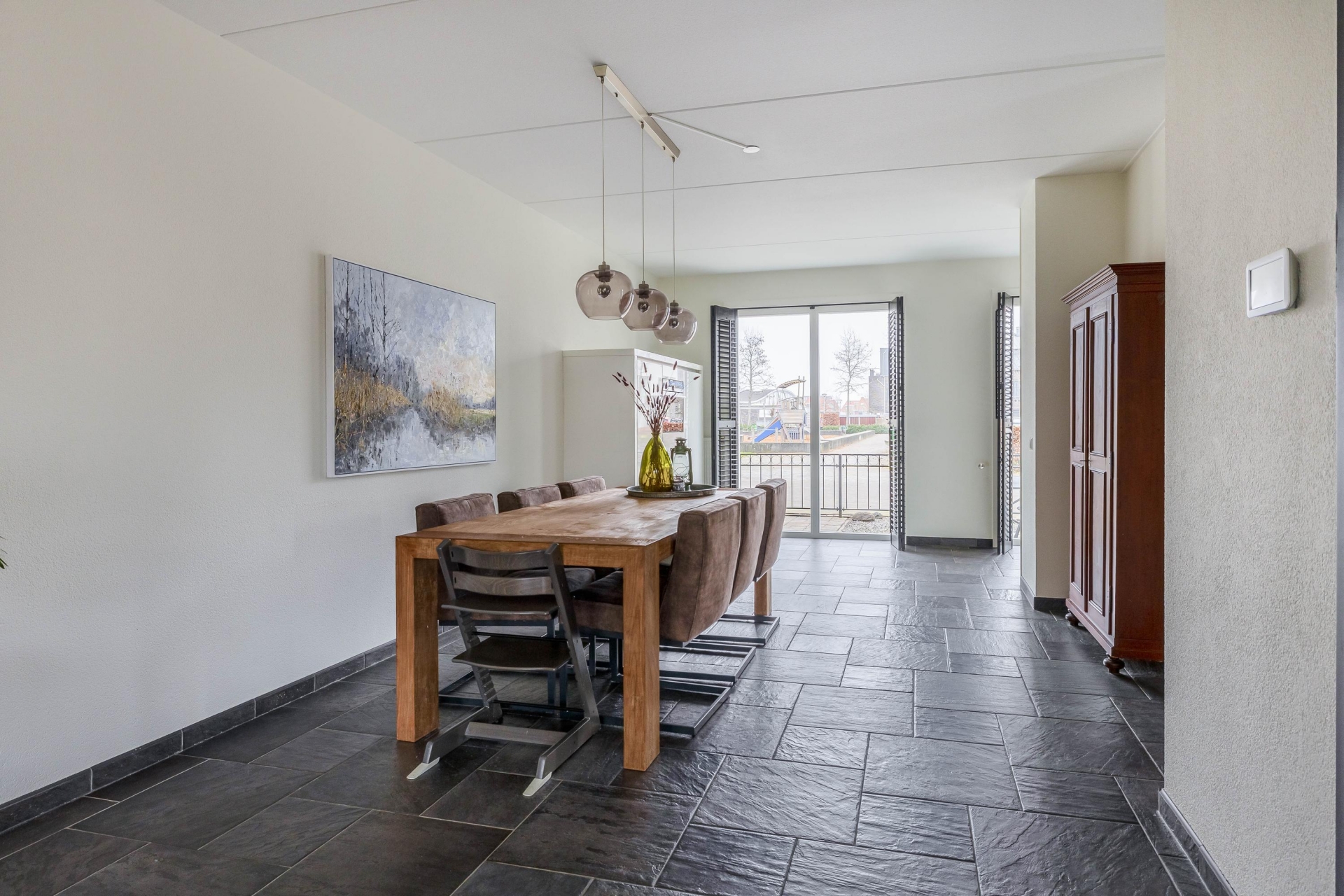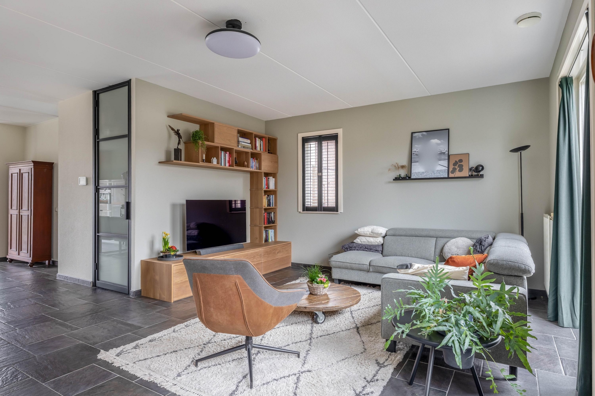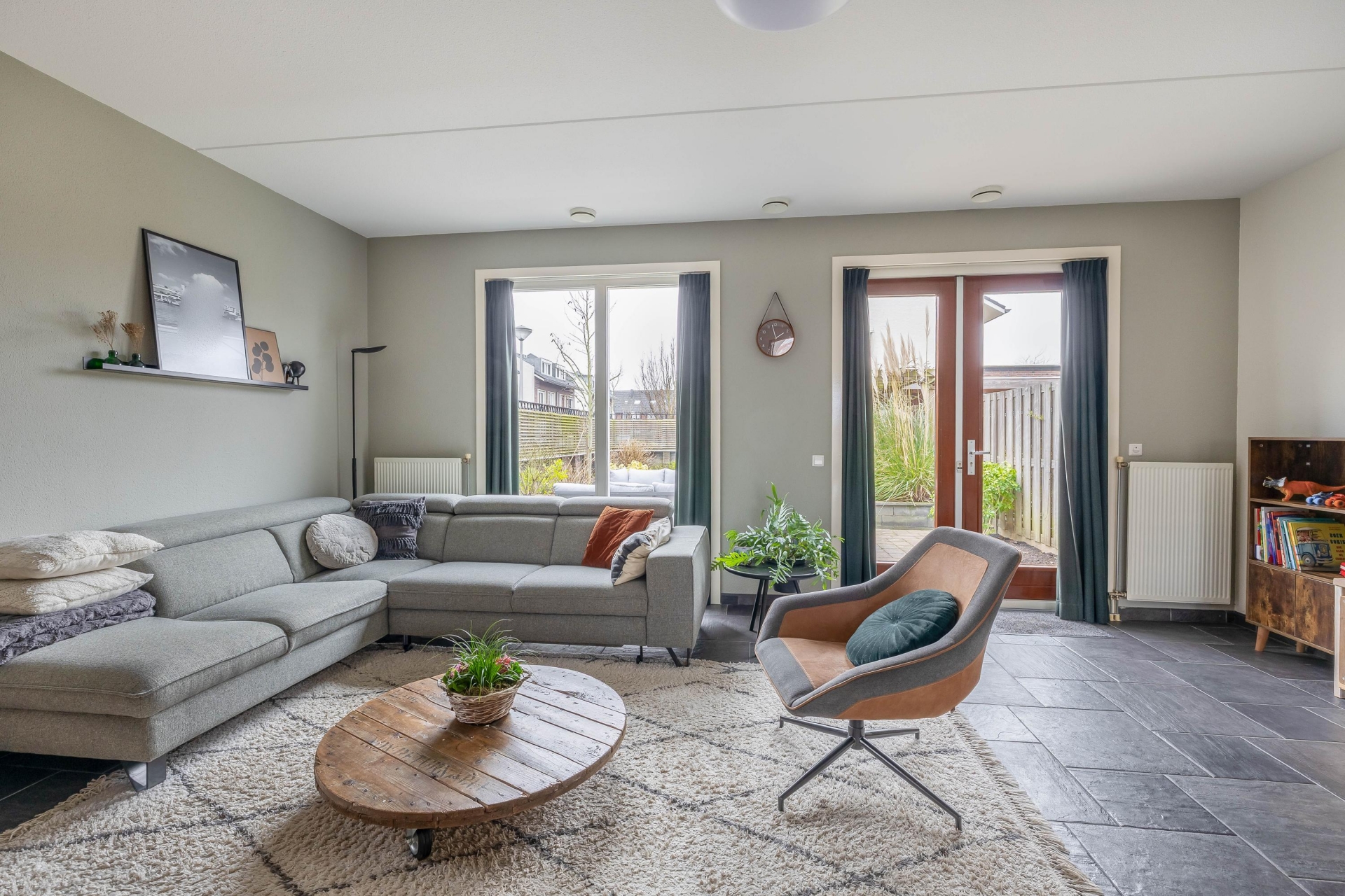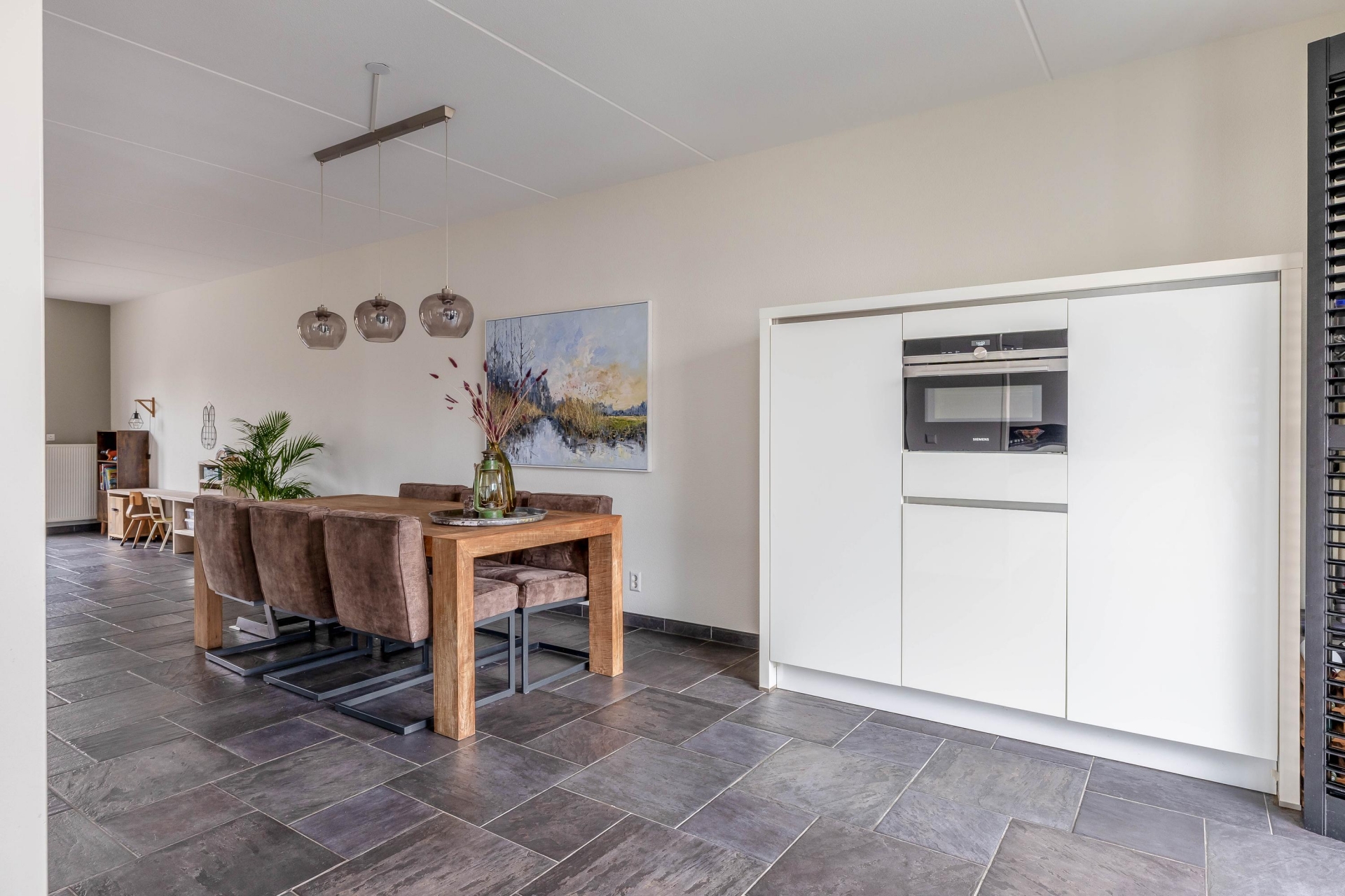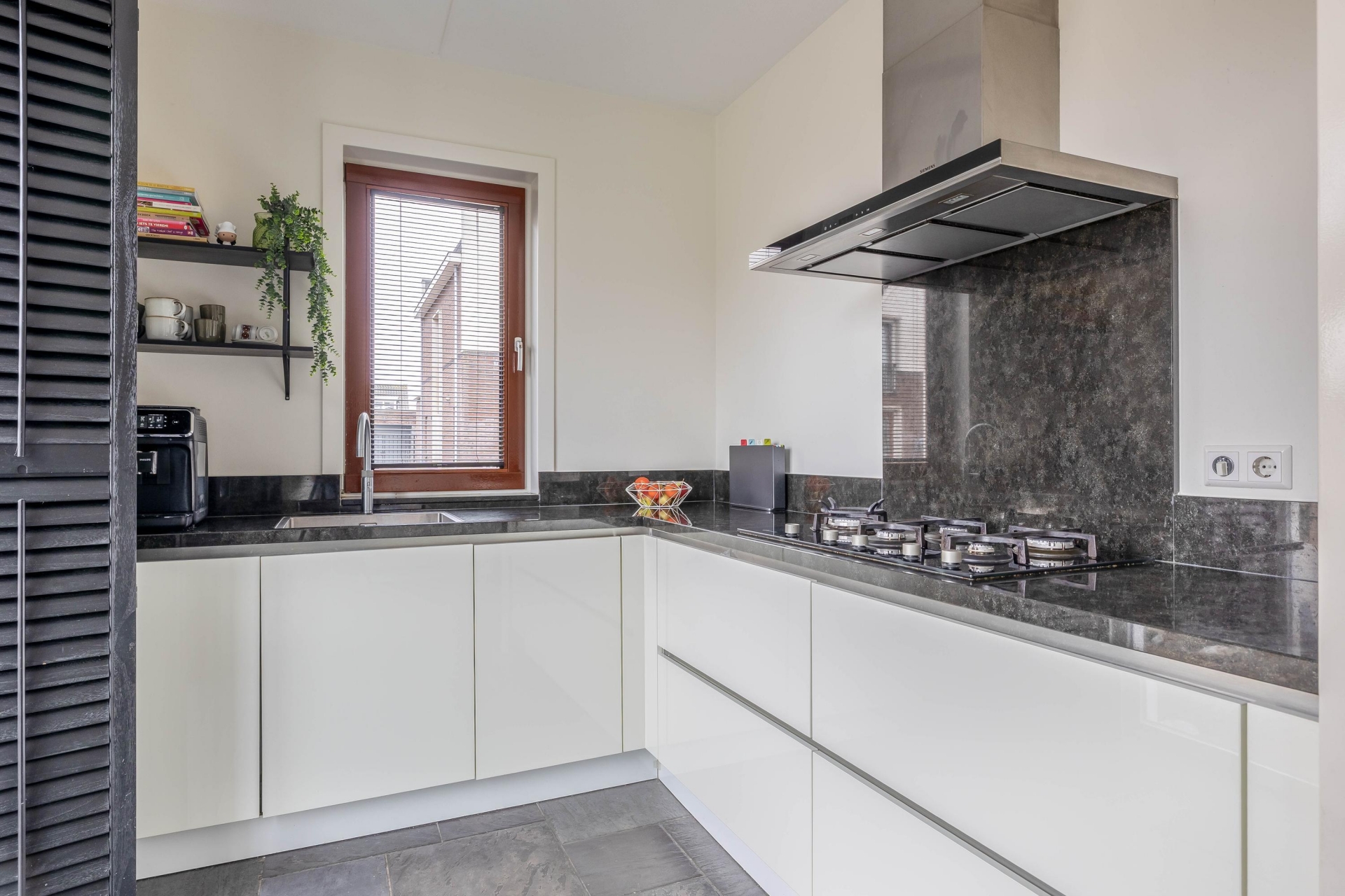 De woonkamer is breed opgezet en dankzij de grote raampartijen en openslaande deuren naar de tuin heerlijk licht. De tegelvloer in combinatie met strakke wandafwerking geeft het geheel een moderne en rustige uitstraling. Er is volop plek voor een grote hoekbank én een royale eettafel waar je met het hele gezin of met vrienden kunt zitten. Aan de voorzijde bevindt zich de keuken in praktische L-opstelling. De keuken is strak uitgevoerd met lichte fronten, een donker werkblad en diverse inbouwapparatuur. Vanuit het raam kijk je vrij naar buiten, wat zorgt voor extra daglicht tijdens het koken. De opstelling is overzichtelijk en biedt voldoende werk- en bergruimte voor een gezin dat graag kookt. De verbinding tussen keuken, eethoek en zithoek maakt dit echt een leefruimte waar alles samenkomt. Terwijl de kinderen aan tafel knutselen of huiswerk maken, houd jij vanuit de keuken of bank moeiteloos contact.