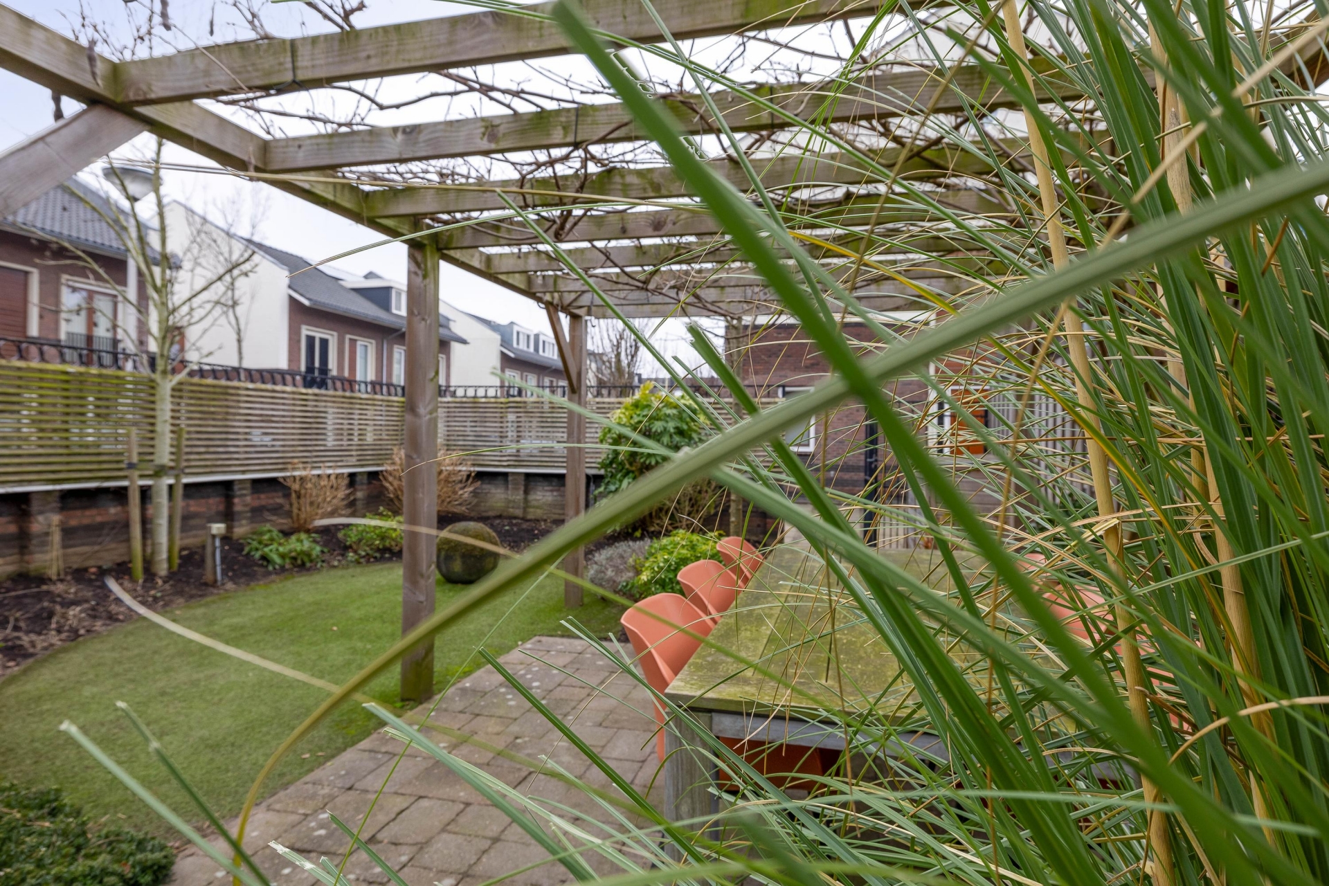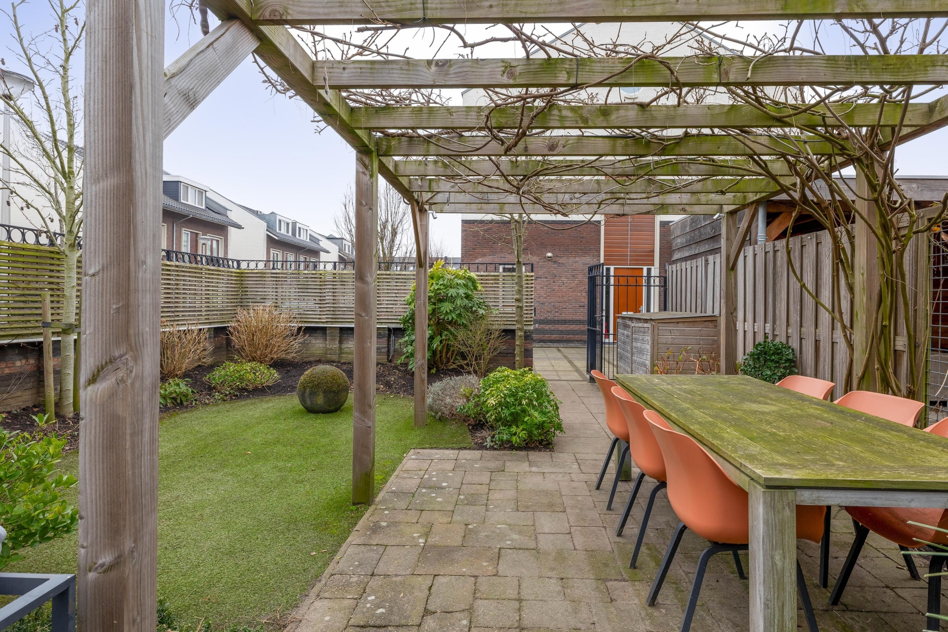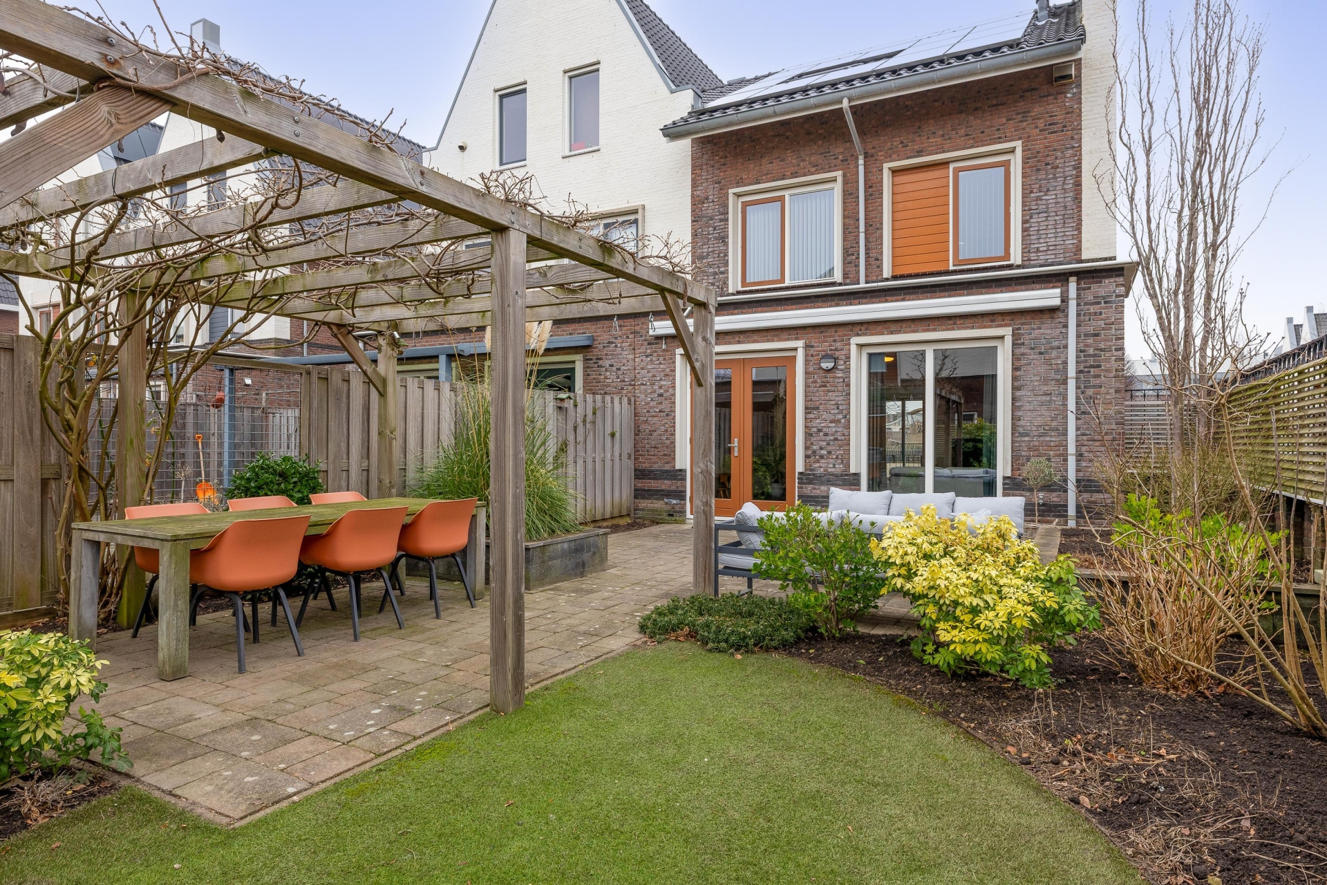 Via de openslaande deuren stap je zo de achtertuin in. En wat voor één. De tuin ligt op het zuidwesten, wat betekent: middag- en avondzon. Hier geniet je van lange zomeravonden onder de pergola, met een grote eettafel en voldoende ruimte voor een loungeset. Door de hoekligging voelt de tuin extra ruim aan. De combinatie van groen, bestrating en houten erfafscheiding zorgt voor een prettige balans tussen onderhoudsvriendelijk en sfeervol. Er is ruimte genoeg voor spelende kinderen, een trampoline of een zwembadje in de zomer. Achterin vind je de garage, ideaal voor fietsen, opslag of als hobbyruimte. In combinatie met de oprit heb je hier echt een praktische meerwaarde ten opzichte van veel andere huizen in de omgeving.