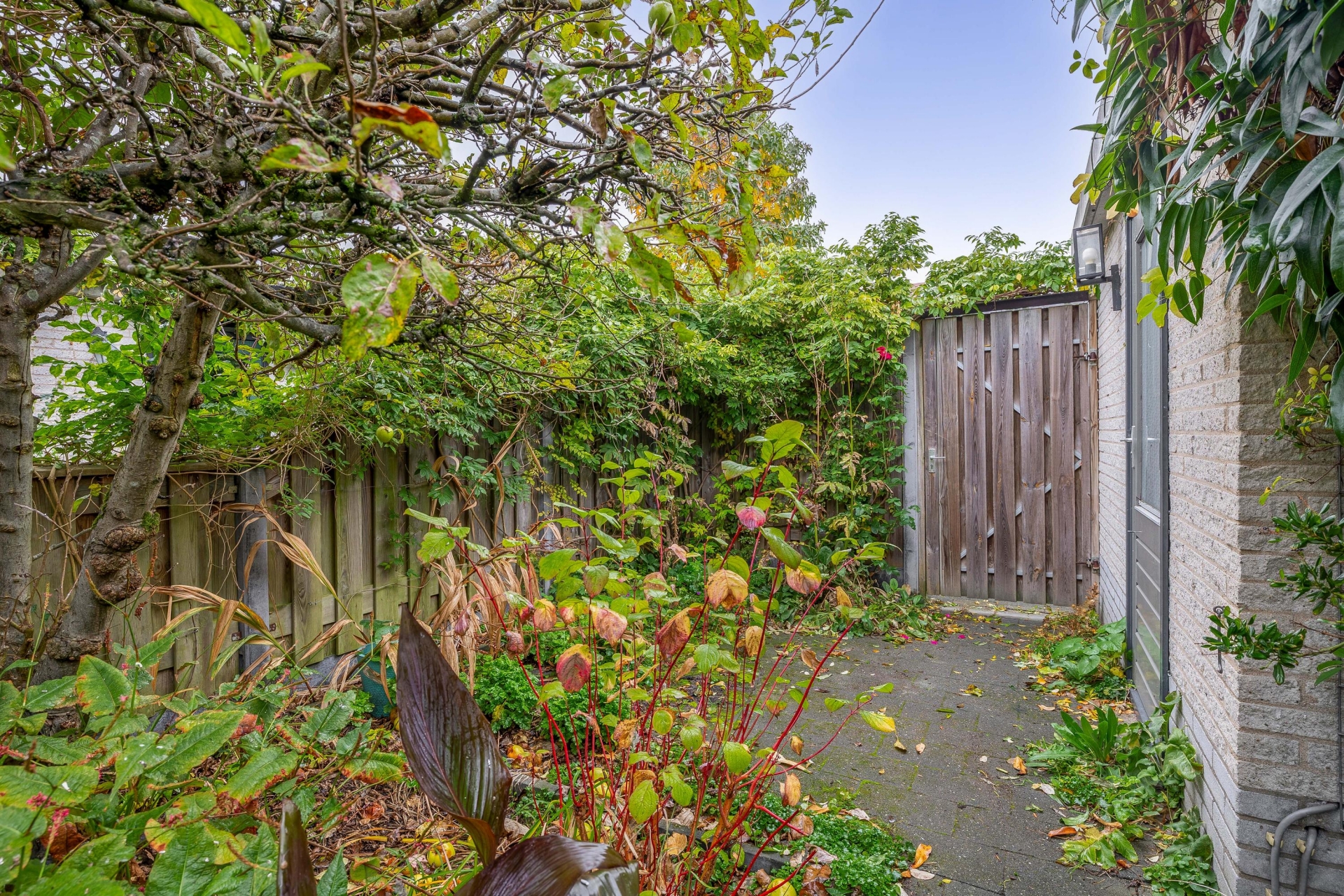 Via de achterdeur kom je in de fijne tuin met stenen berging.