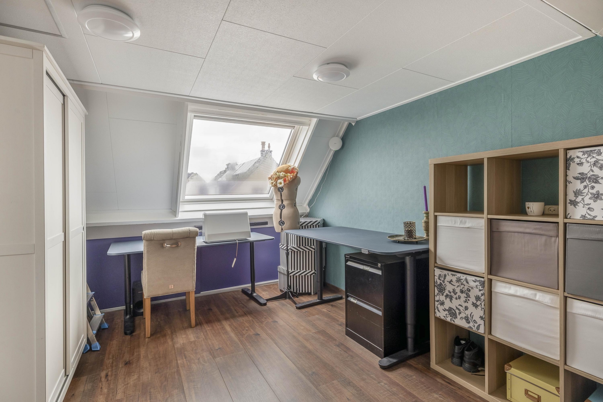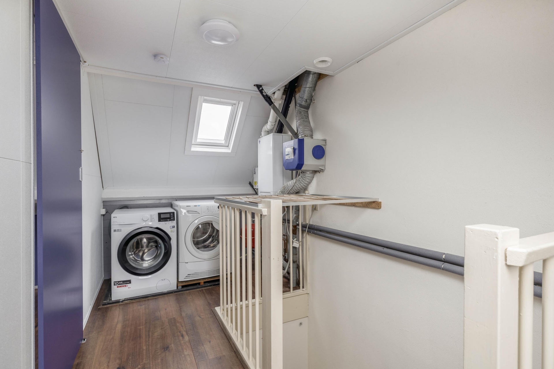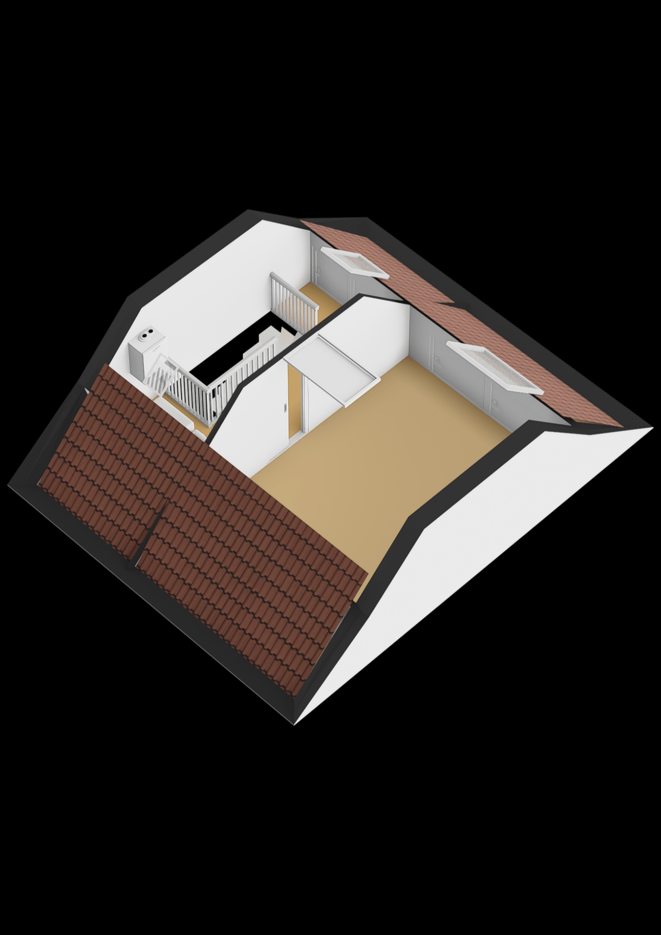 De tweede verdieping is met een vaste trap bereikbaar en biedt een royale vierde slaapkamer, ideaal als master bedroom, werkruimte of hobbykamer. Ook is er een ruime voorzolder waar de wasmachine en droger zijn aangesloten, en extra bergruimte achter de knieschotten. Een dakraam zorgt hier voor prettig daglicht.