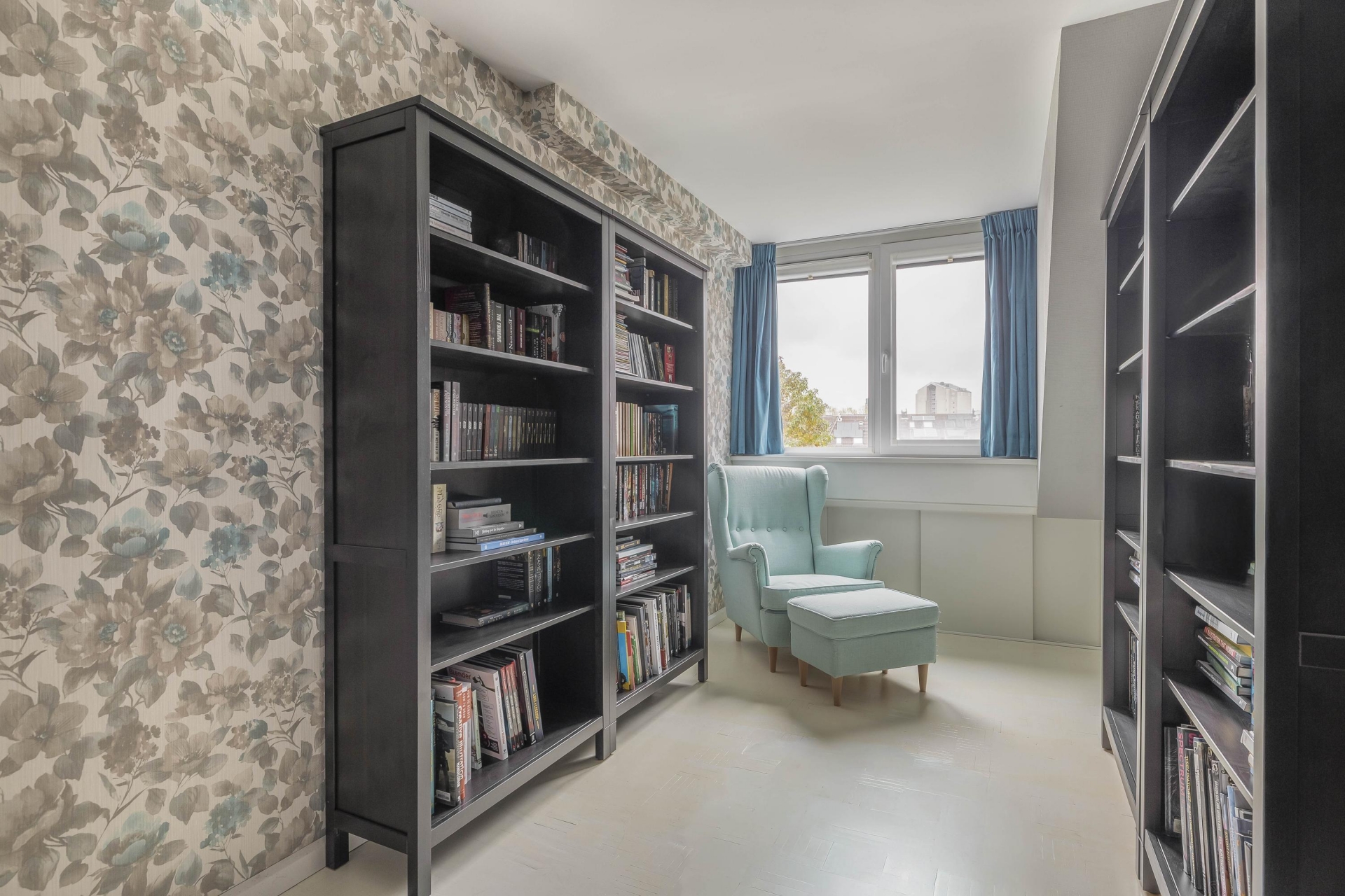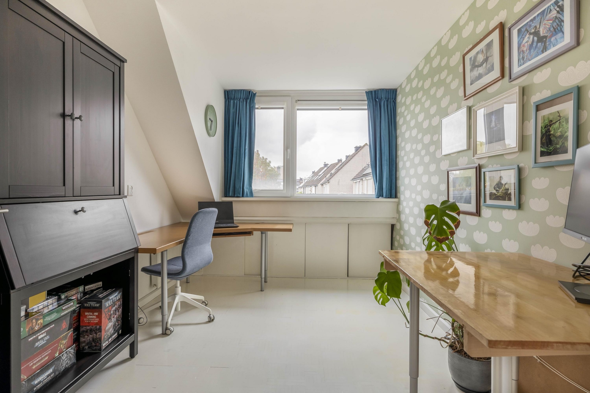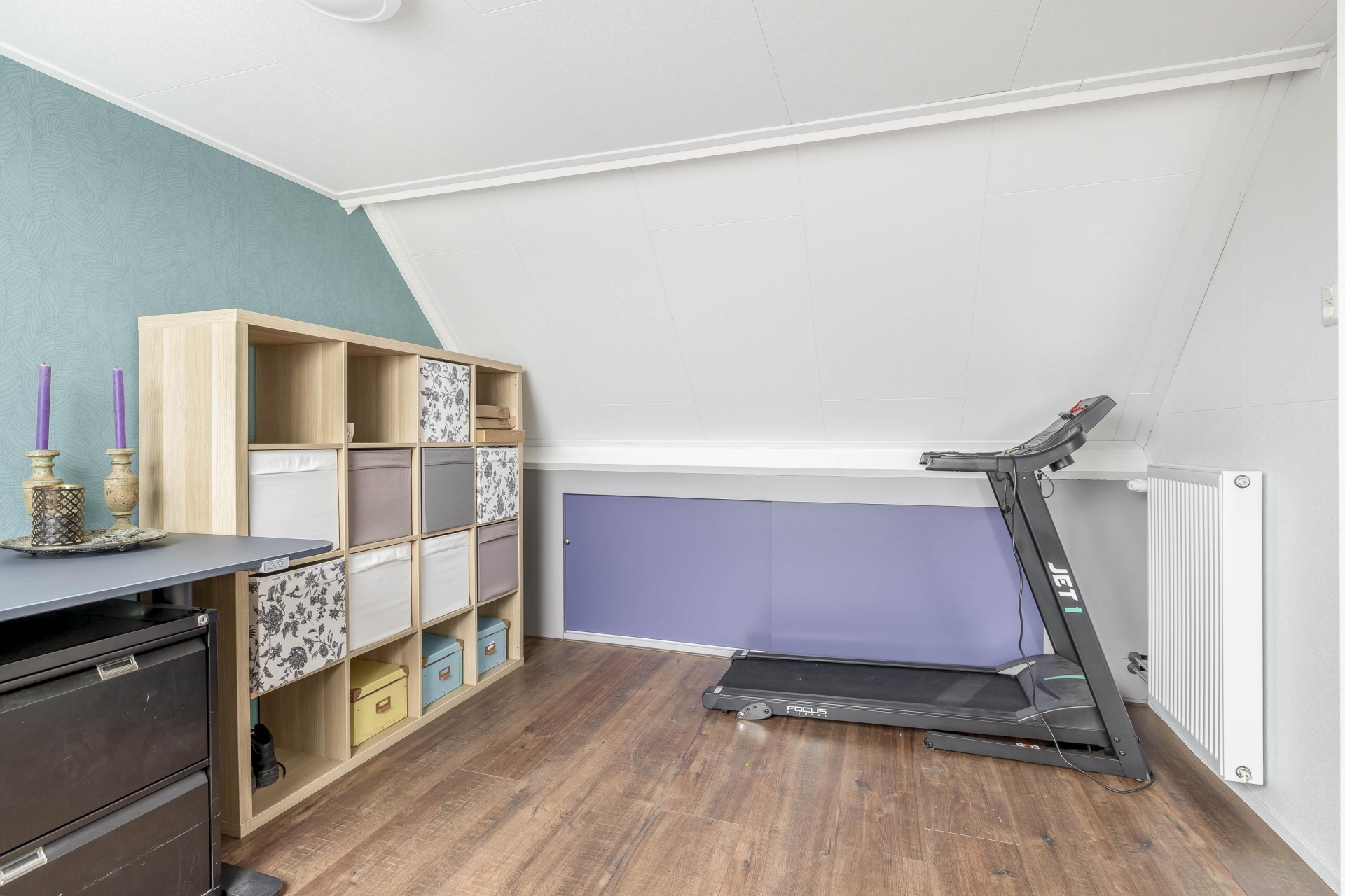 De tweede verdieping is met een vaste trap bereikbaar en biedt een royale vierde slaapkamer, ideaal als master bedroom, werkruimte of hobbykamer. Ook is er een ruime voorzolder waar de wasmachine en droger zijn aangesloten, en extra bergruimte achter de knieschotten. Een dakraam zorgt hier voor prettig daglicht.