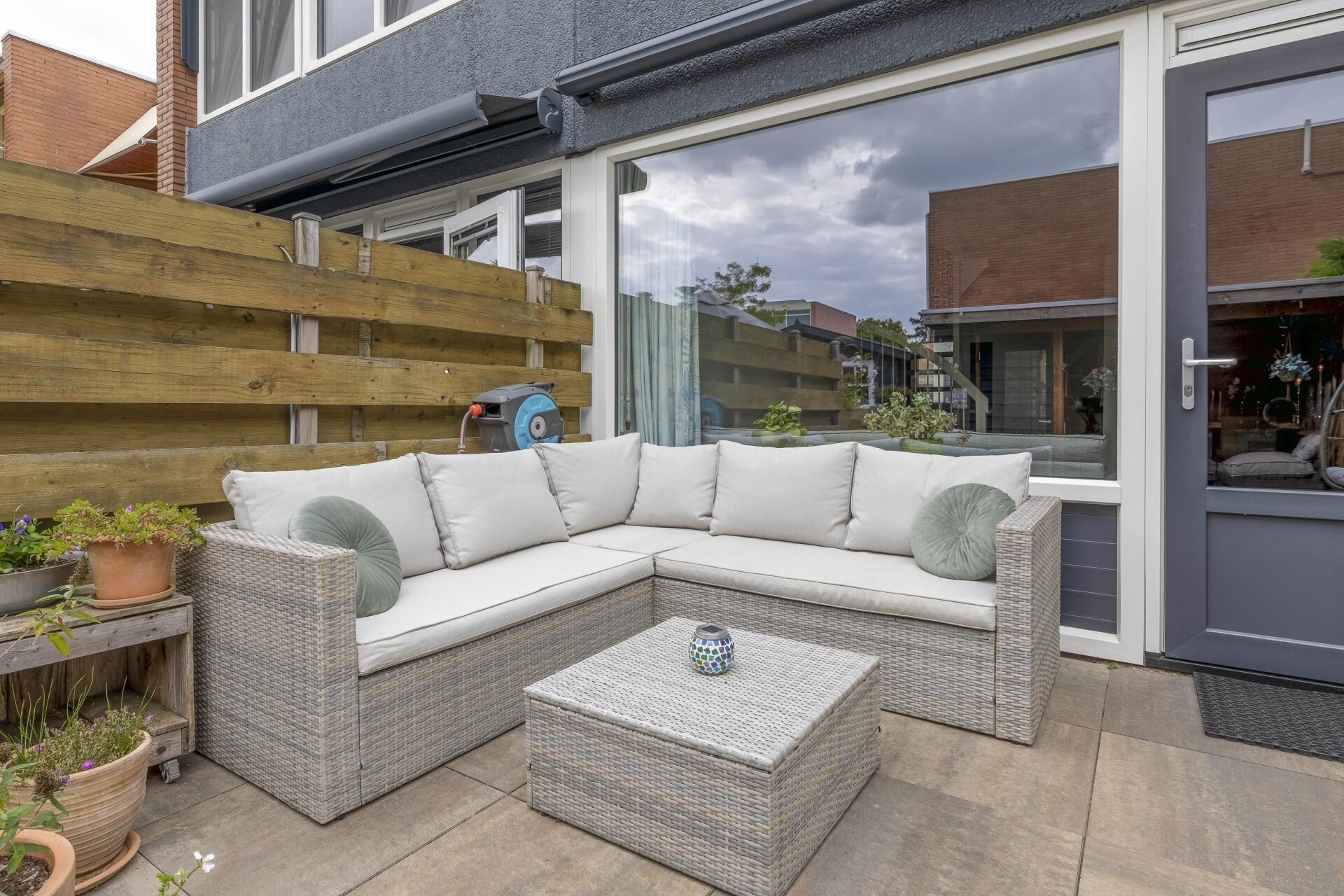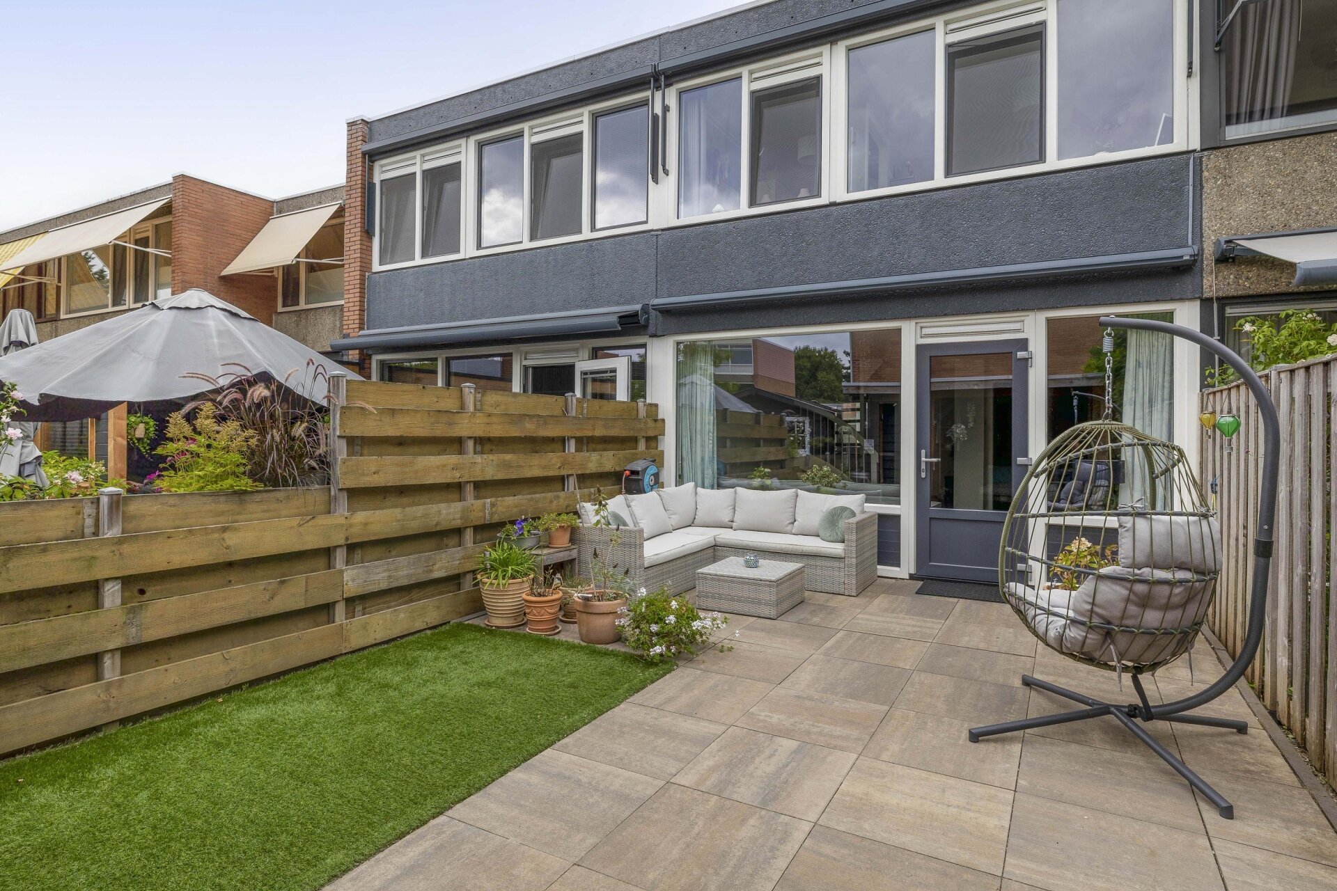 De tuin achter de woning maakt het plaatje compleet. Deze is zonnig gelegen op het zuiden en beschikt over een sfeervolle overkapping. Hierdoor kan er ook met minder weer van de tuin genoten worden. Verder is er nog een zonnescherm, buitenkraan, een berging en een achterom aanwezig.