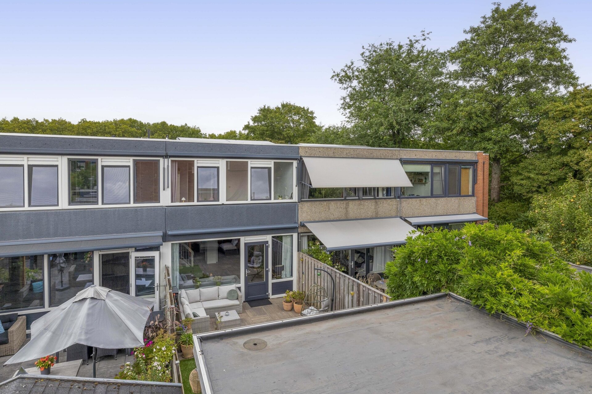 - 2 zonneschermen (elektrische bediening) aan de achterzijde van het huis op de begane grond +
