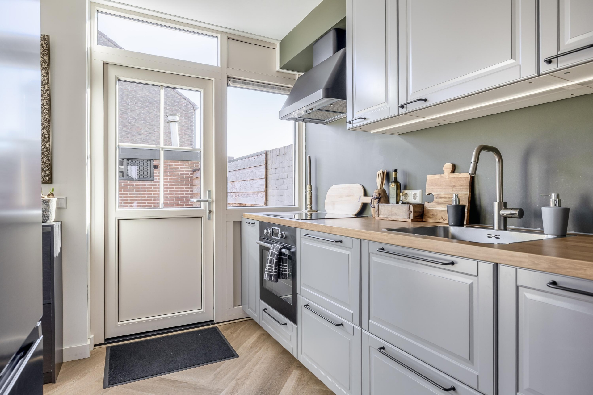 De keuken biedt genoeg opbergruimte in de onder- en bovenkasten en er is plek voor alle dagelijkse apparatuur. Een mooi detail is de glazen deur richting de hal, die zorgt voor een open gevoel terwijl de ruimtes toch gescheiden blijven. Ook hier zie je dat er aandacht is besteed aan de afwerking en uitstraling van het huis.