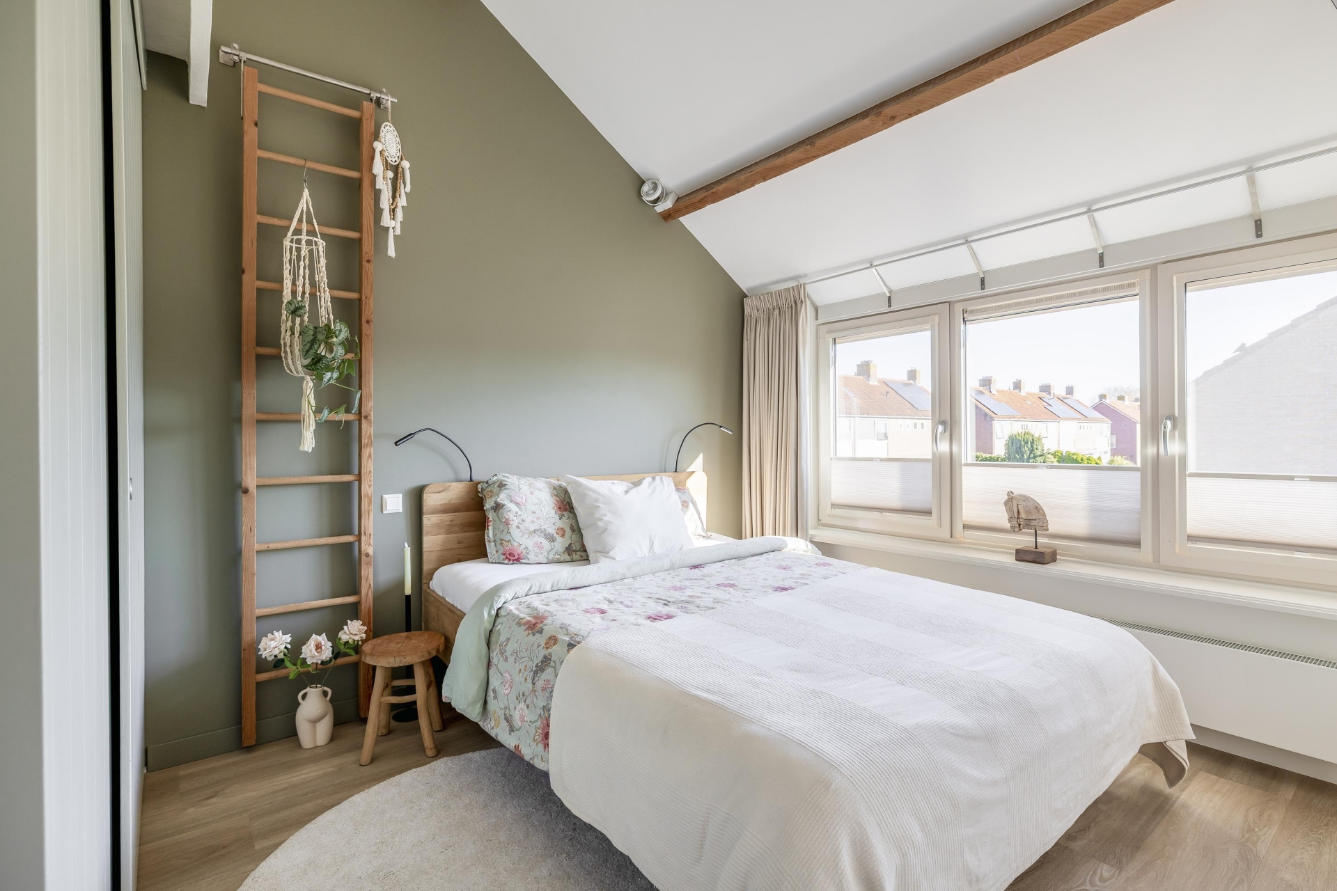 Op de verdieping bevinden zich drie slaapkamers. De grootste slaapkamer biedt volop ruimte voor een tweepersoonsbed en heeft een inbouwkast. Dankzij de ramen is ook hier weer veel daglicht aanwezig, wat zorgt voor een fijne en rustige sfeer.