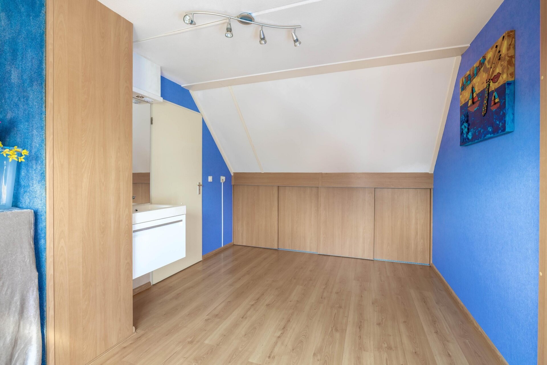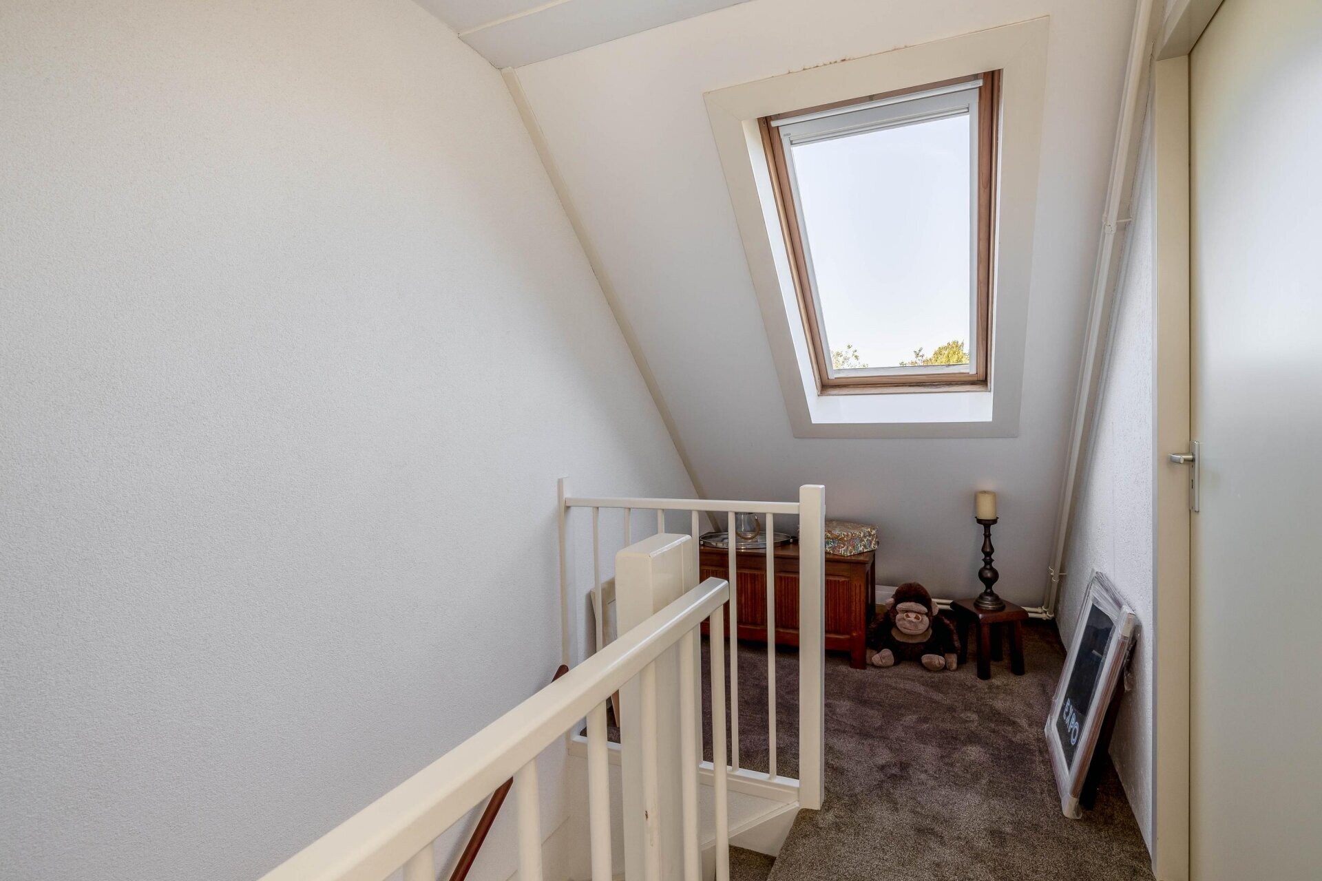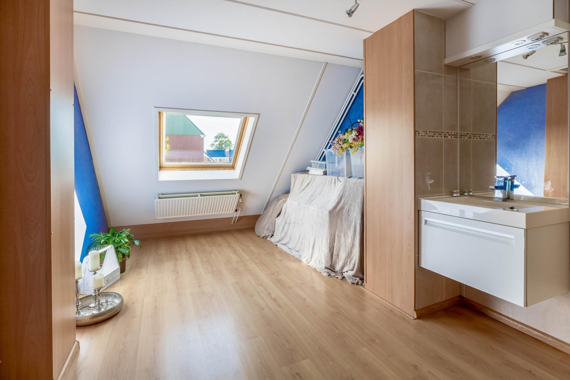 Op de voorzolder, voorzien van 2 dakramen vind je de wasmachine-opstelplaats, handig verhoogd geplaatst. Daarnaast bevindt zich hier een ruime slaapkamer, eveneens voorzien van een dakraam, een eigen wastafelmeubel en achter de knieschotten is veel bergruimte.