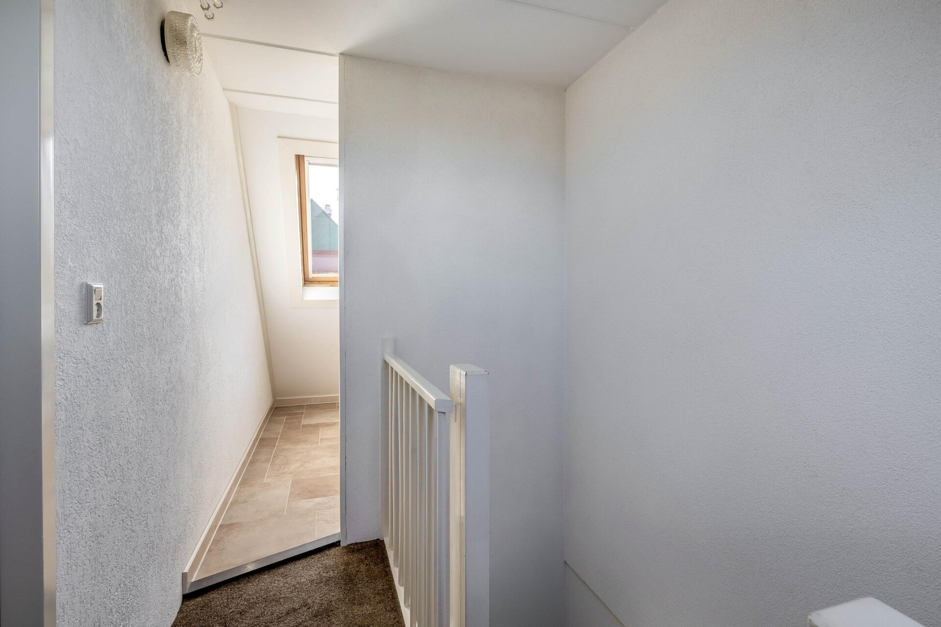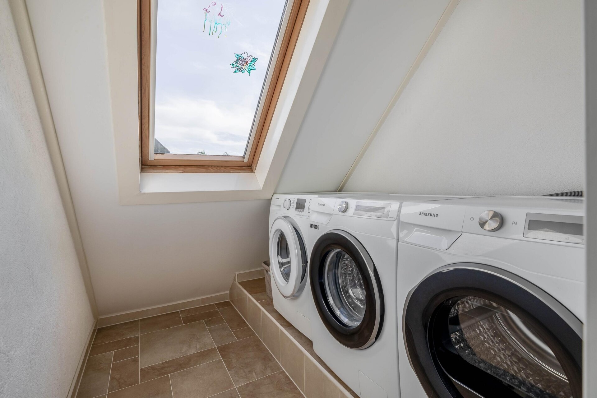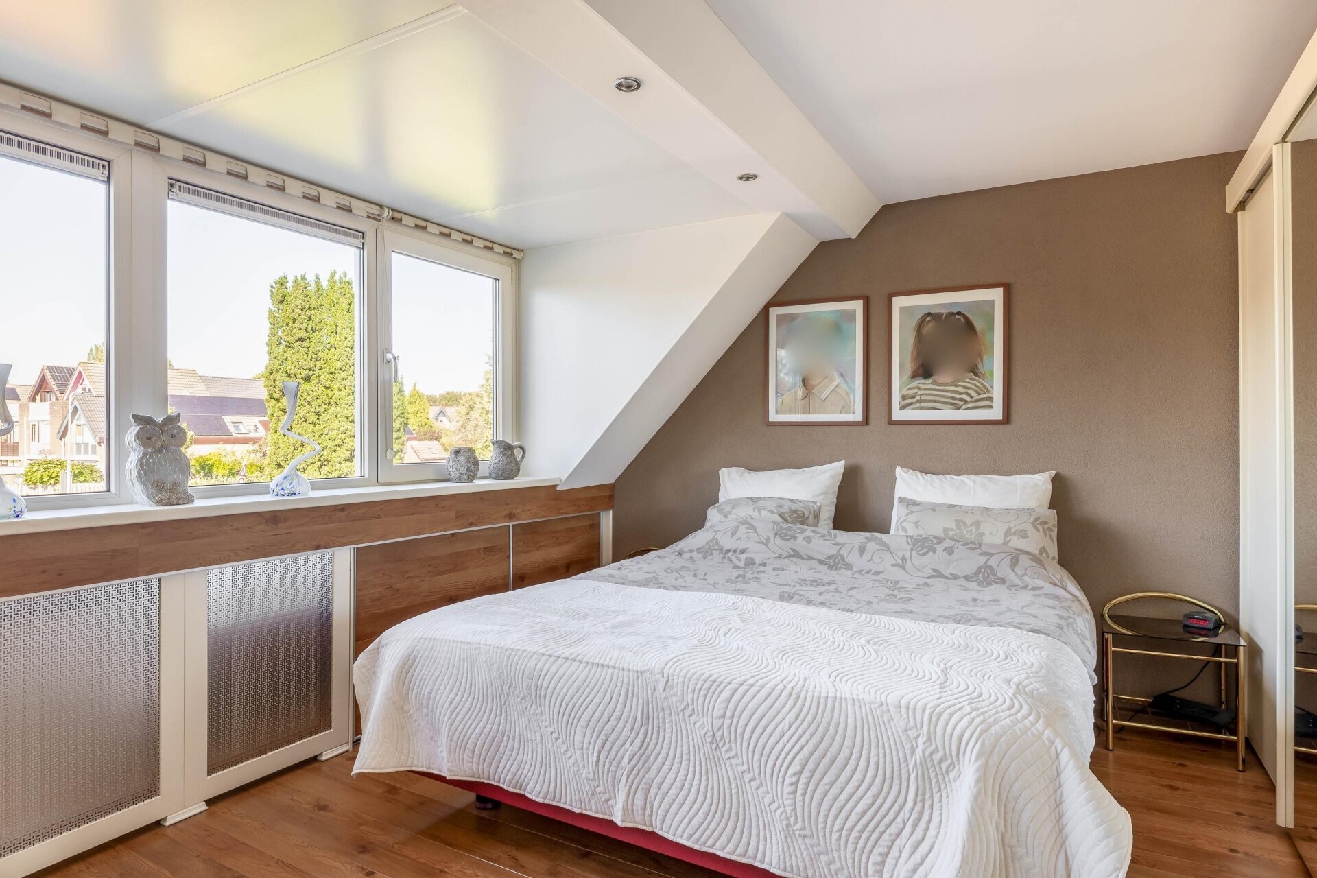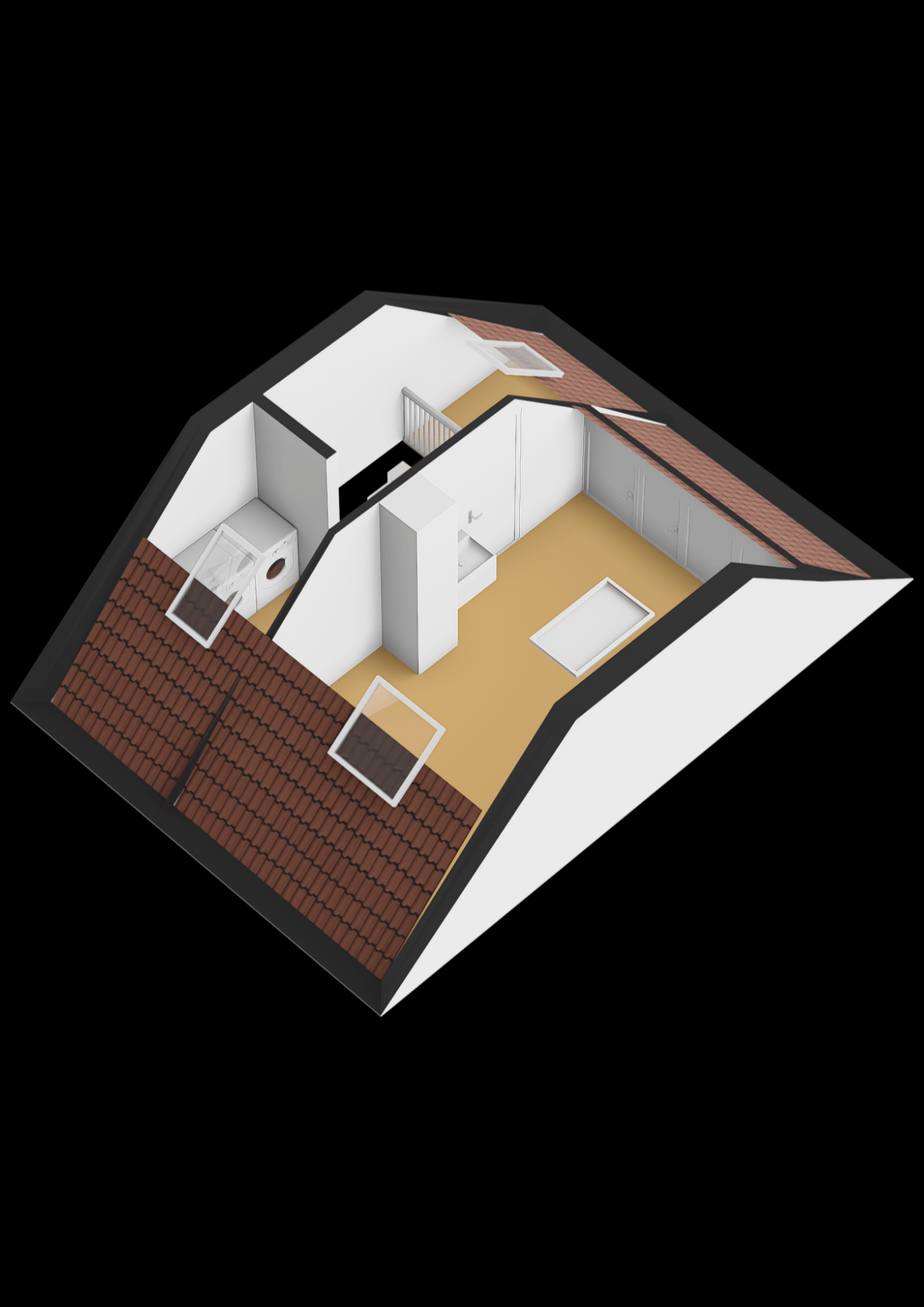 Op de voorzolder, voorzien van 2 dakramen vind je de wasmachine-opstelplaats, handig verhoogd geplaatst. Daarnaast bevindt zich hier een ruime slaapkamer, eveneens voorzien van een dakraam, een eigen wastafelmeubel en achter de knieschotten is veel bergruimte.