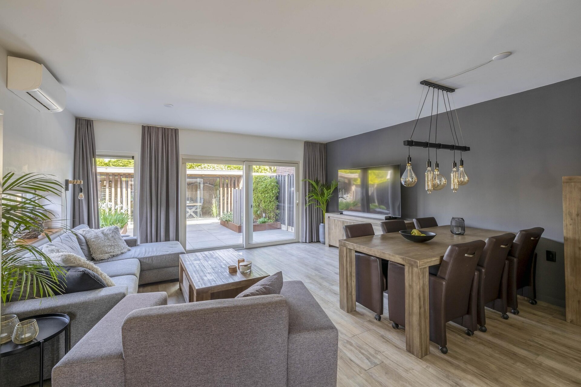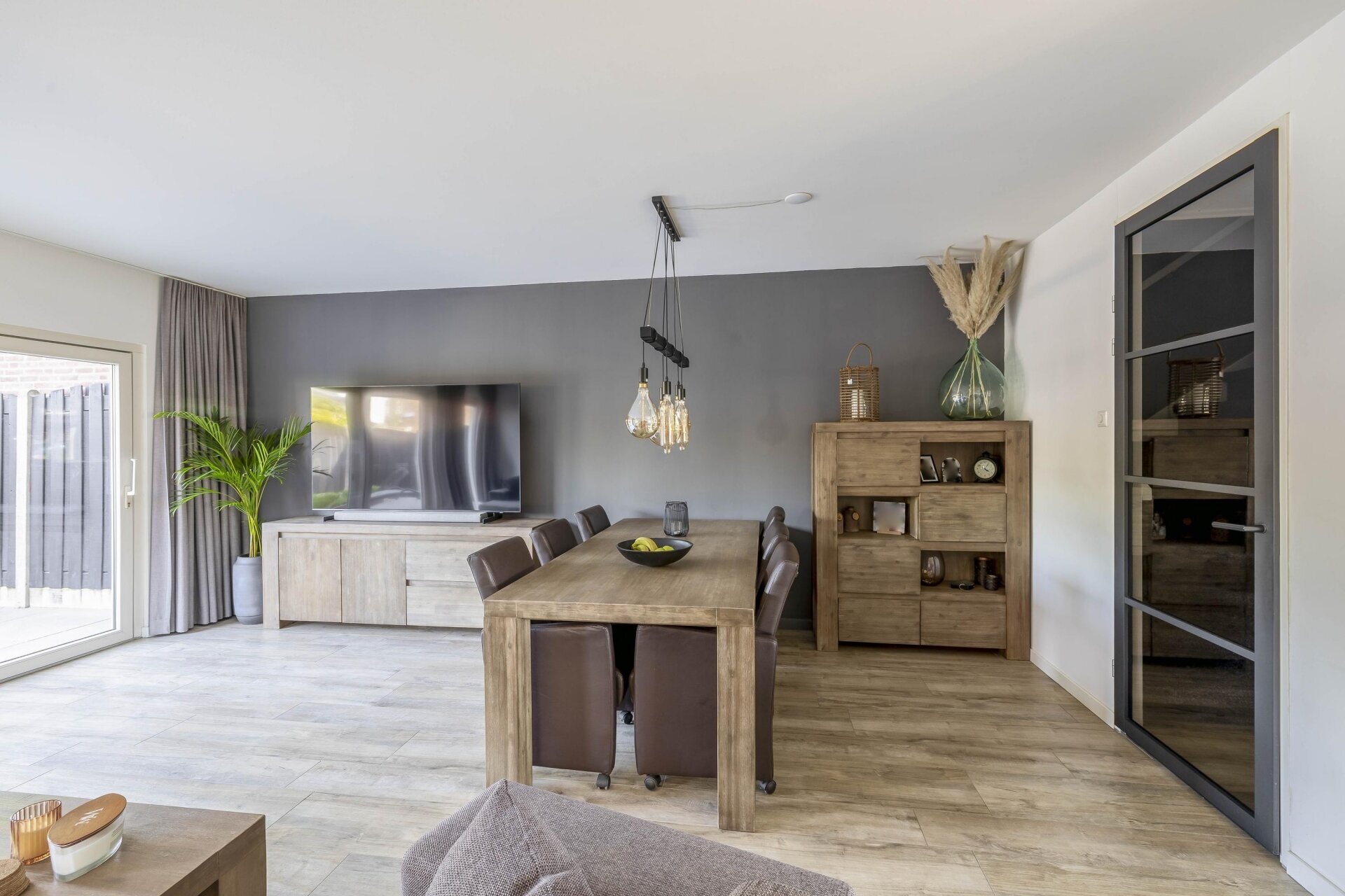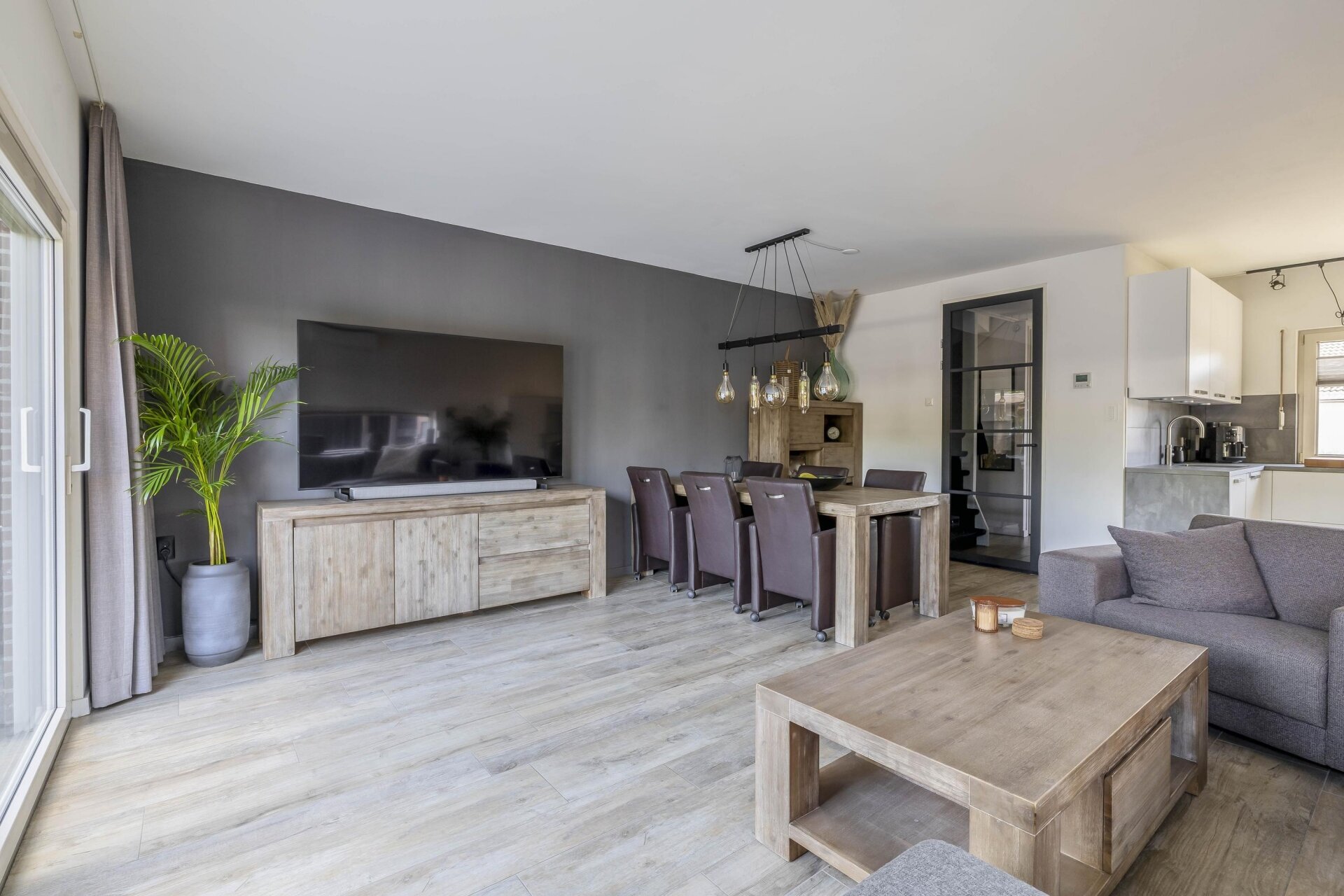 De woonkamer is tuingericht en valt op door het vele daglicht. Dankzij de grote schuifpui naar het terras loopt binnen naadloos over in buiten. De ruimte is ruim genoeg voor zowel een grote zithoek als een royale eettafel, en heeft een sfeervolle uitstraling door de combinatie van een houten vloerlook en rustige kleurstelling.
